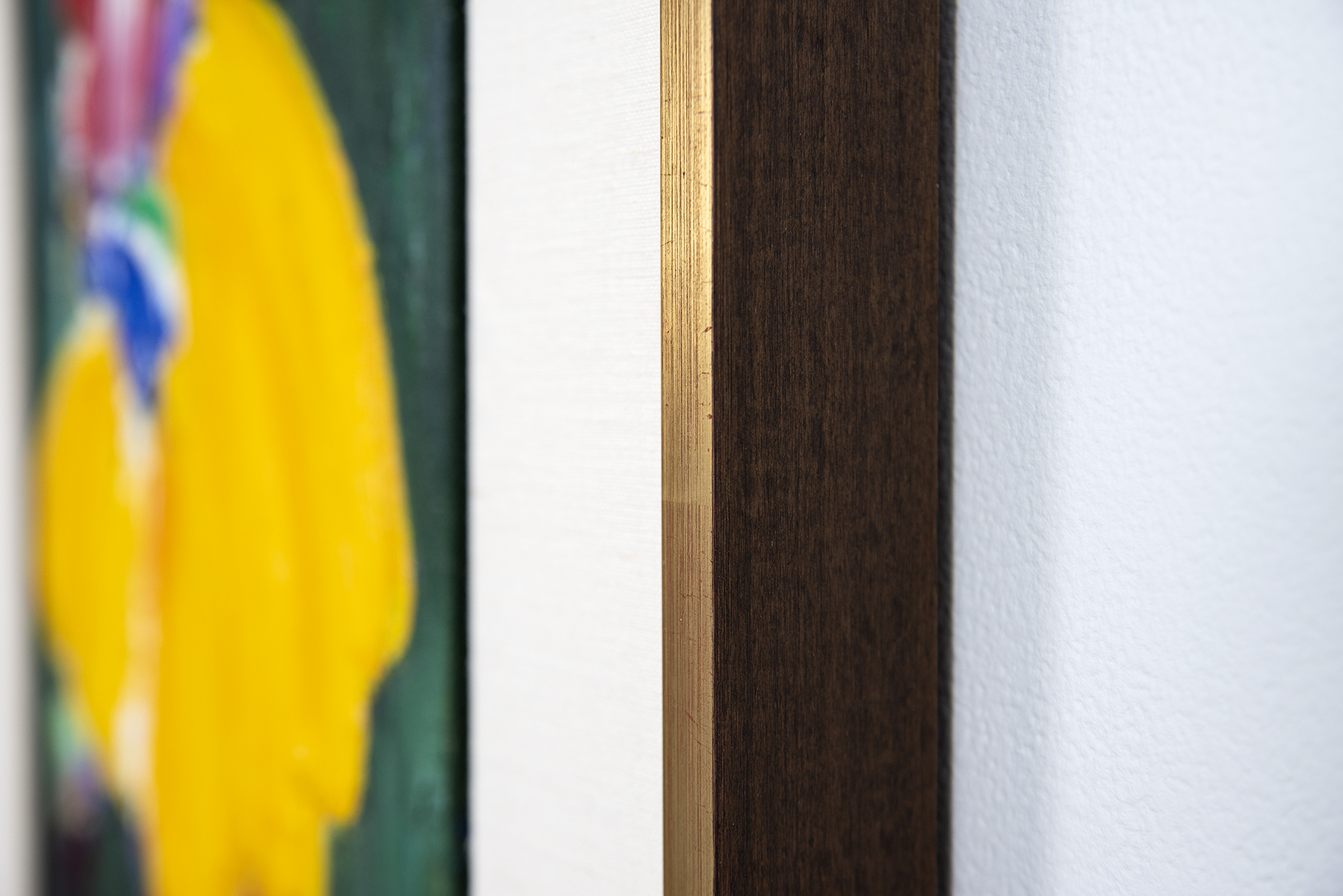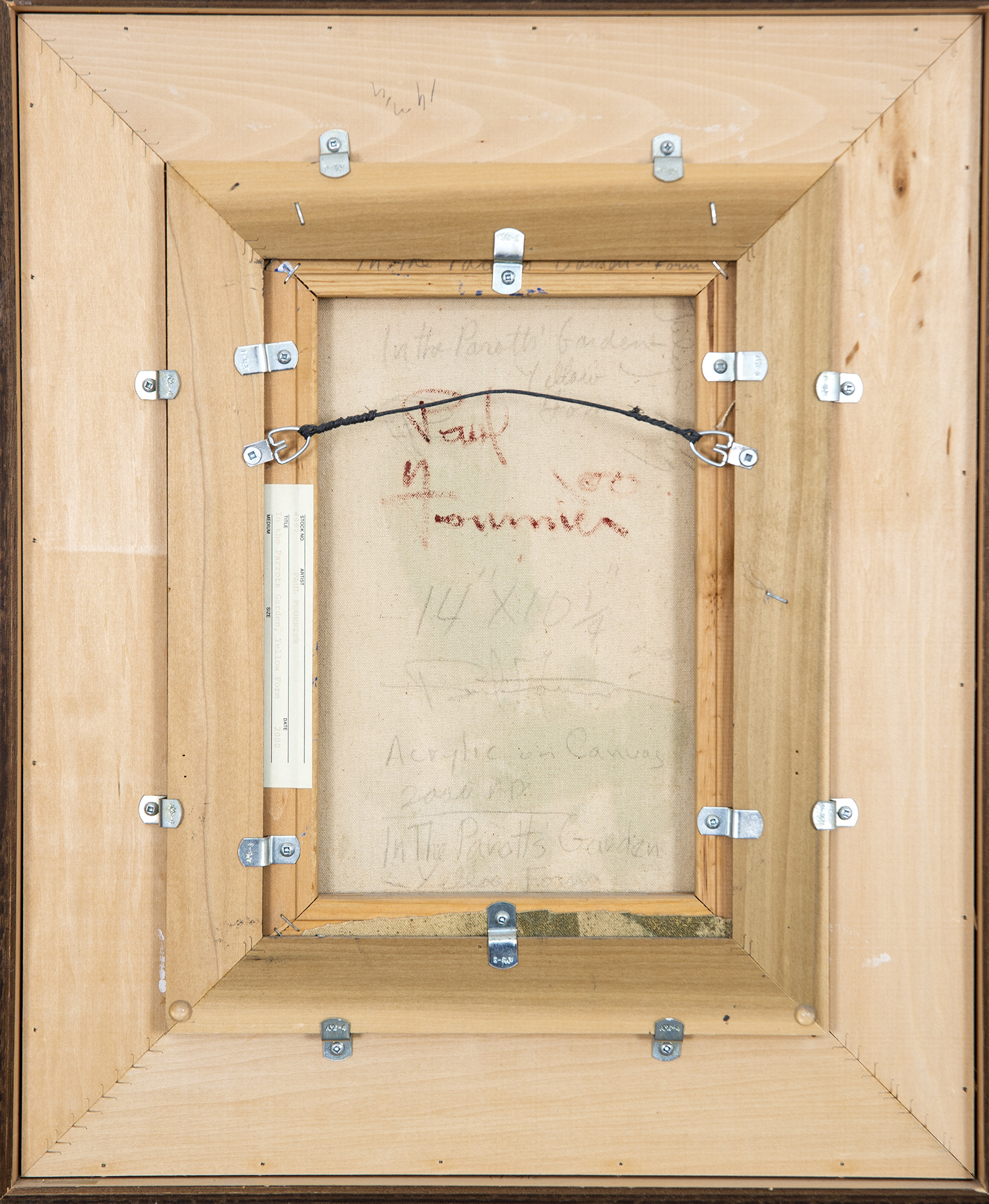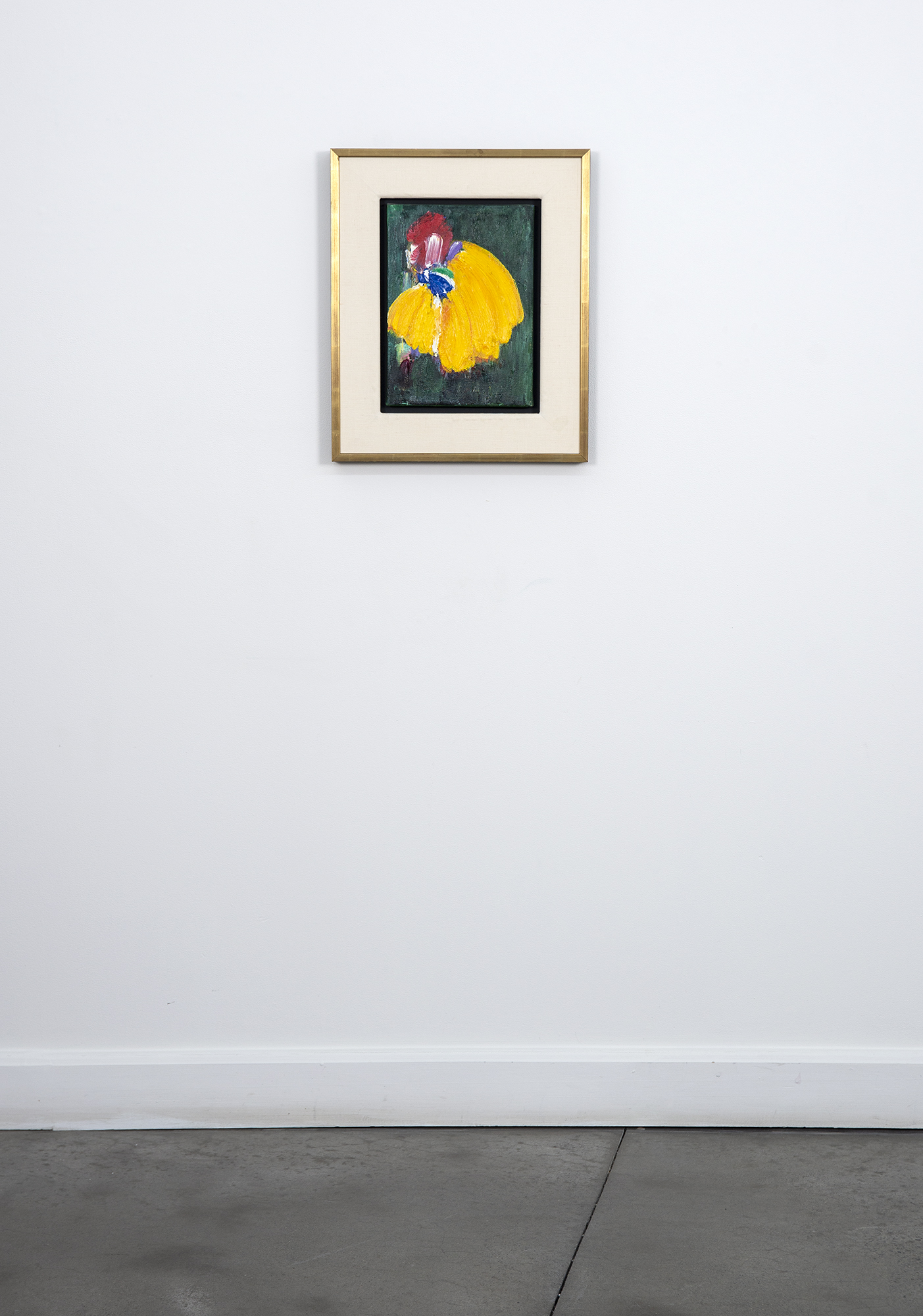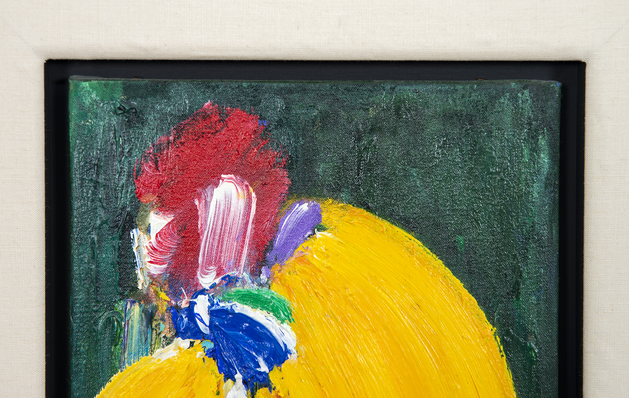 The viewer’s eye is drawn to this lush, colourful painting by a ‘plume’ of bright yellow and orange that pops against the rich green backdrop. Expressive brushstrokes of deep blue, light green, purple, pink and white ‘crown’ the yellow form. Fournier spent some time in the Caribbean, and the saturated colours of the tropics are referenced in much of his work.