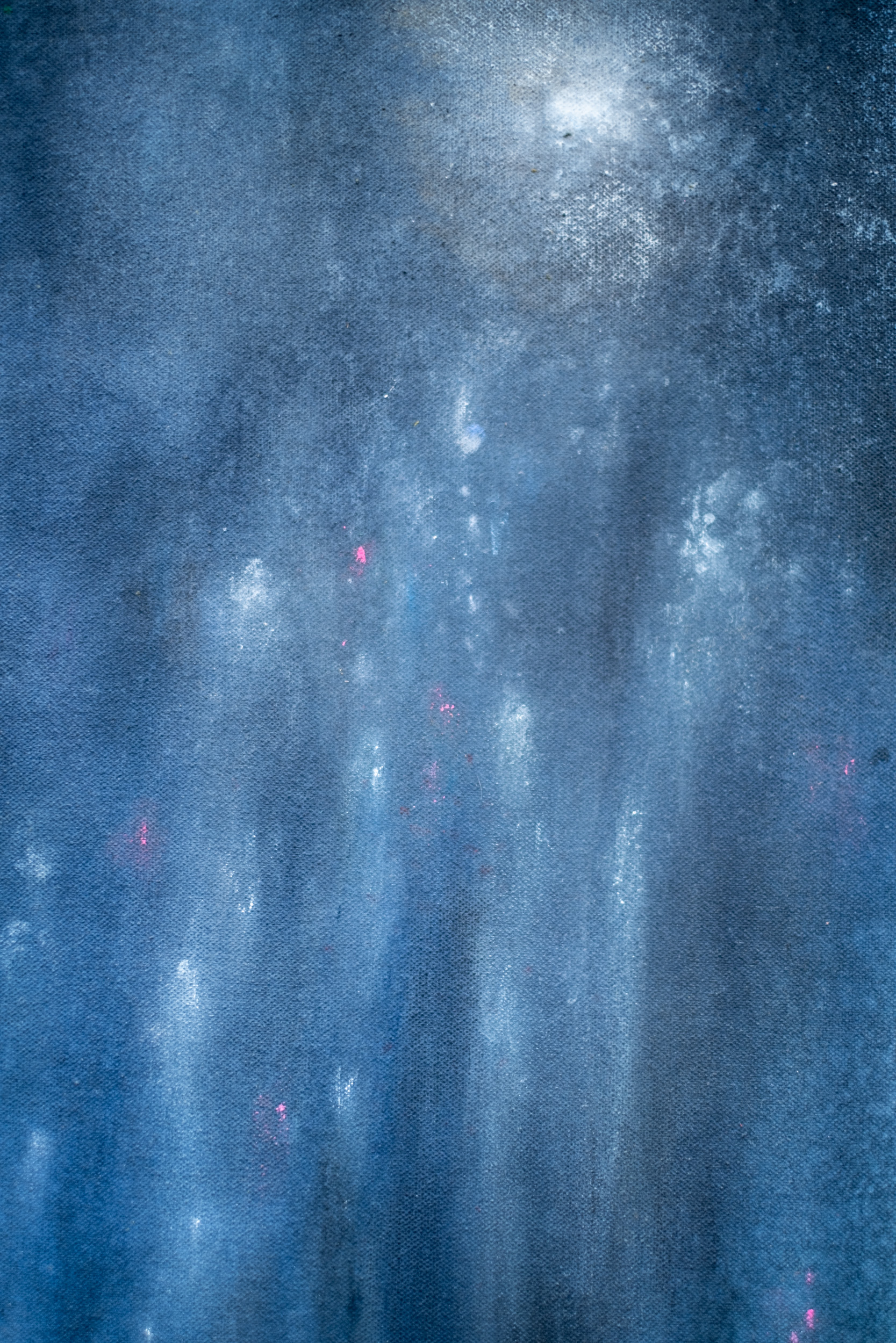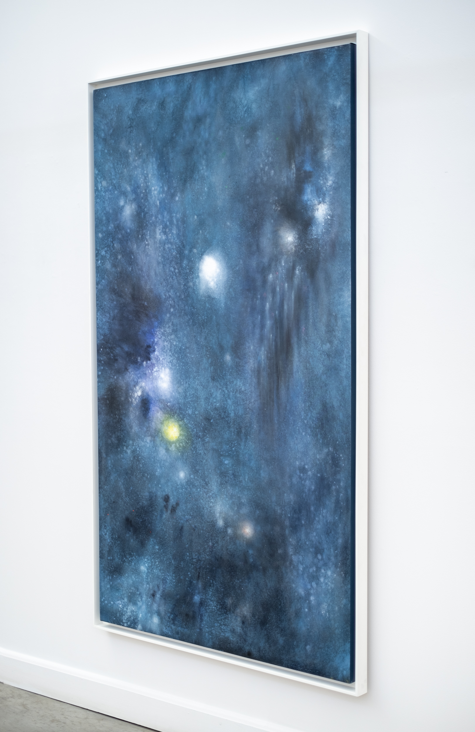 This contemporary abstract painting by Paul Fournier captures the night sky.With a career spanning more than six decades, Paul Fournier has established himself as one of Canada’s most significant abstract artists. His lyrical expressive form is perennially inspired by nature and is a result of his habit of ‘drawing with a paintbrush.’ A masterful colorist, Fournier tends to favour the brightly colored Fauvist palette of French artists like Matisse. This large painting signals a departure from hot colors and imagines the night sky in appropriately darker, cooler hues of deep blues and black illuminated by bright white and yellow.