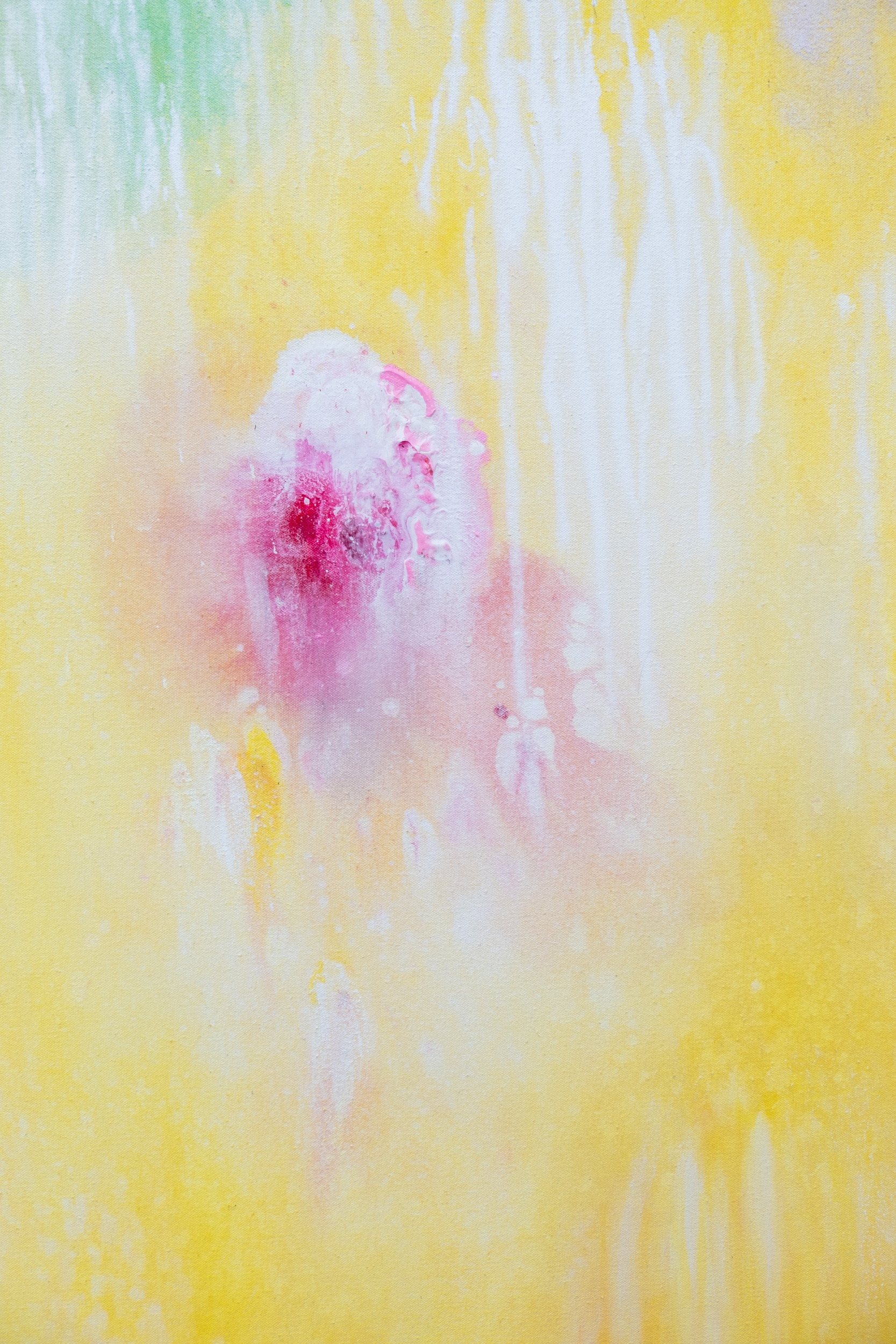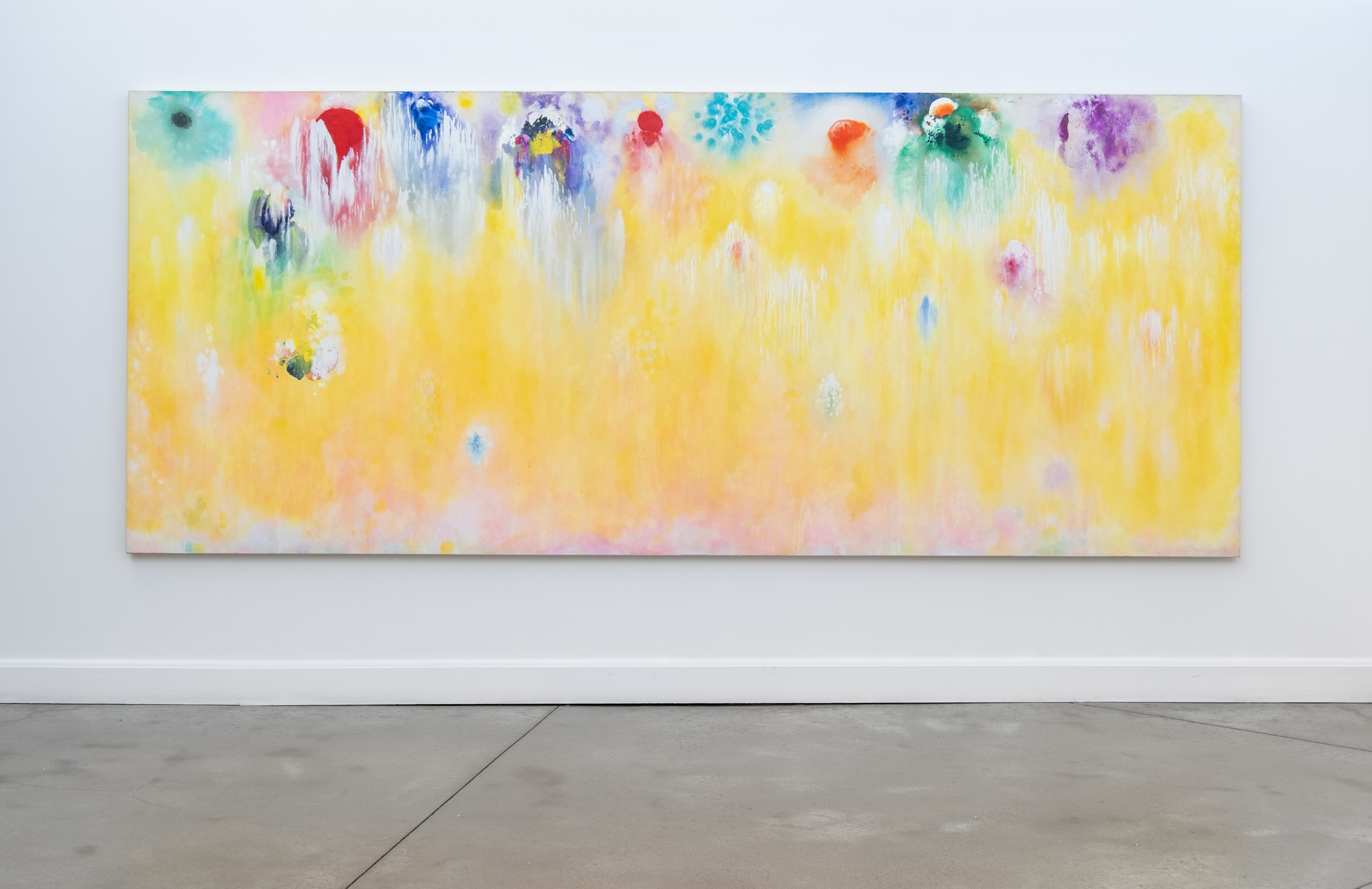 This expressive abstract painting is Paul Fournier’s vision of spring colors.For more than six decades Canadian artist, Paul Fournier investigated the potential of color and expressive abstract form to create his own unique visual language. Fournier’s powerful presence in the Canadian art scene elevated him to the status of one of the greats. Always inspired by the beauty of the natural world, this joyful piece is rendered in brilliant colors reminiscent of the riot of color that first appears in spring. Purple, blue, pink, yellow, white, red and orange cascade down the canvas against a bright green background. Fournier’s signature use of extensive mark-making and drips adds both texture and movement to his work.