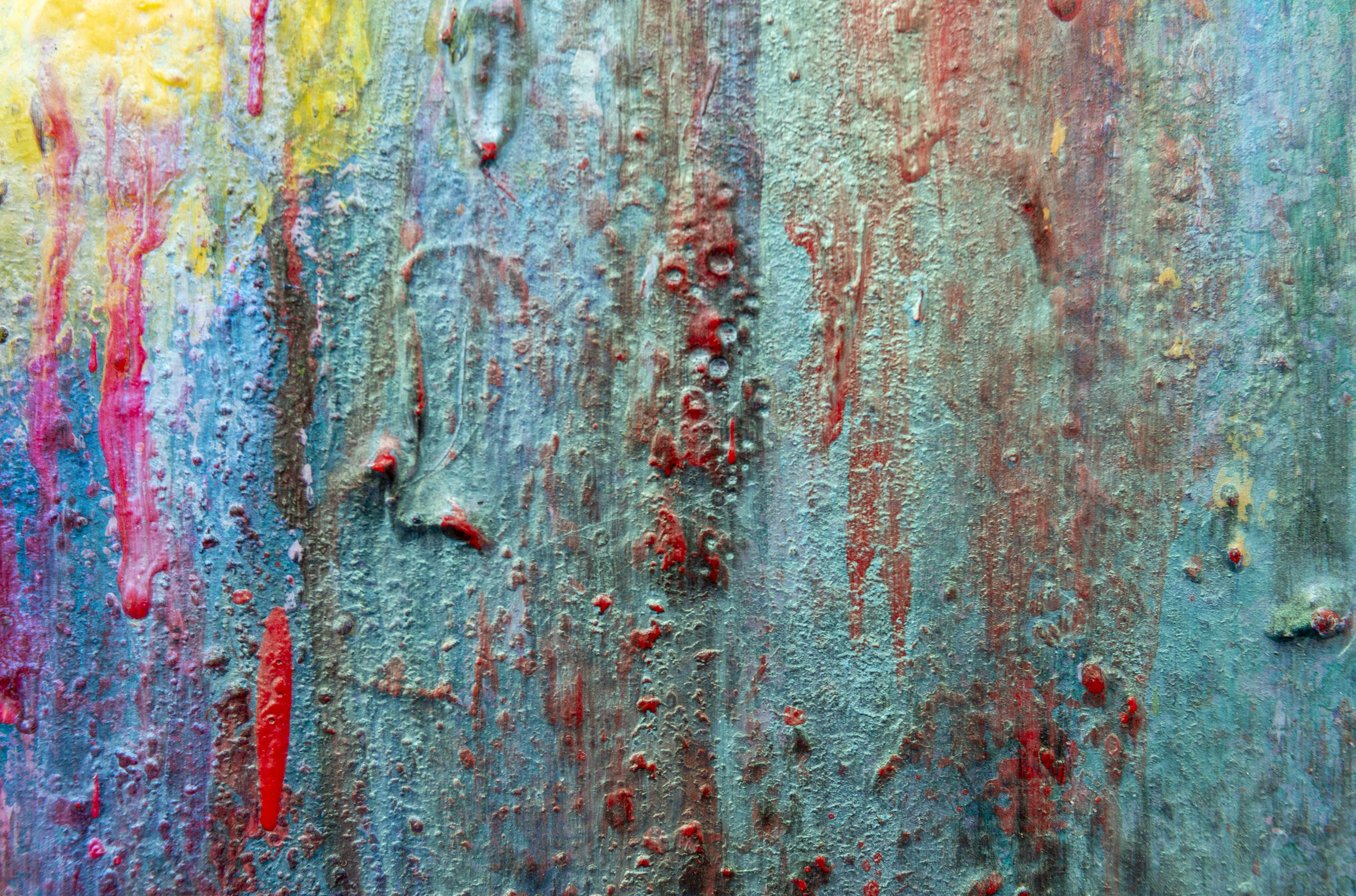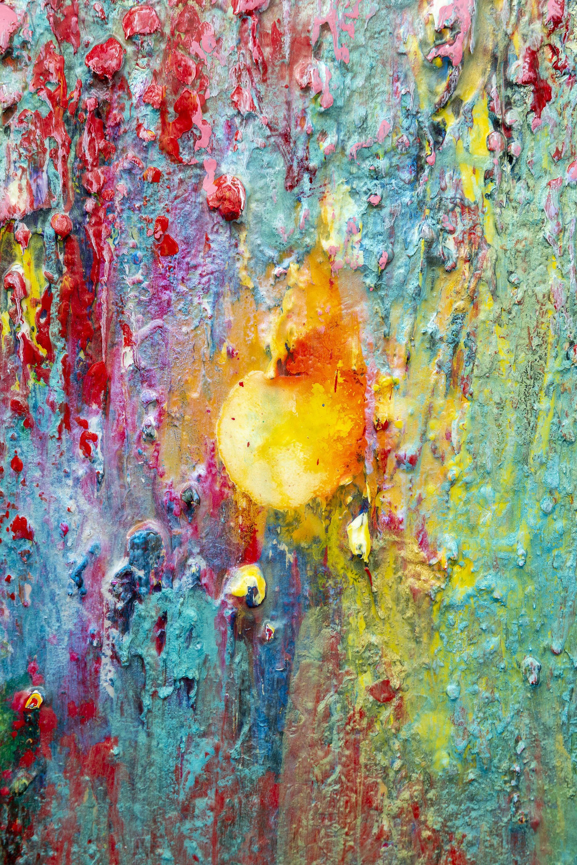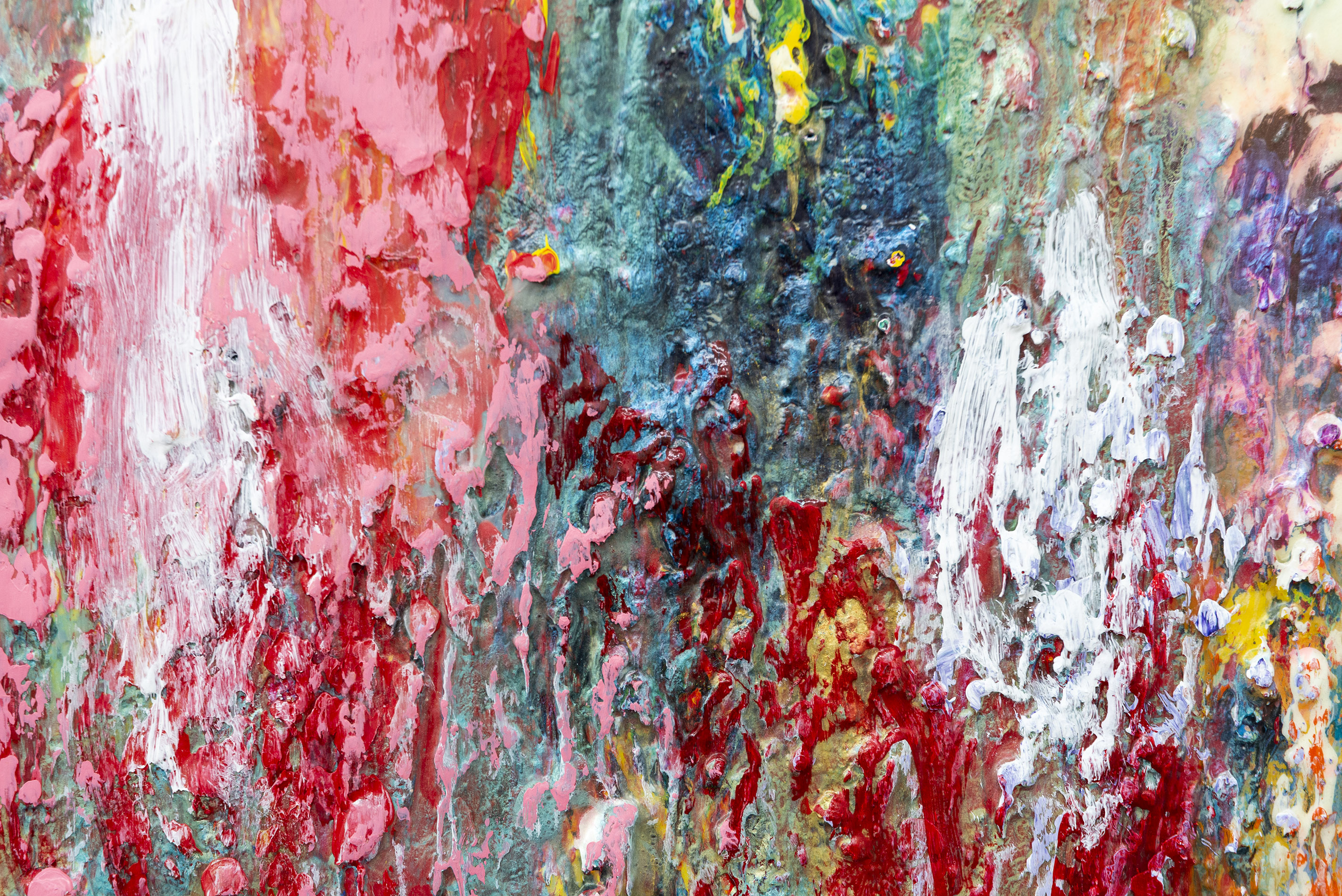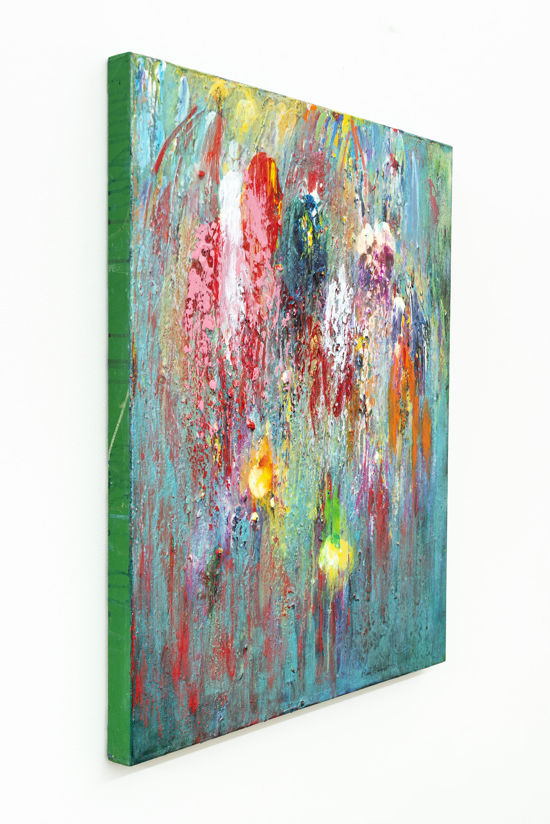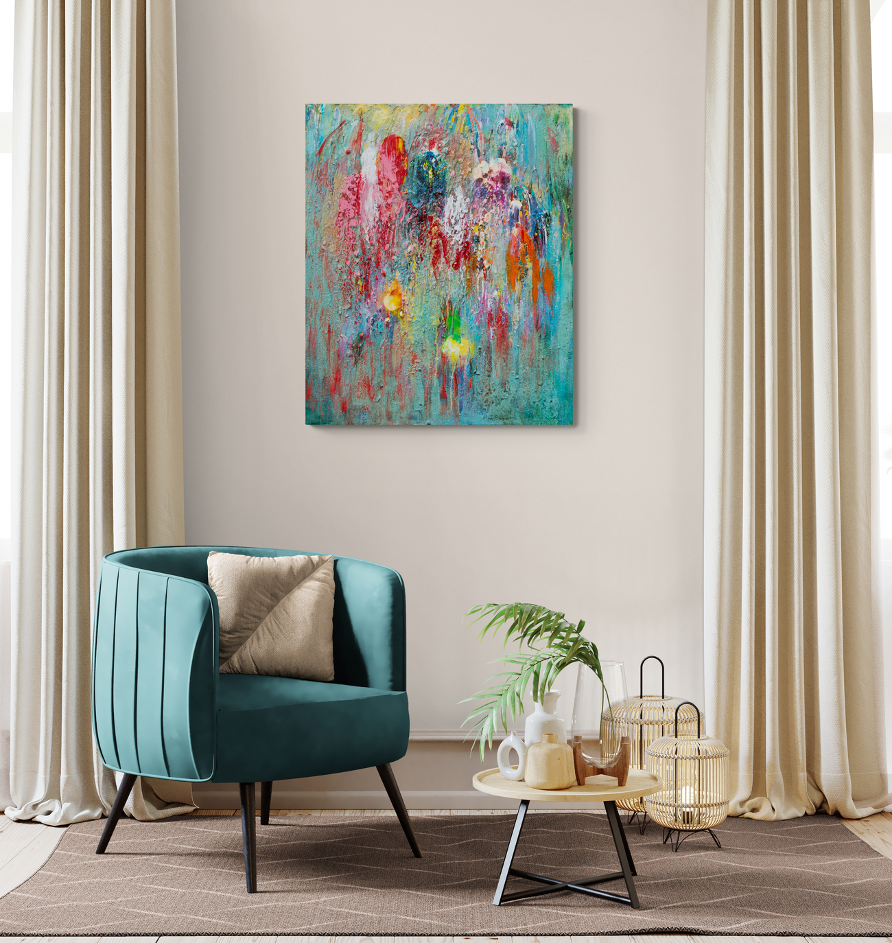 The dreamlike imagery of this painting in a cascade of pinks, red, green, yellow, purple, orange and white against a deep turquoise blue appears to resemble the colours of tropical waters.