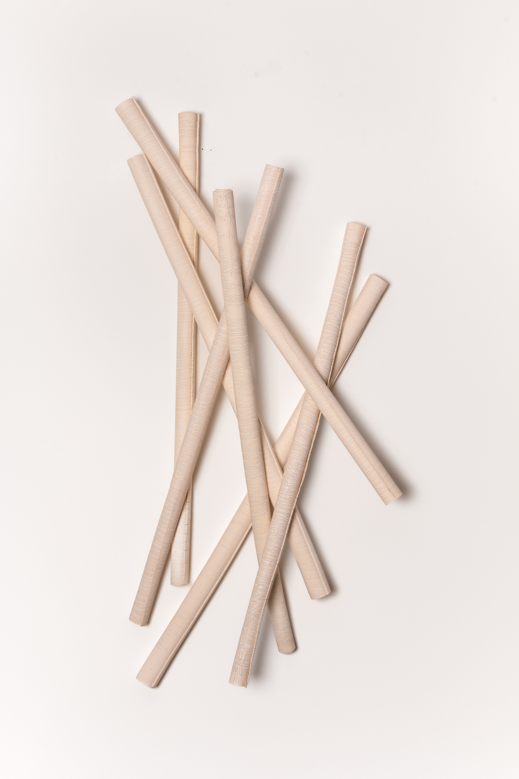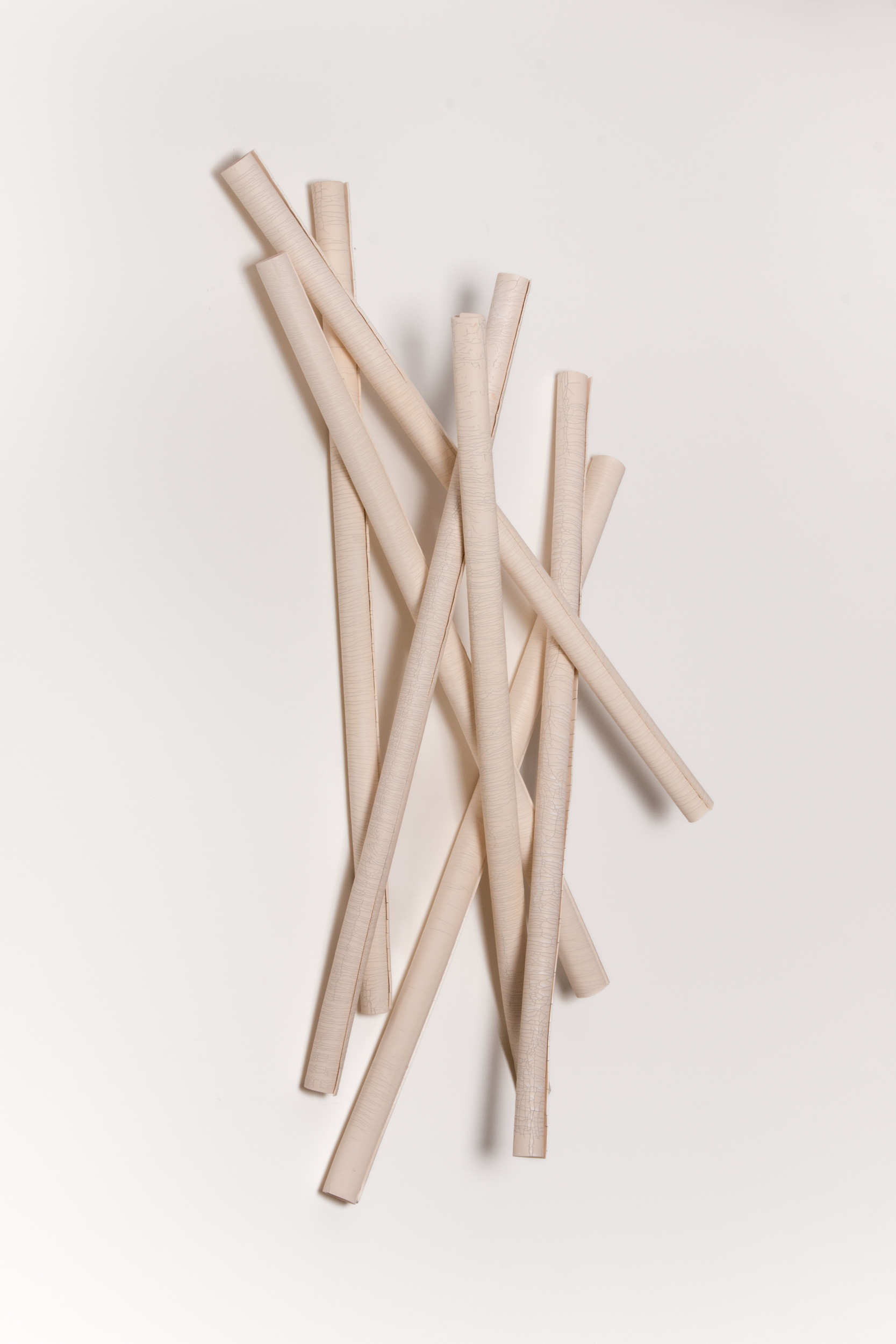 This contemporary sculptural ceramic wall composition is by Paula Murray.Amass is an elegant new series by ceramicist Paula Murray of contemporary wall art that references an ancient form of recording information, both secular and spiritual…the scroll. Each scroll is made from a customized clay recipe Murray mixes herself. The fine fissures on the surface of each scroll are created by inserting fibreglass filaments into the wet porcelain clay before firing. In this piece, nine creamy white scrolls float on the wall—each one overlapping another, designed to suggest an intriguing narrative.