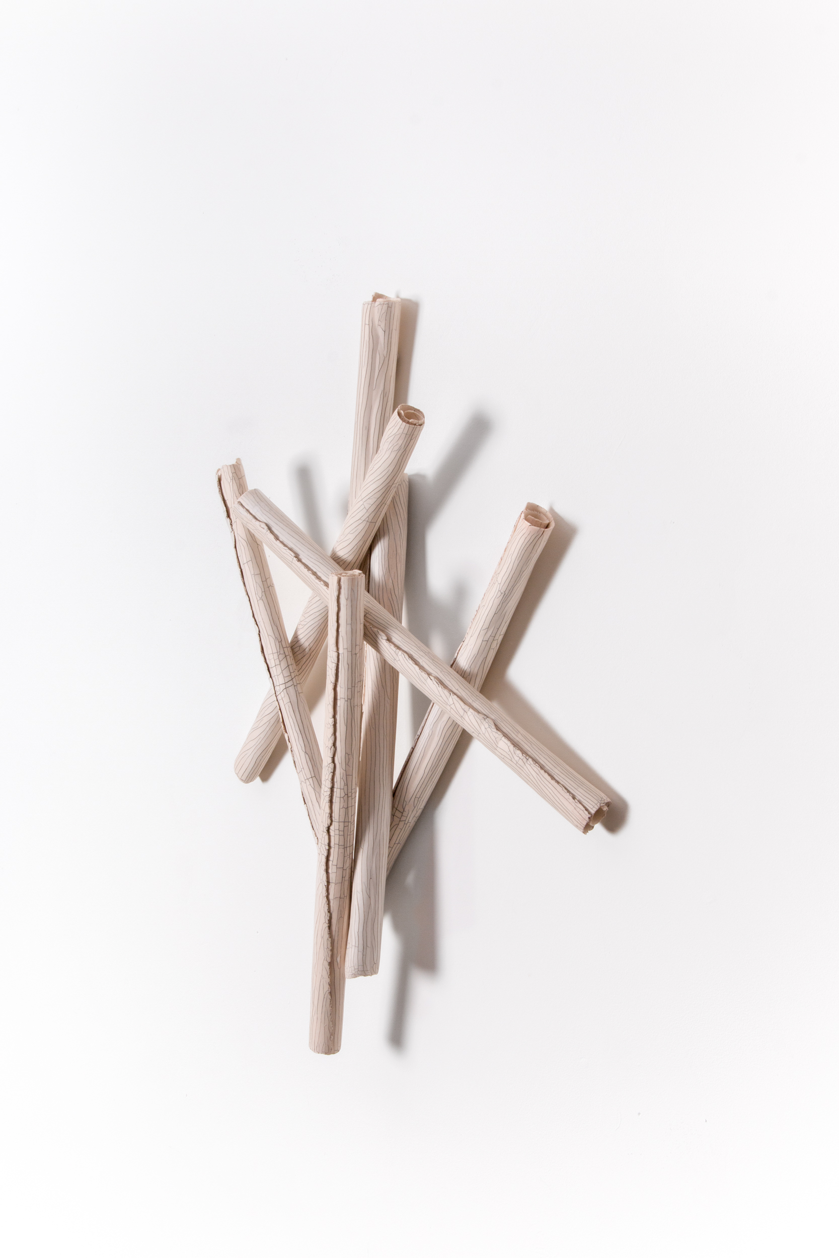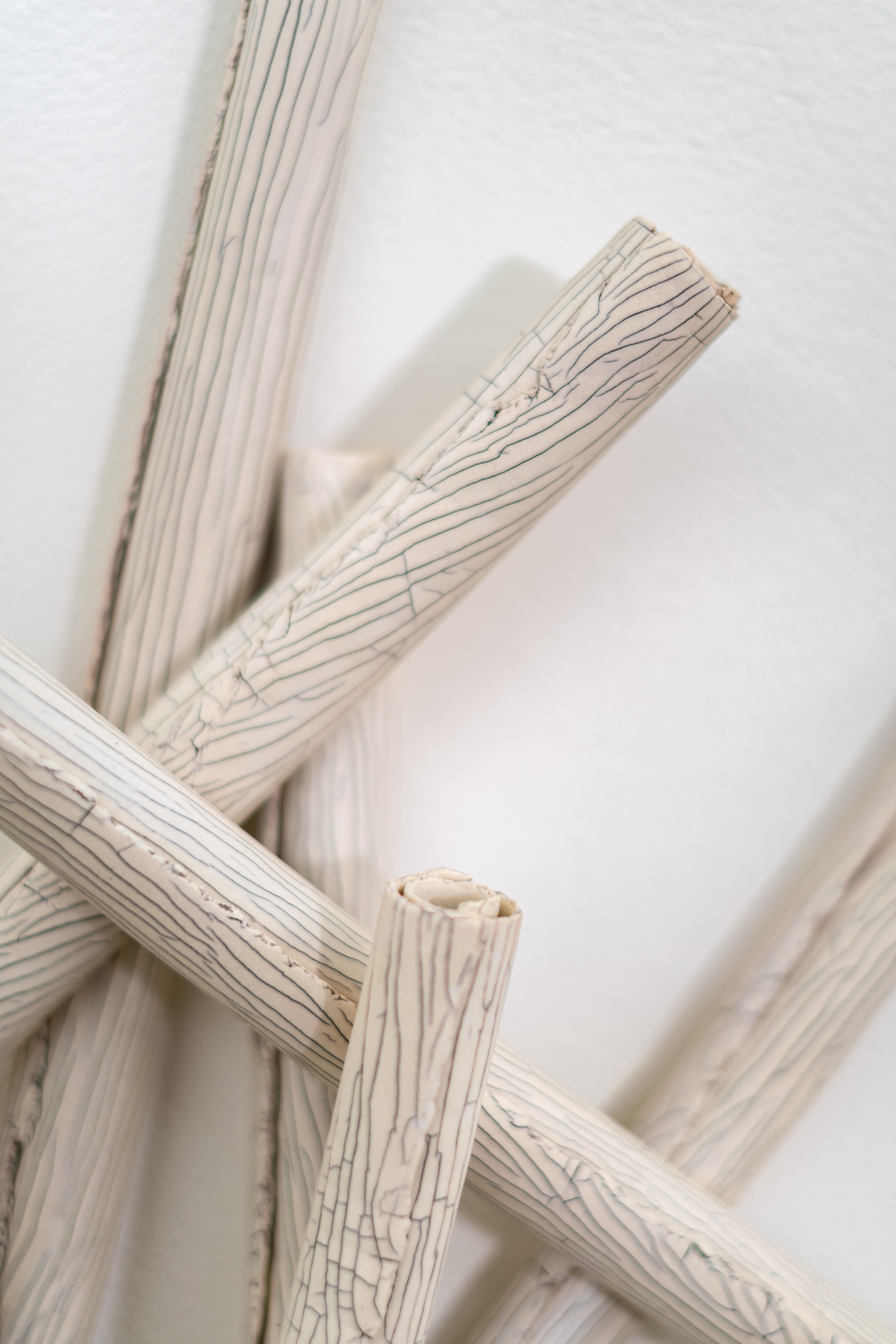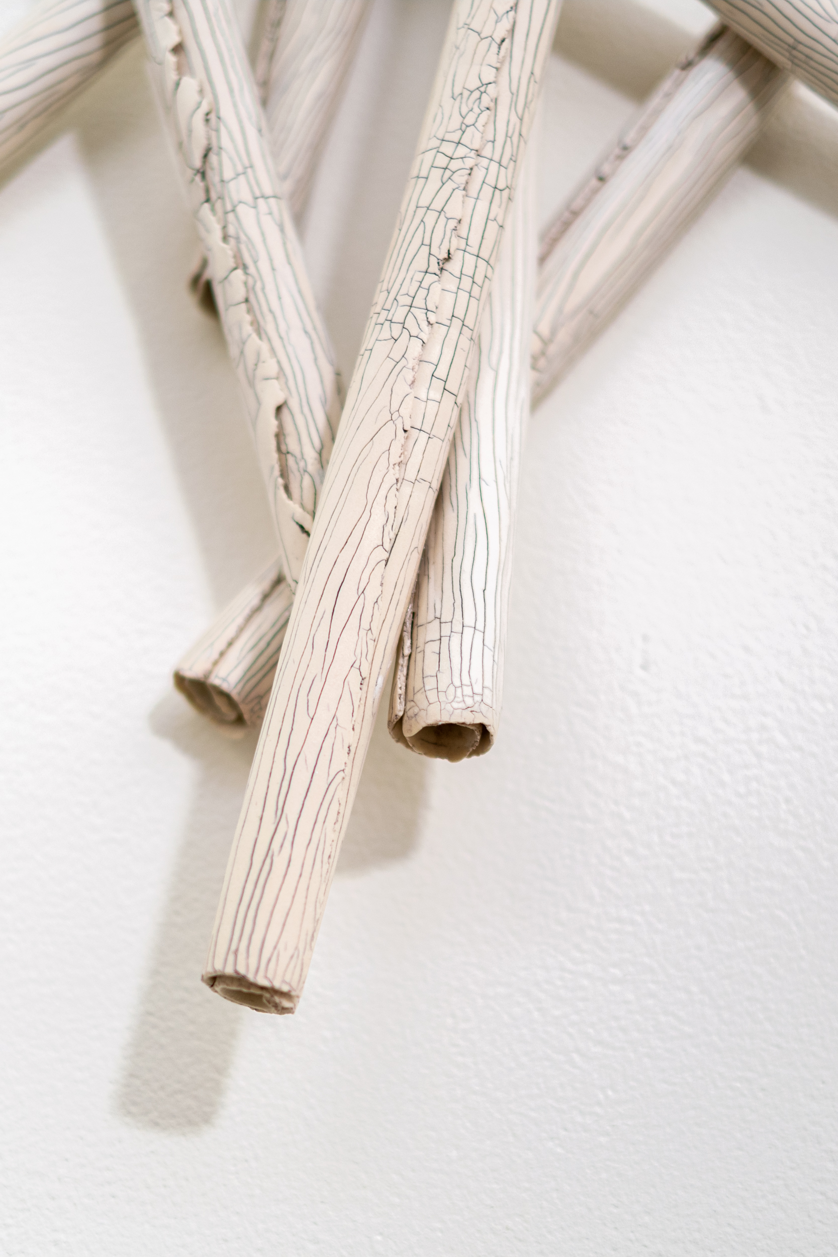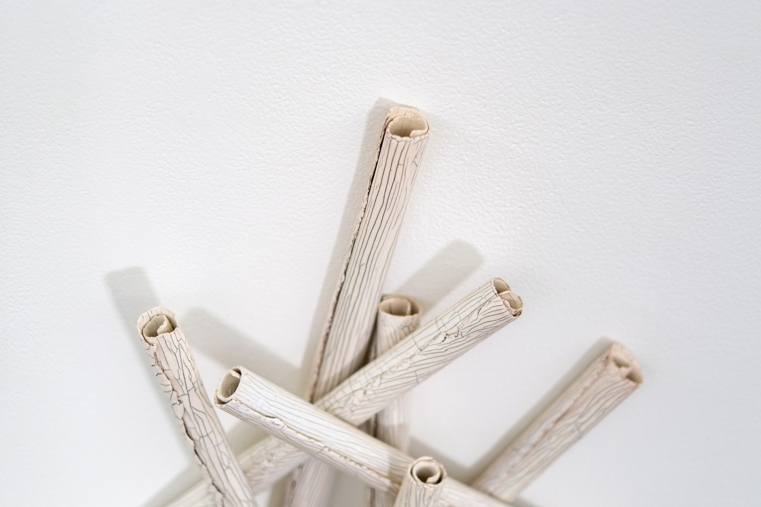“When I roll a porcelain slab into the form of a scroll, a mysterious language appears. Like revelatory texts, there are so many layers of meaning to discover, interpret, appreciate. How do we discern truth from spin? Fired in clay, the writing stays true; it cannot be tampered with, transformed into a set of alternate facts. Floating on the wall, these compositions are not neat and tidy but invite a reading between the lines.” Paula Murray