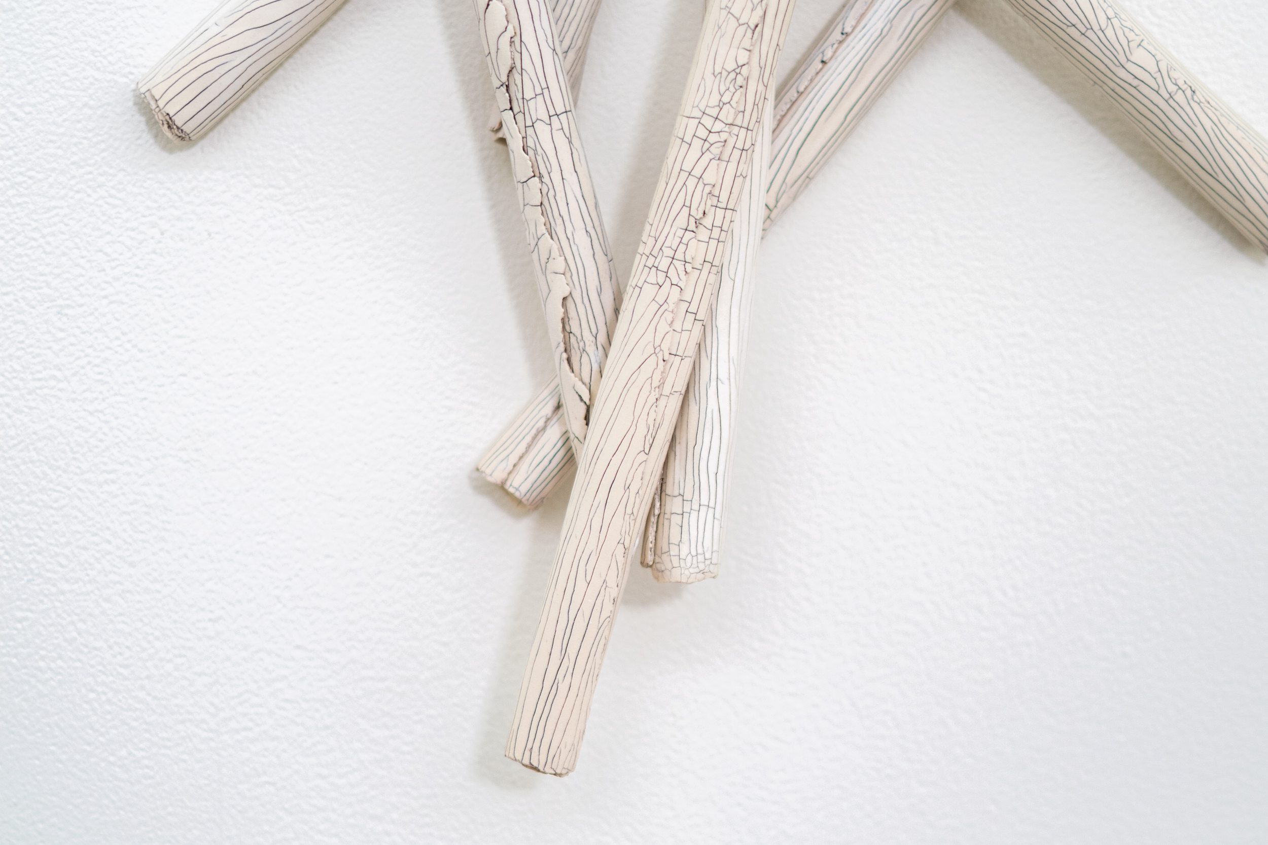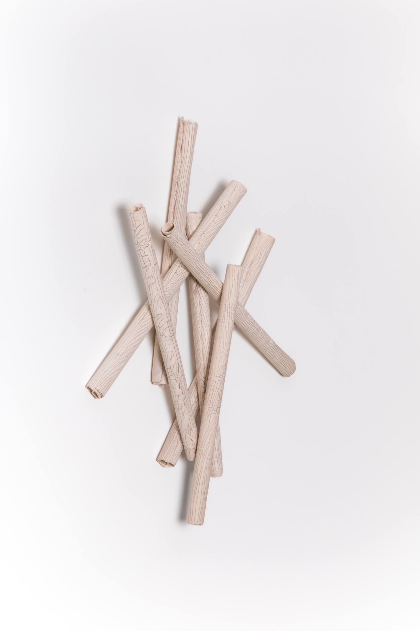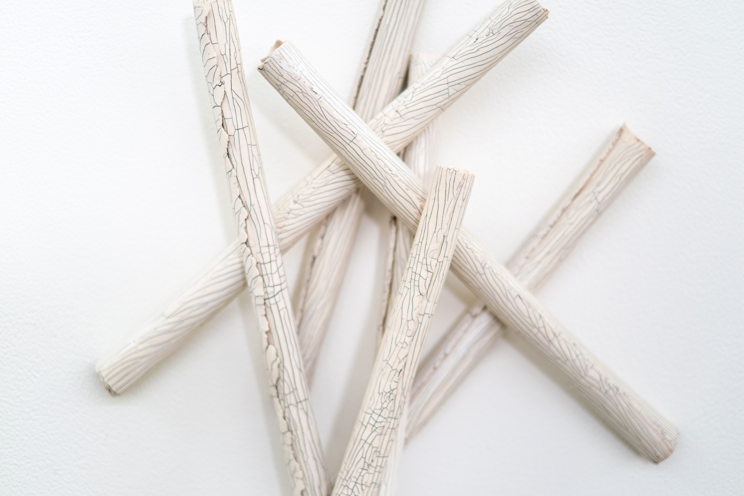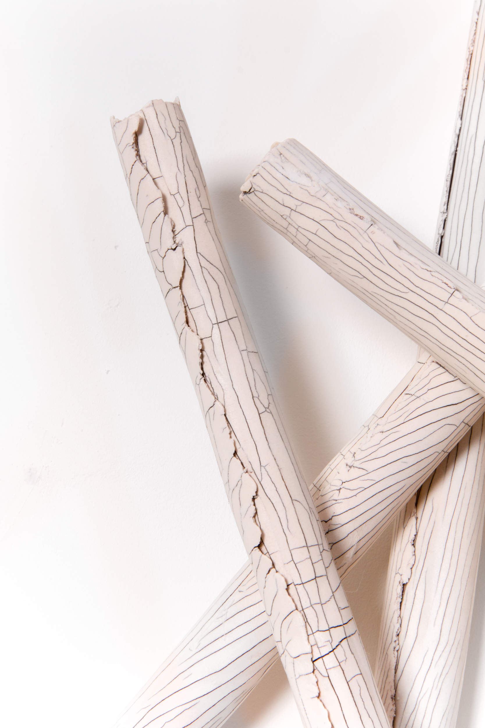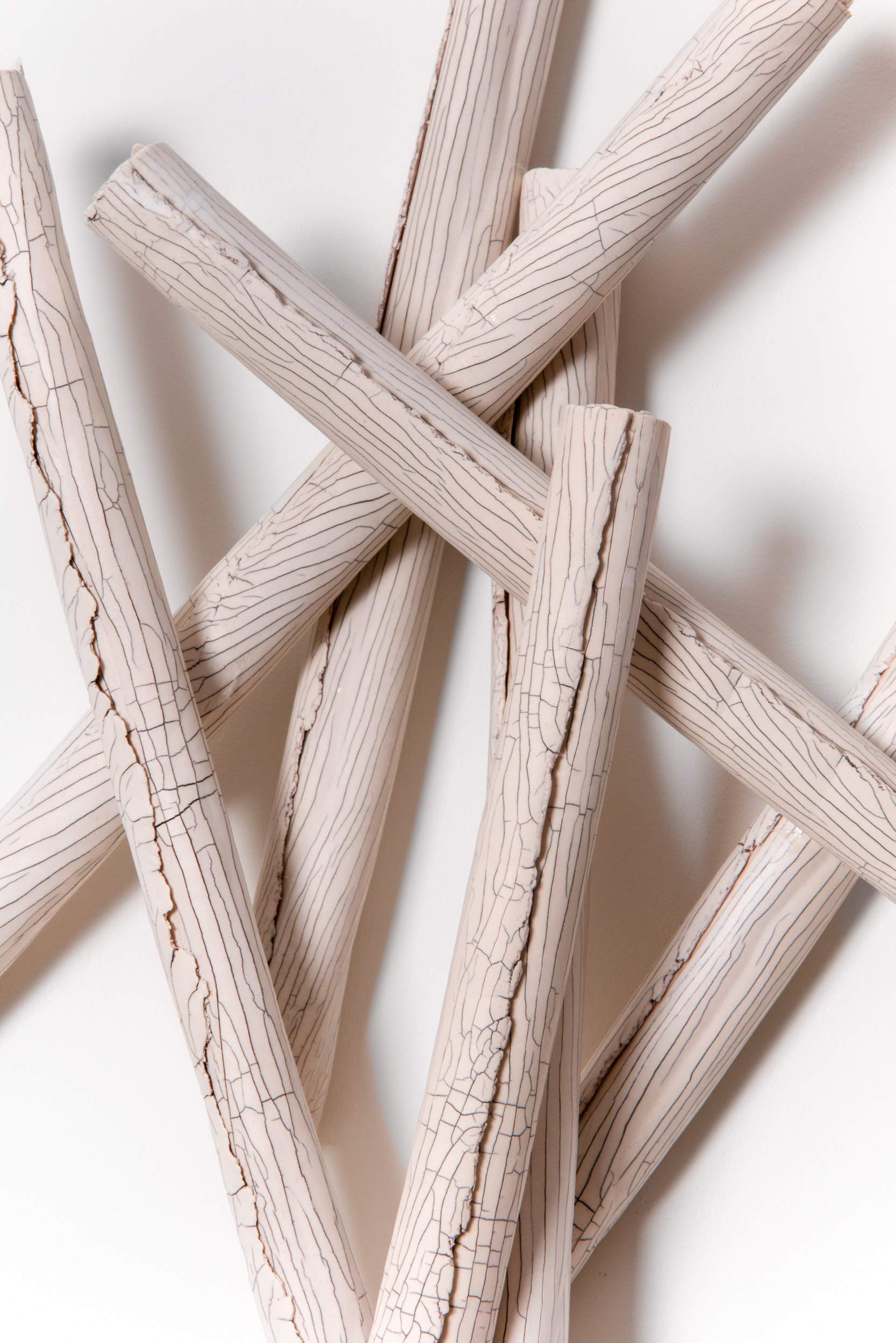 “When I roll a porcelain slab into the form of a scroll, a mysterious language appears. Like revelatory texts, there are so many layers of meaning to discover, interpret, appreciate. How do we discern truth from spin? Fired in clay, the writing stays true; it cannot be tampered with, transformed into a set of alternate facts. Floating on the wall, these compositions are not neat and tidy but invite a reading between the lines.” Paula Murray
