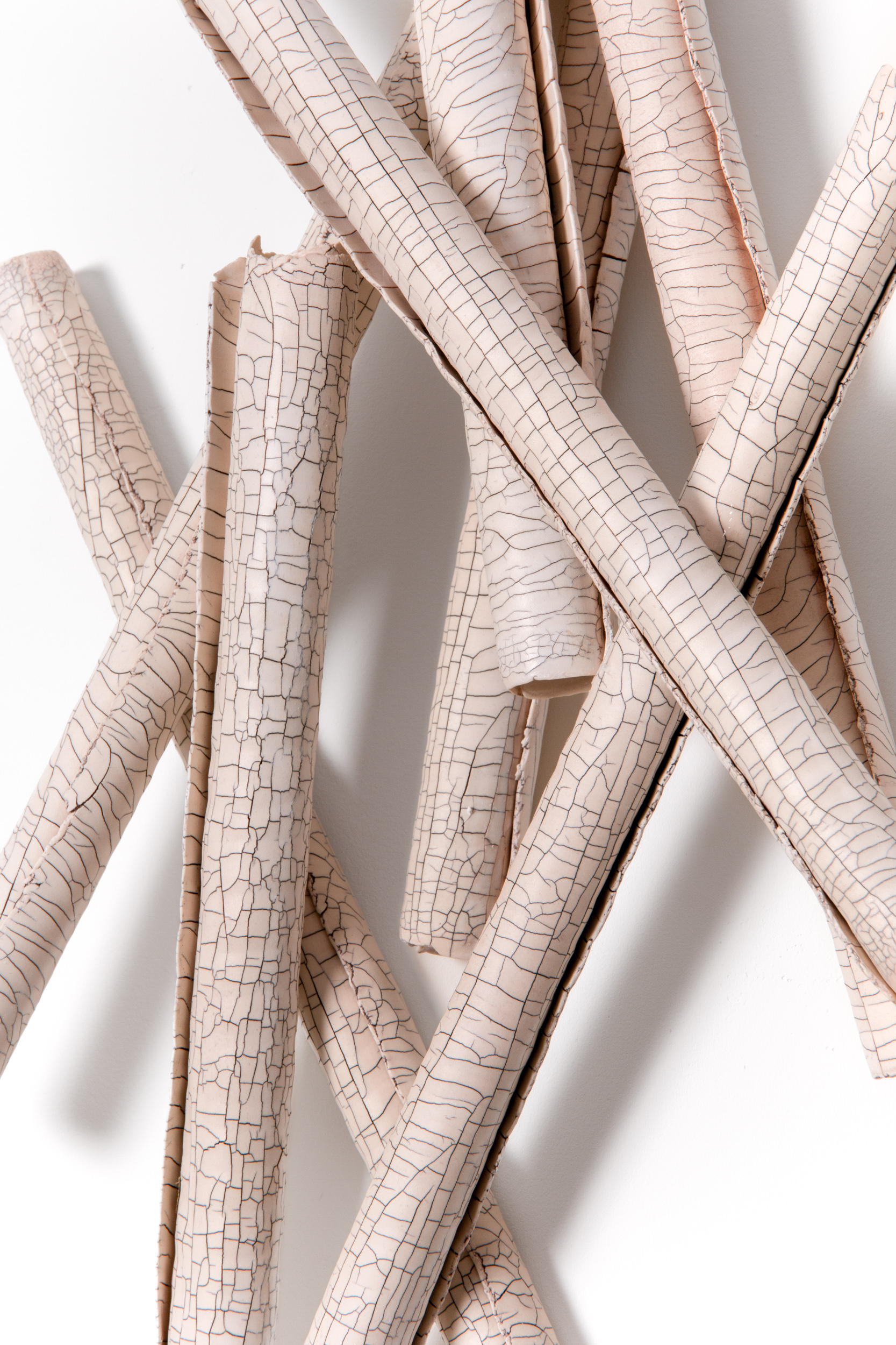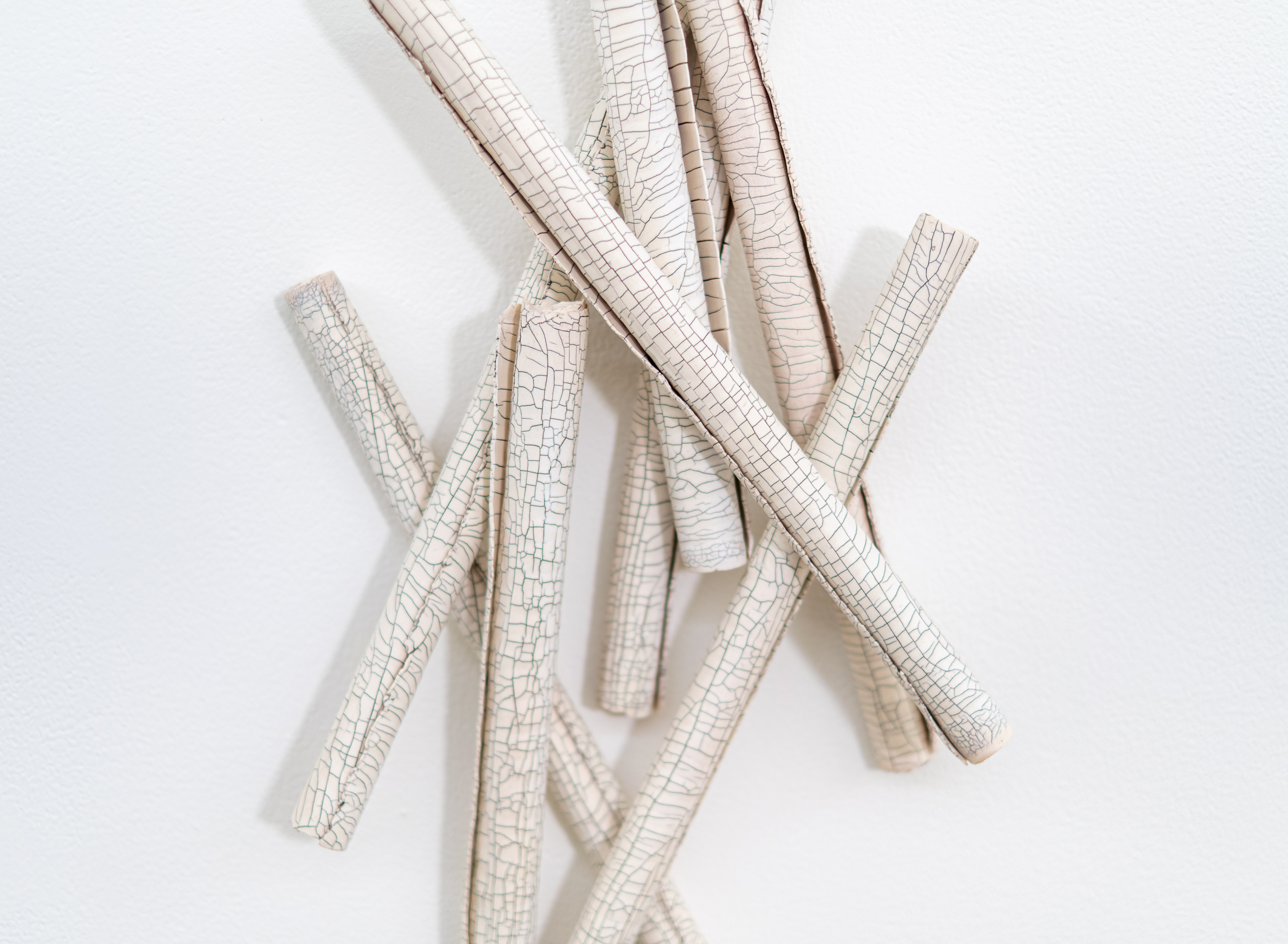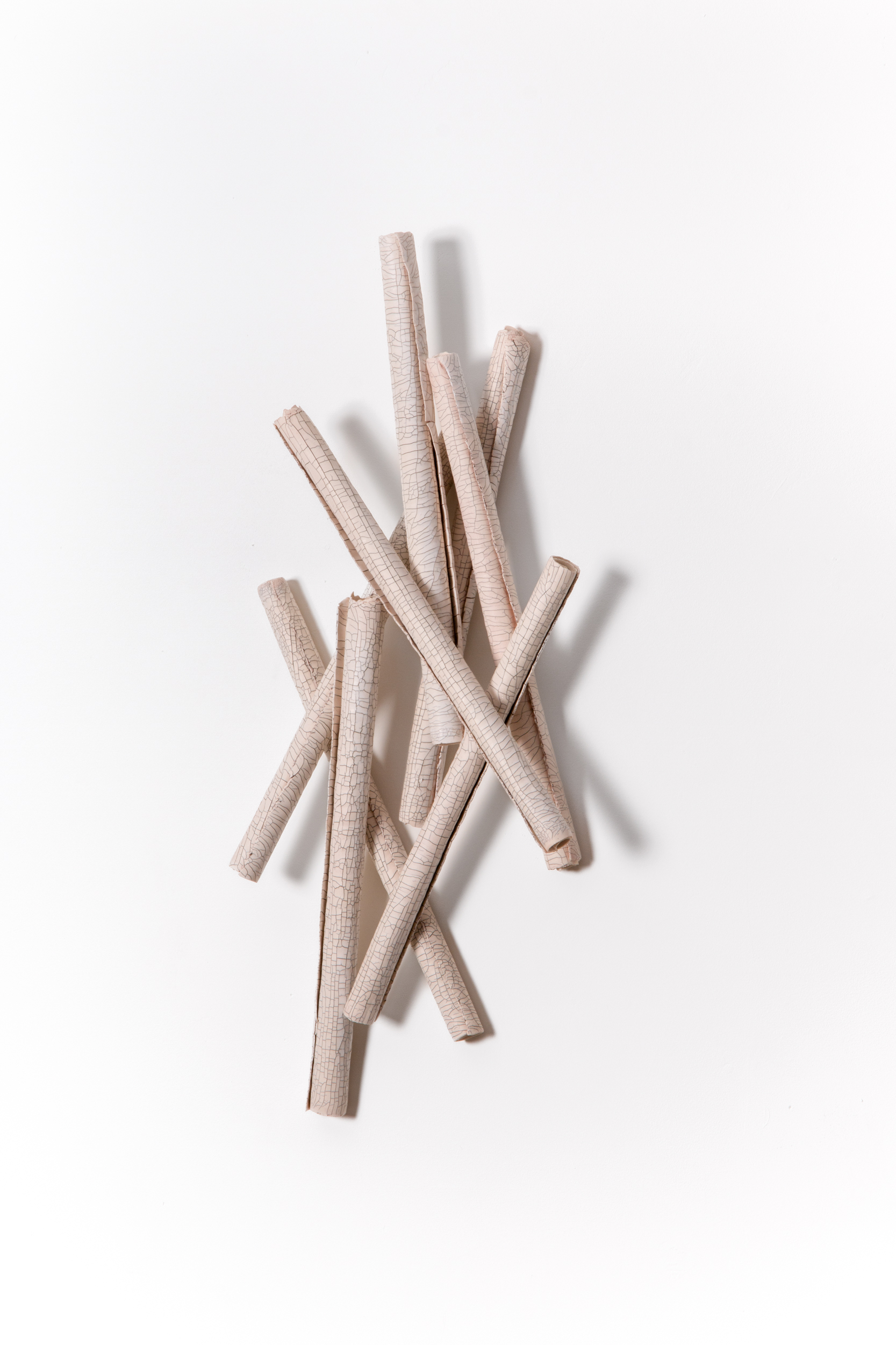 The fine fissures on the surface of each scroll are created by inserting fibreglass filaments into the wet porcelain clay before firing. In this piece, thirteen creamy white scrolls float on the wall—each one overlapping another, designed to suggest an intriguing narrative.