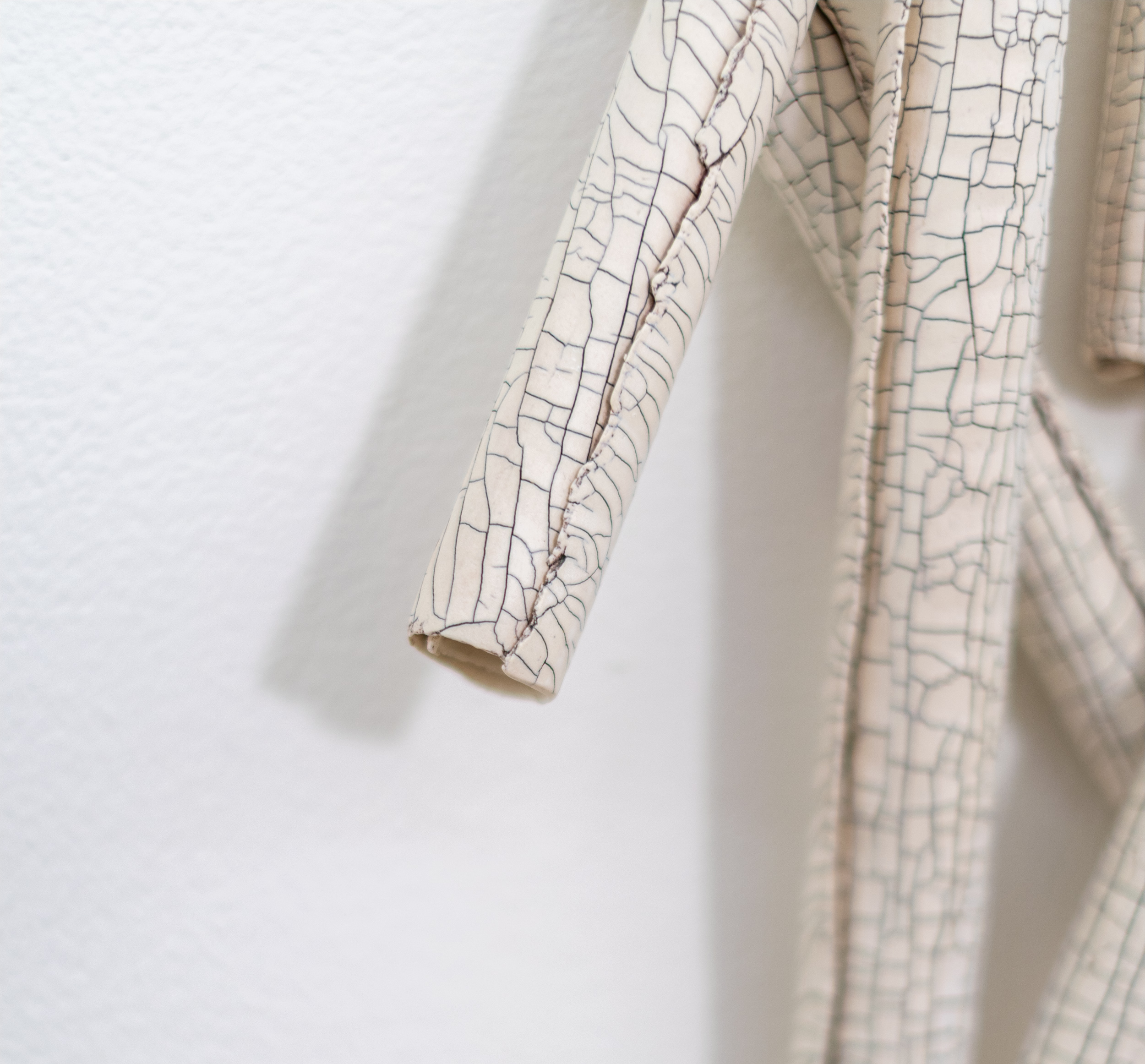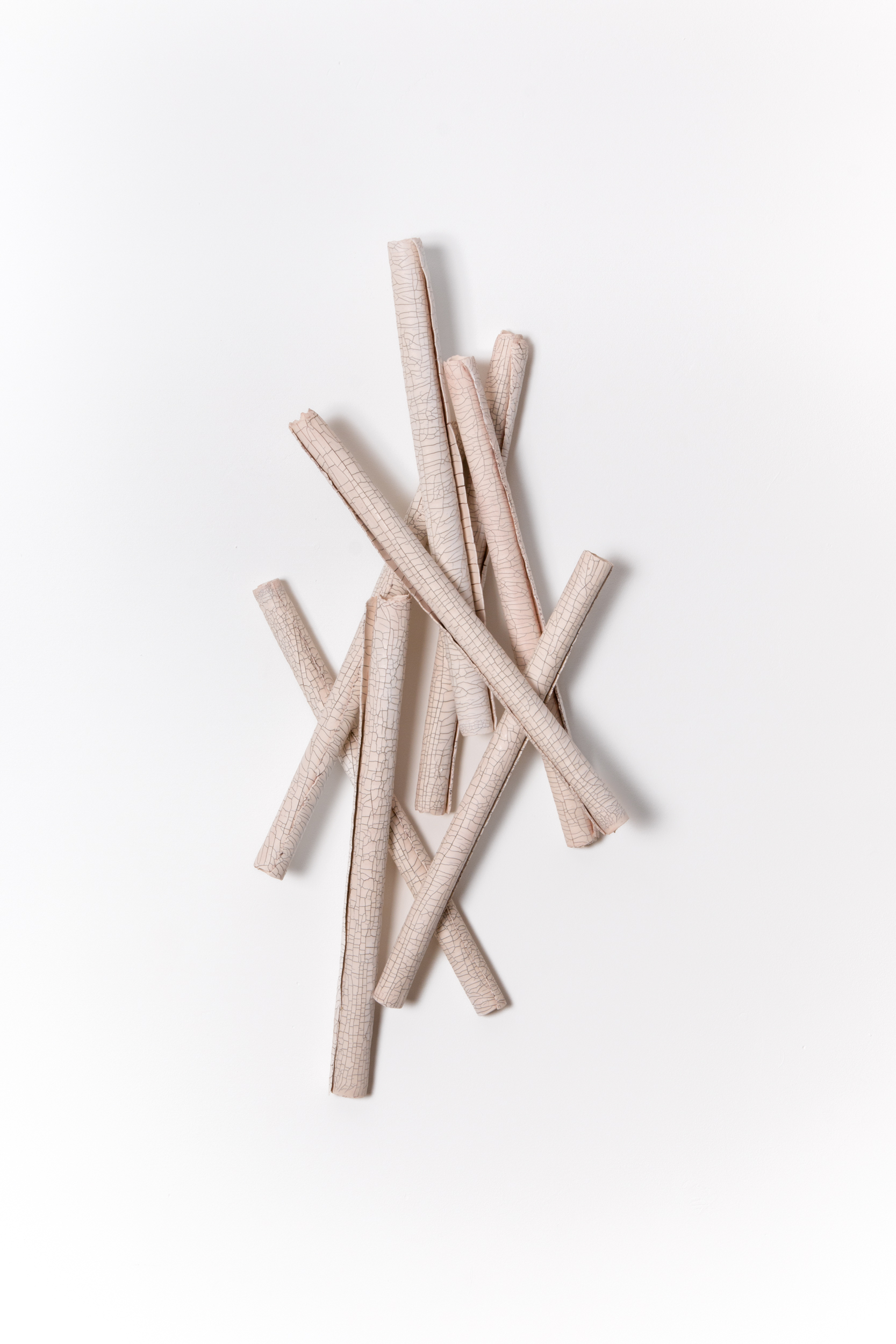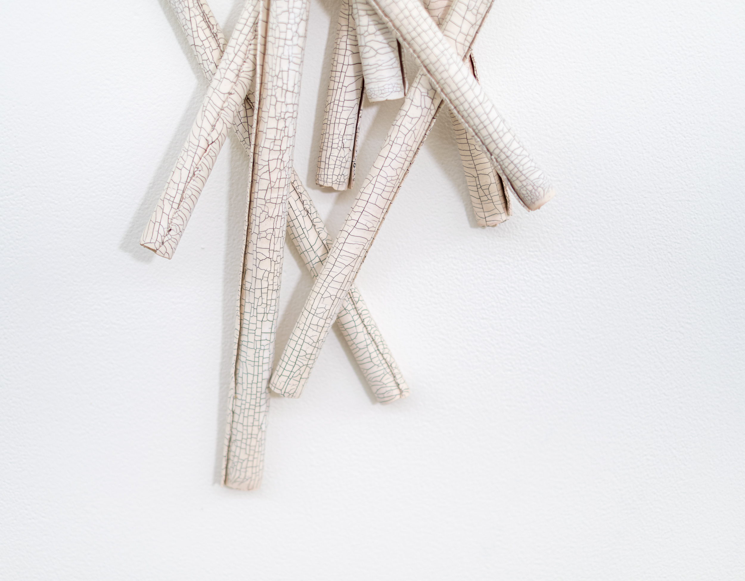 The fine fissures on the surface of each scroll are created by inserting fibreglass filaments into the wet porcelain clay before firing. In this piece, thirteen creamy white scrolls float on the wall—each one overlapping another, designed to suggest an intriguing narrative.