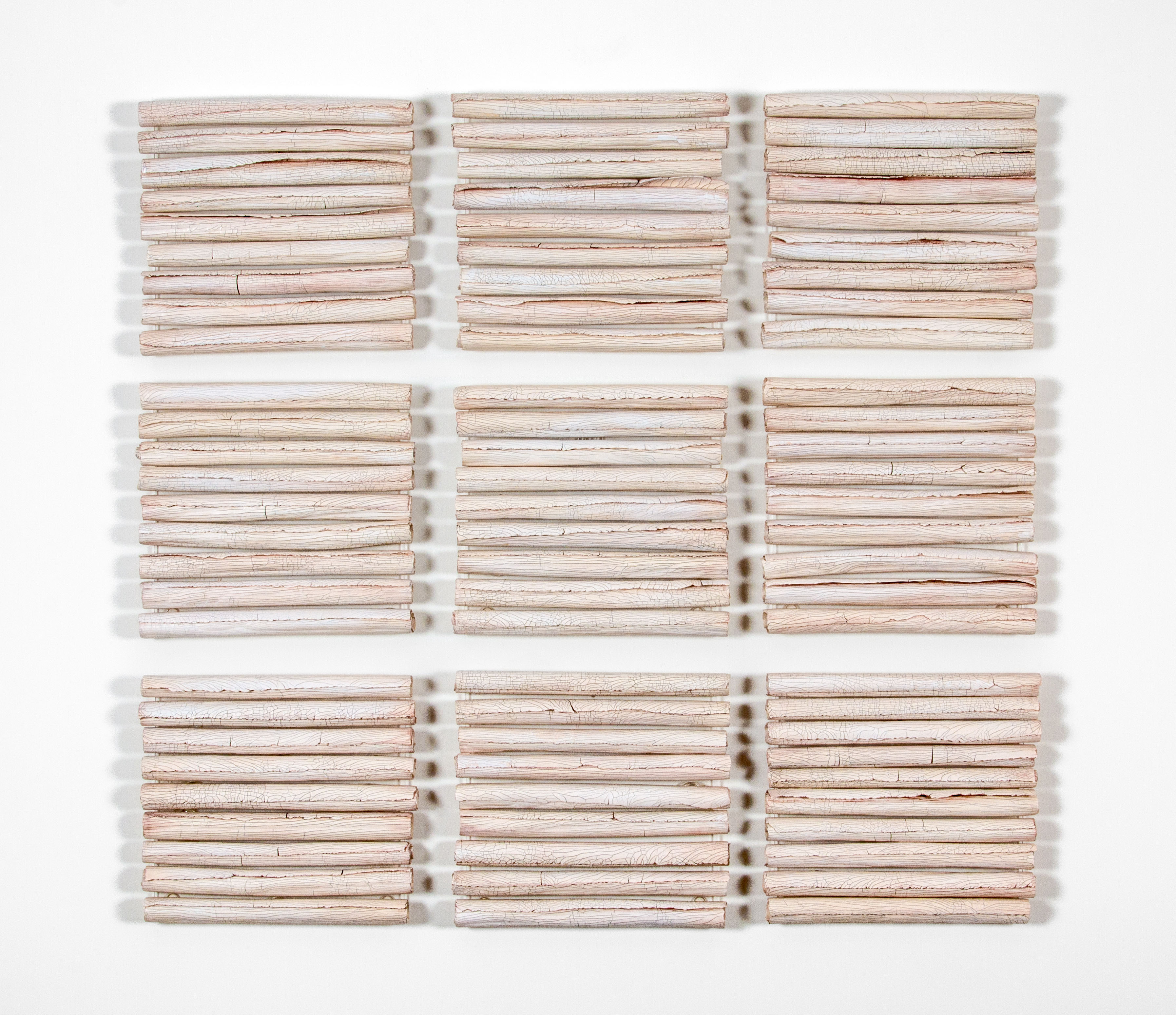 This contemporary white porcelain wall sculpture is by Paula Murray.Canadian artist Paula Murray is praised by collectors and critics alike for her exquisite craftsmanship and beautiful design. Her clay-fired scroll series—sculptural porcelain pieces that seem to float on the wall is inspired by the idea of how knowledge is both acquired and passed down from one generation to the next. This elegant composition features three rows of nine squares of single hand-rolled scrolls--each ’inscribed’ with Murray’s signature, finely detailed cracks.