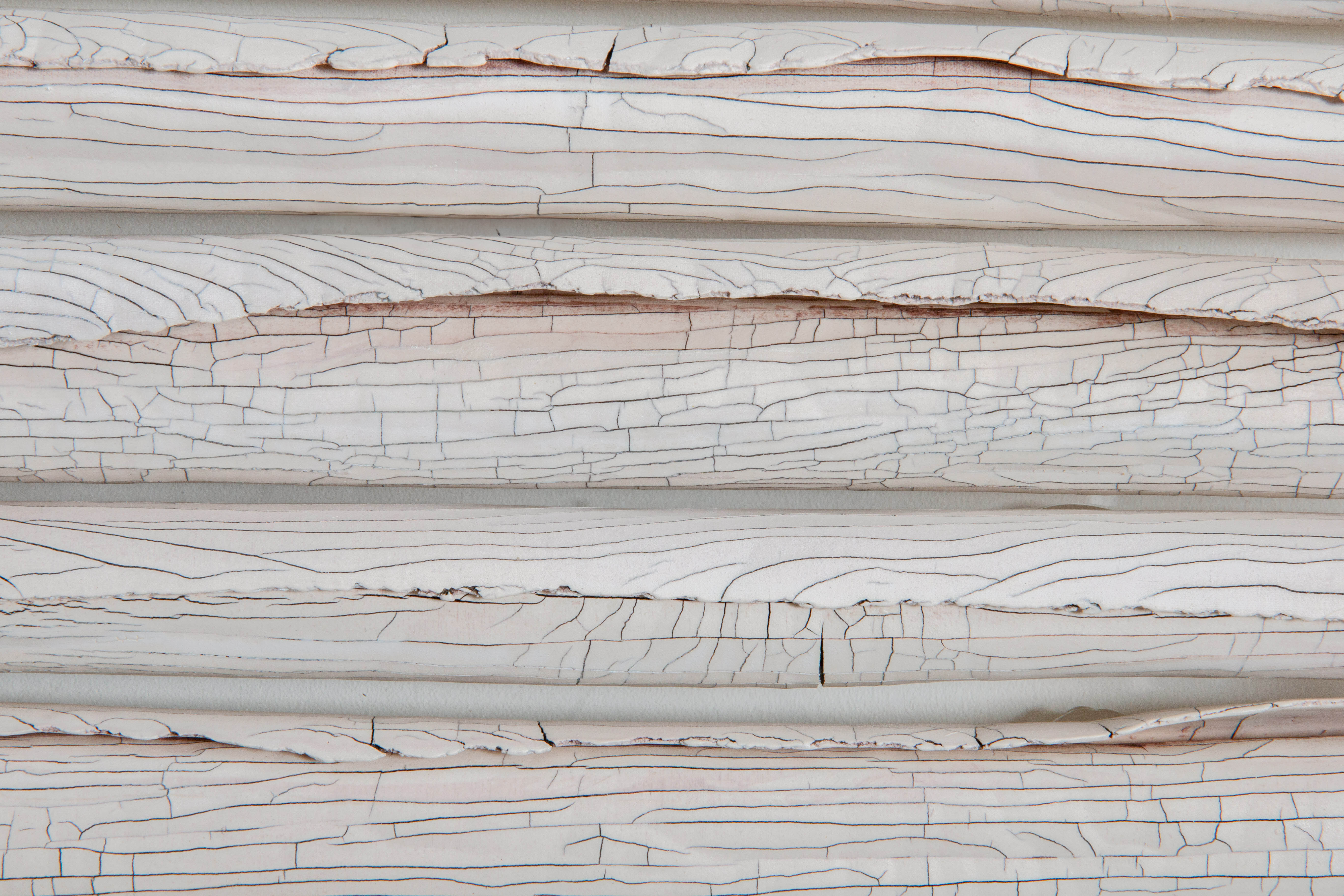 The cracks are highlighted by a subtle terracotta red glaze and are designed to emulate text—"a mysterious language.” Murray associates the markings with “tree bark and sacred texts that need to be deciphered.” The scrolls are mounted on a plexiglass base.