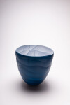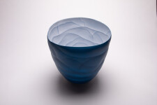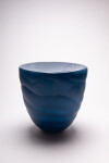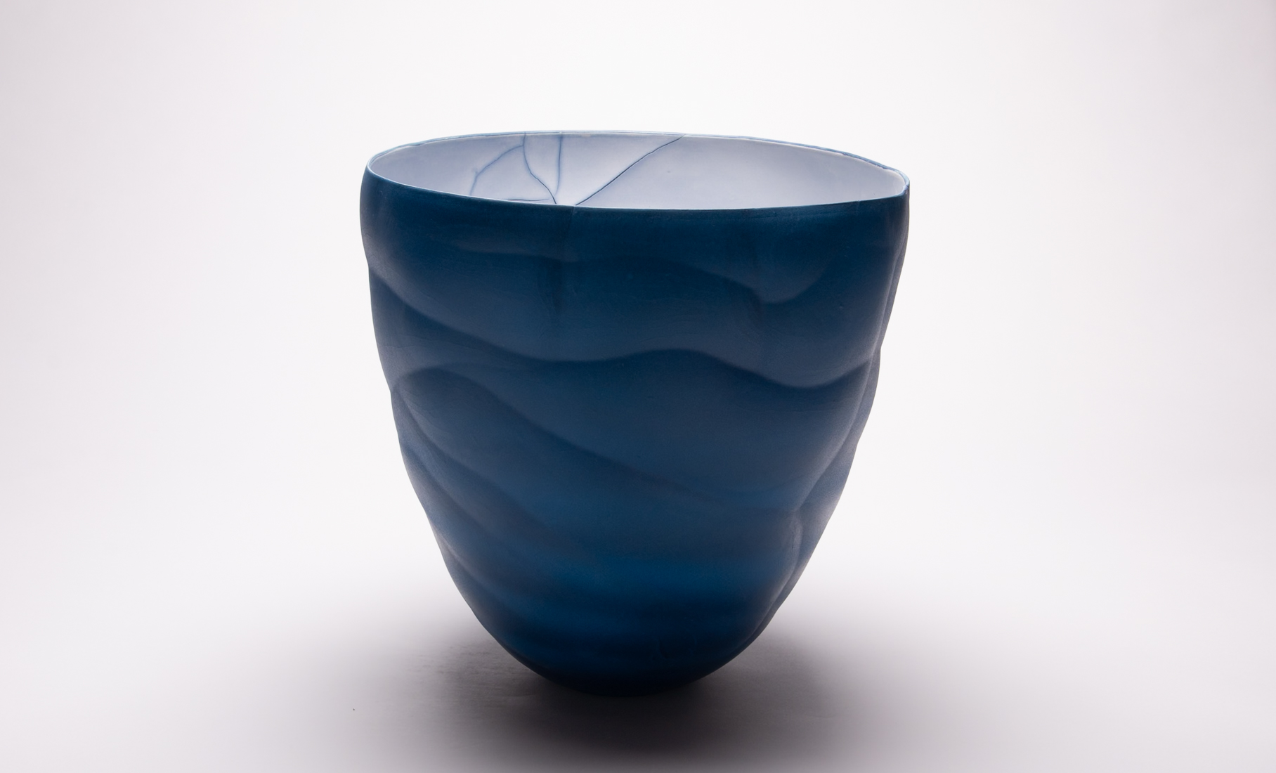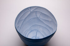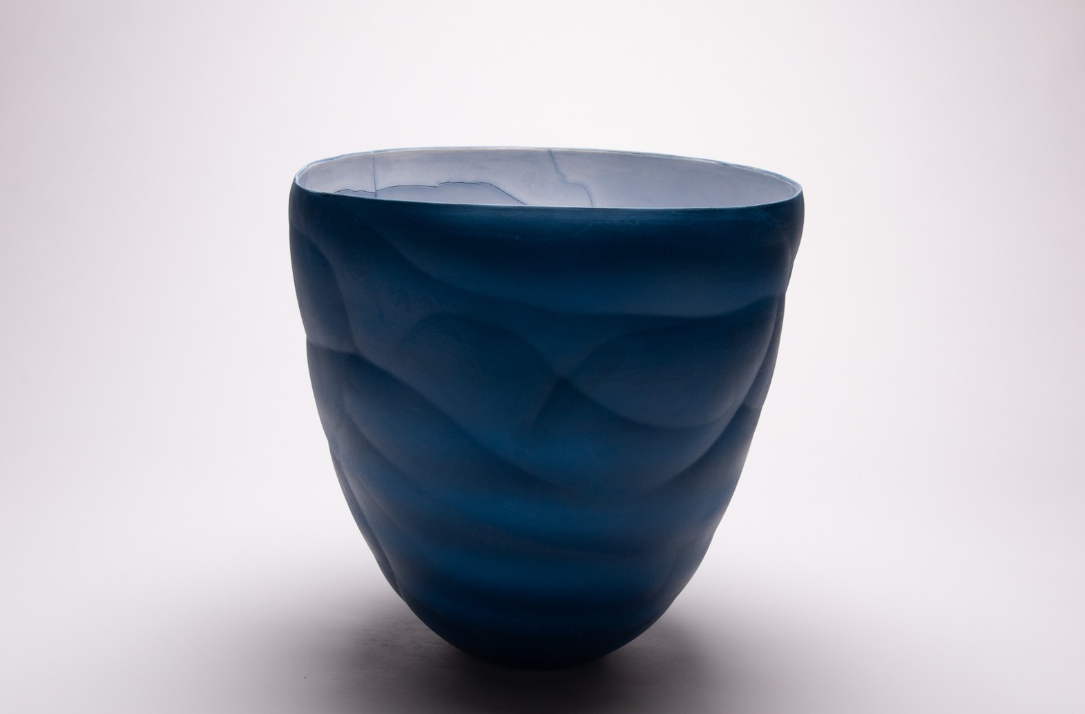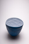 This is one of a series of vessels she has created; its undulating shape, hand-built from Jingdezhen porcelain. Cobalt metal salts provide the strikingly deep blue colour on the exterior that migrates to the fissures inside the bowl, adding contrast to the white finish. Its organic form displays her signature—fine craquelure or ruptures of the surface defined by a darker color inside, adding subtle texture and definition outside.