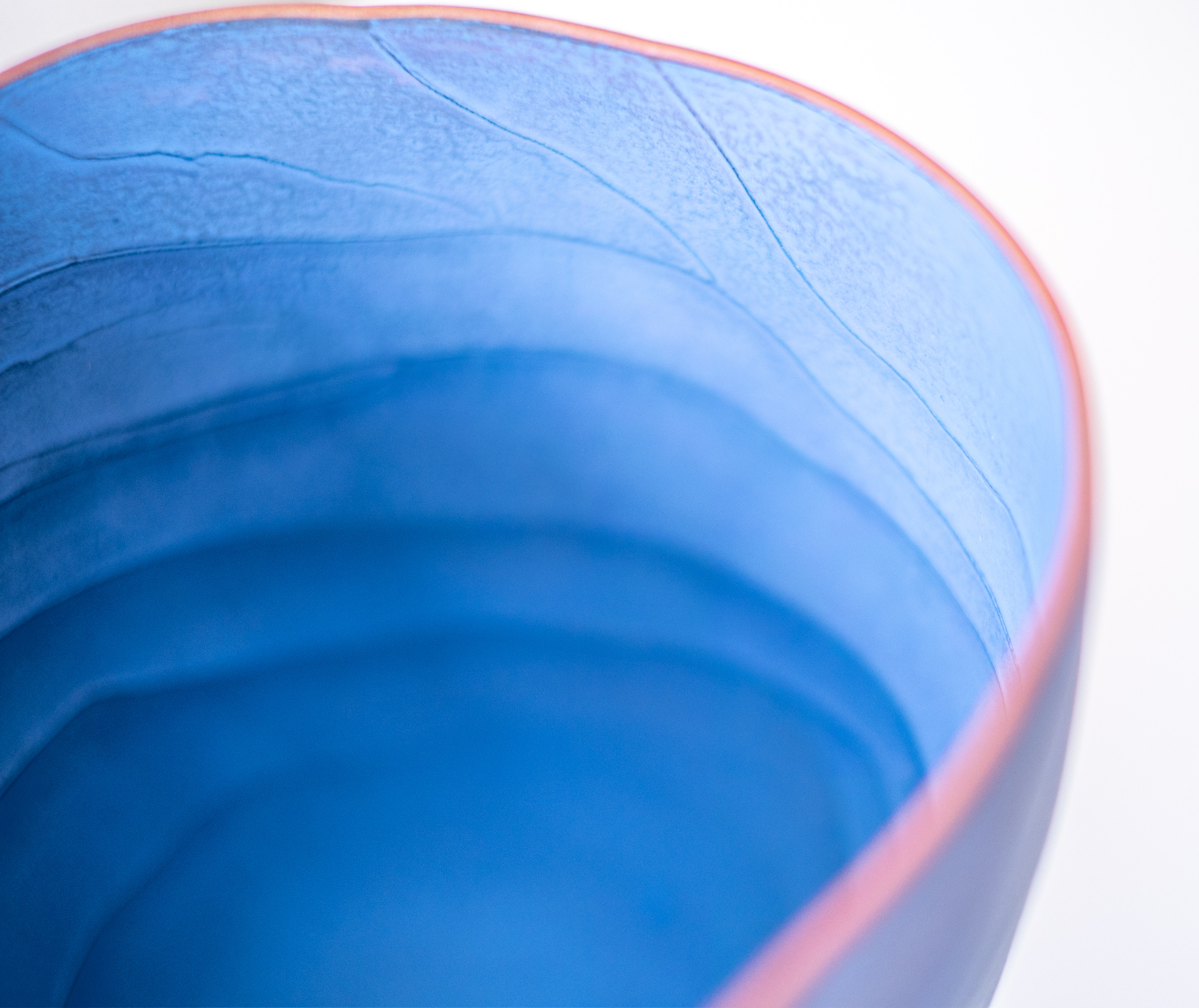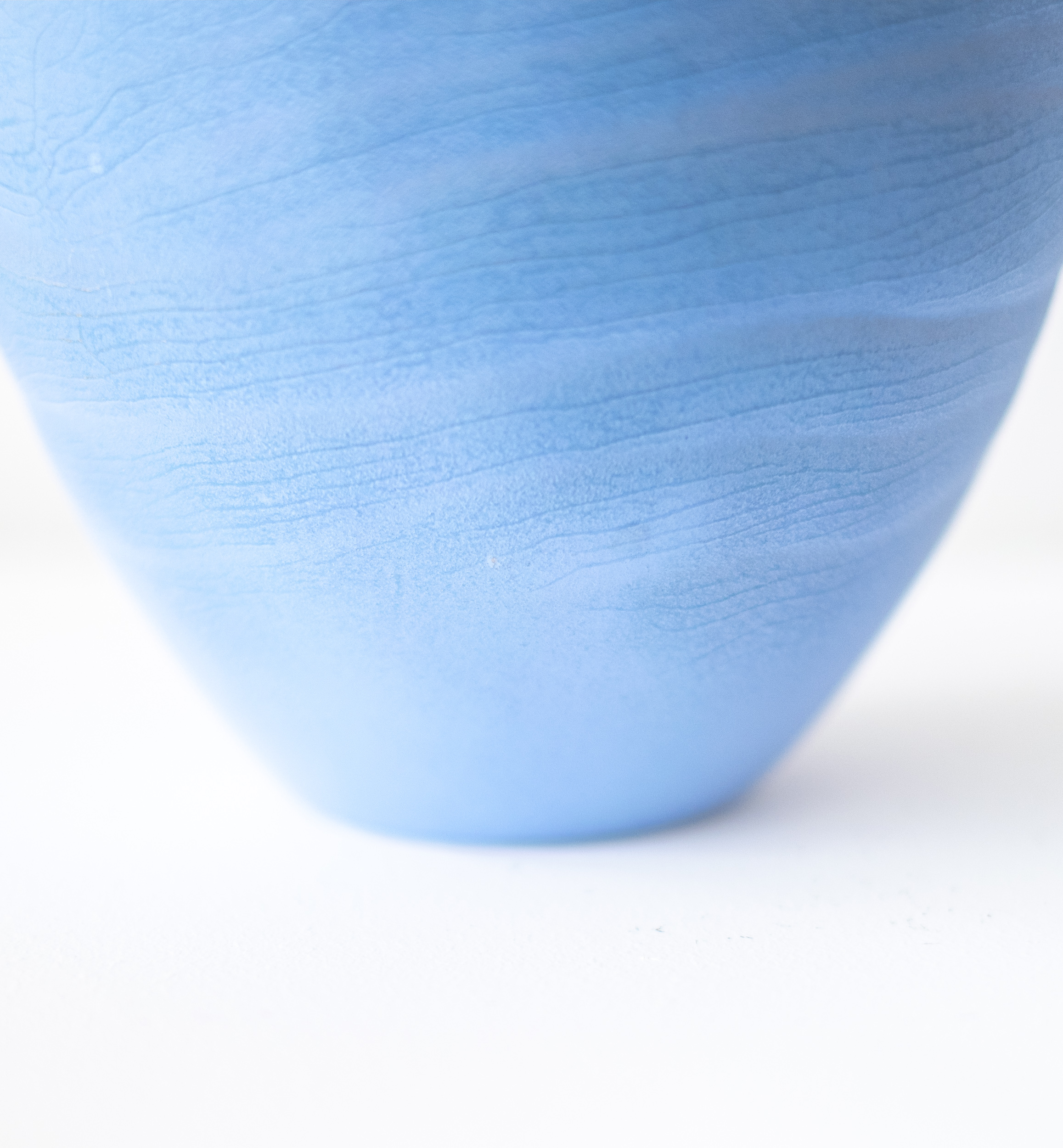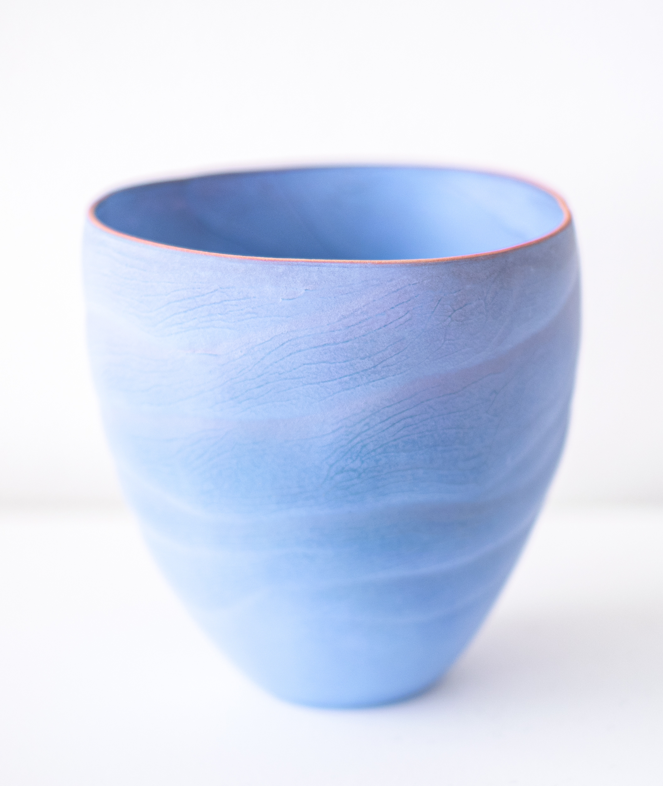 This contemporary blue ceramic vase has an organic shape inspired by nature.Paula Murray’s superb ceramic work is valued for its timeless beauty. Using her own recipe for clay, over multiple firings, Murray hand forms her vessels employing a number of different techniques to infill, knit together, sandblast or burnish the interior/exterior of her work. This blue piece with a distinctive red rim displays her unique signature—fine, wavy lines on the surface add subtle texture and definition inside and out.