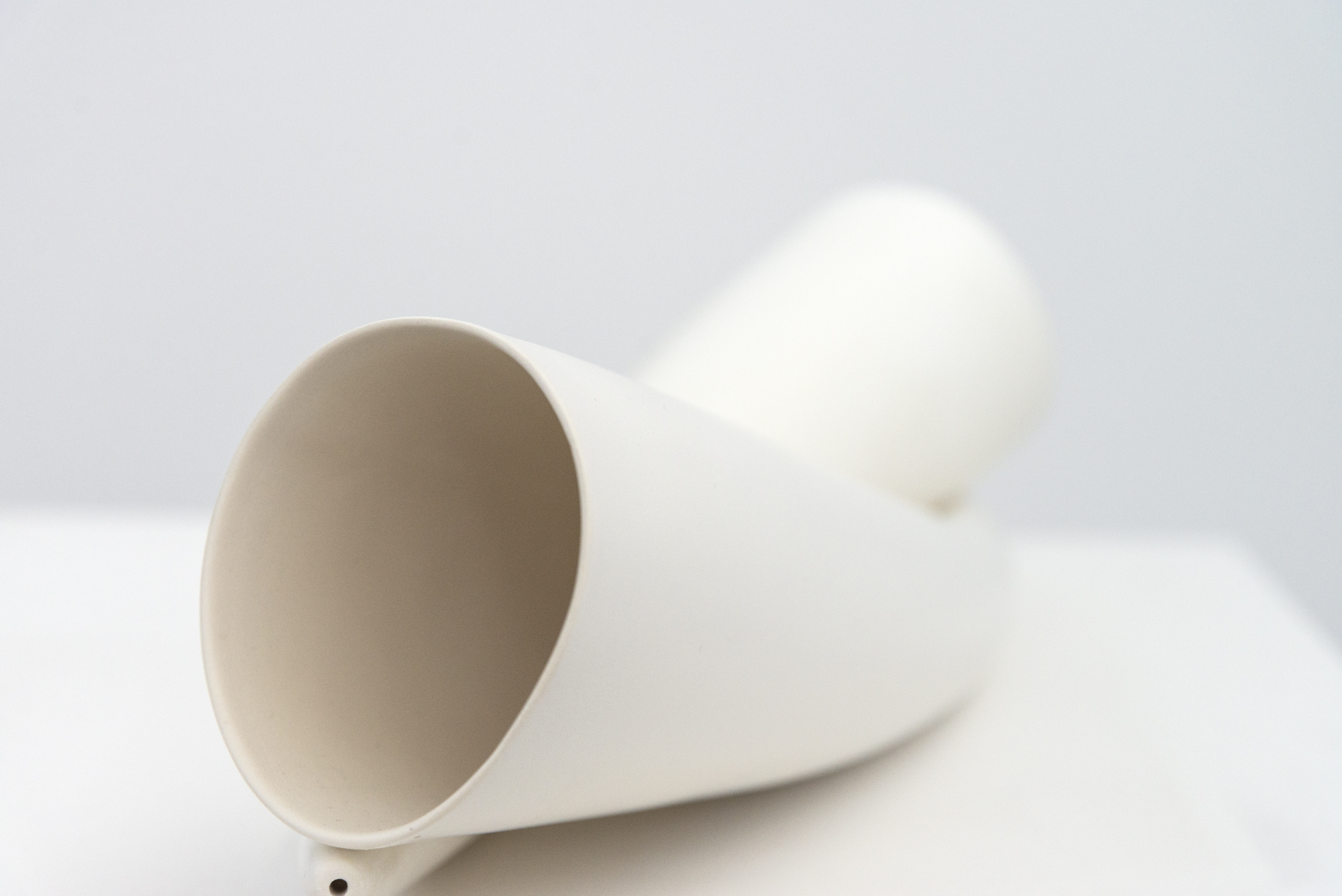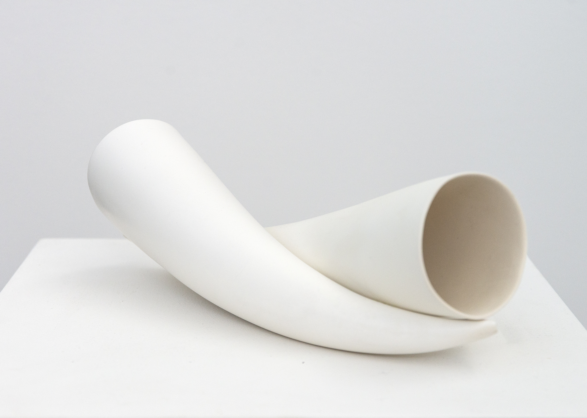 This contemporary white porcelain tabletop sculpture is by Paula Murray.At the core of Paula Murray’s refined artistic practice is a desire to express the fragility of life. Using her own recipe for clay, she creates uniquely beautiful pieces like this sculpture that emulates the shape of two ear horns or trumpets—a historic form used by both indigenous and European cultures as a hearing aid. One of a series of original pieces she created for a 2019 installation called “Who is speaking? Who is listening? The two horns are glazed together.