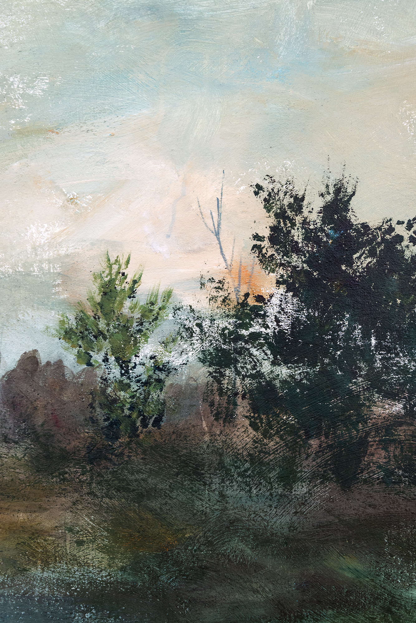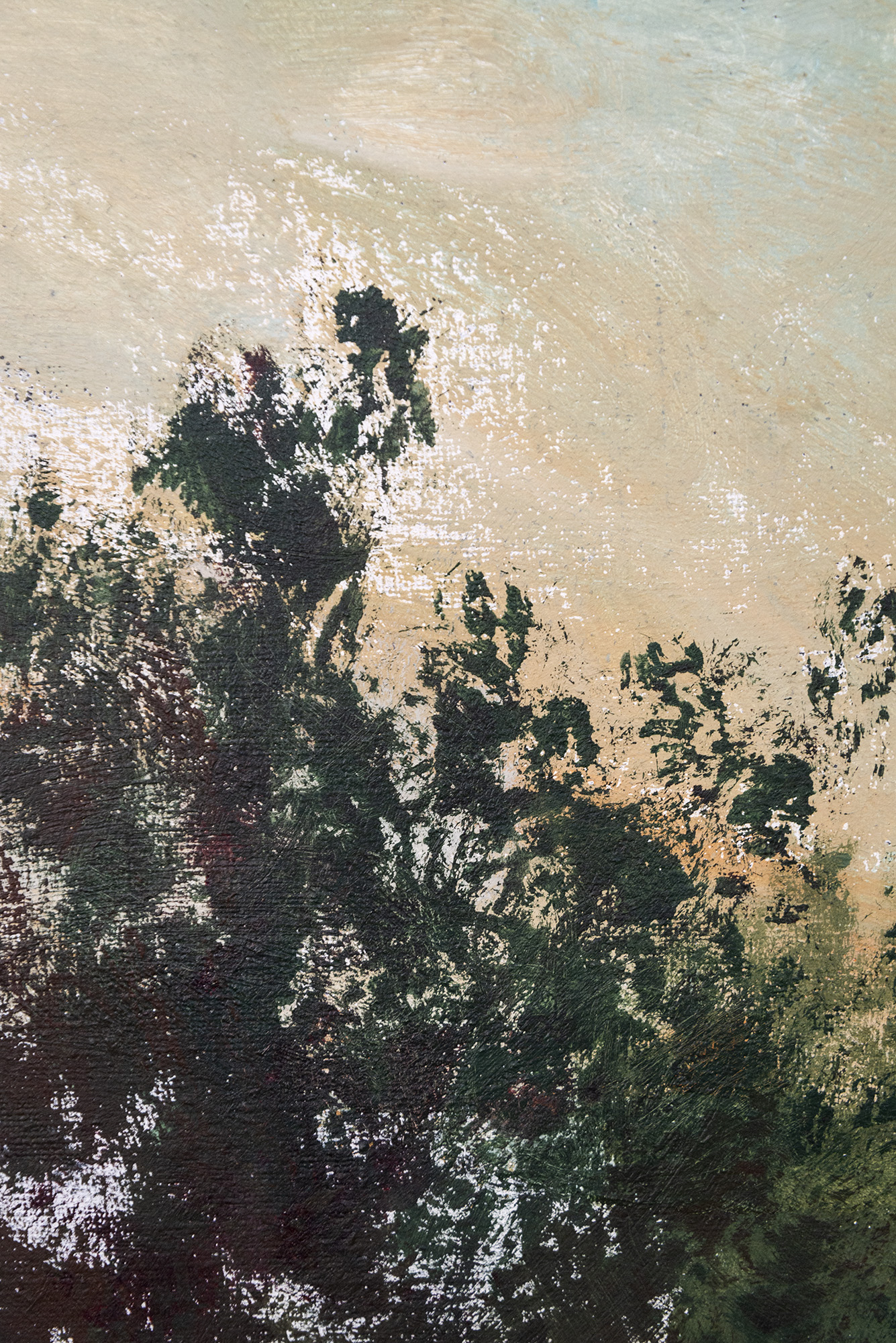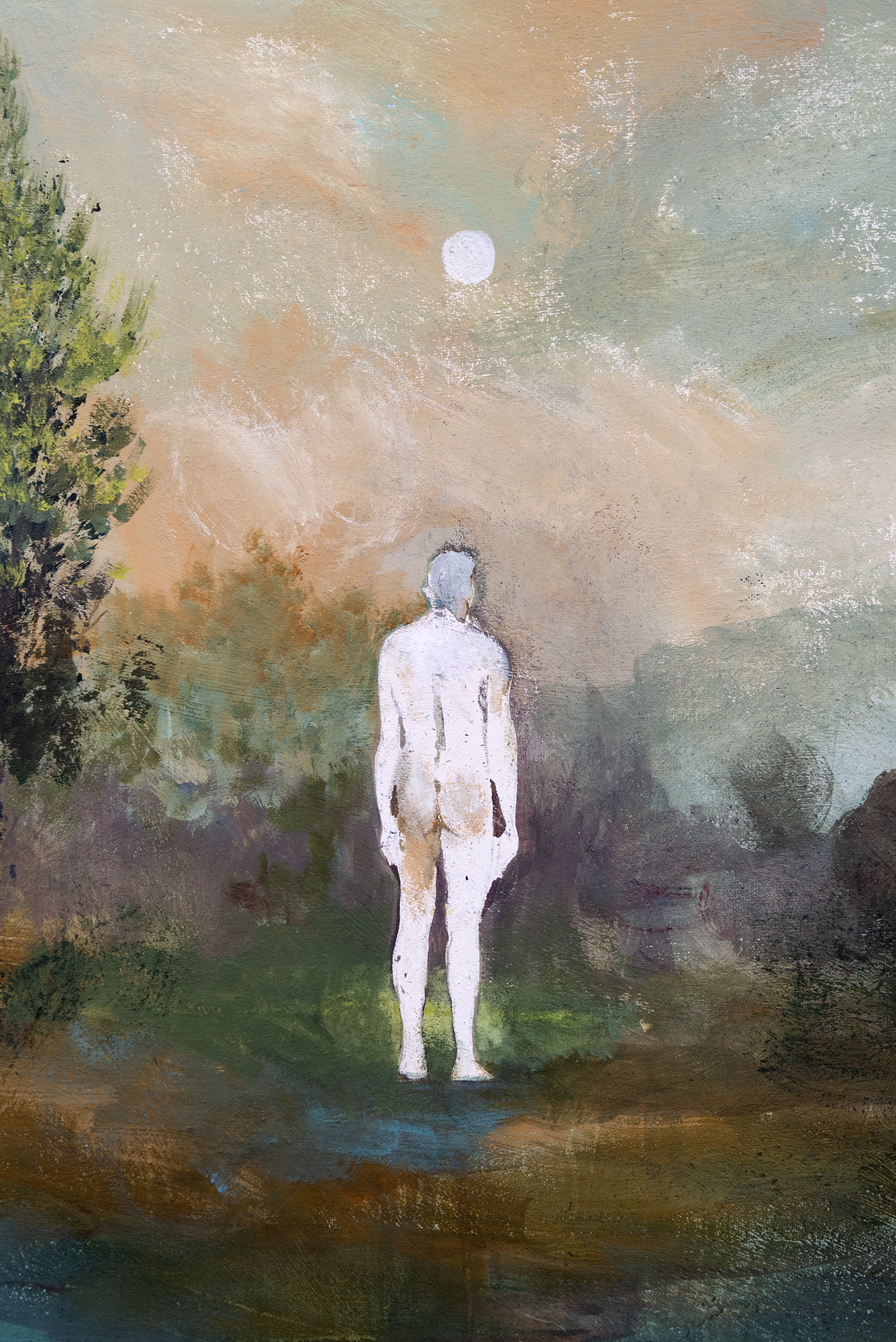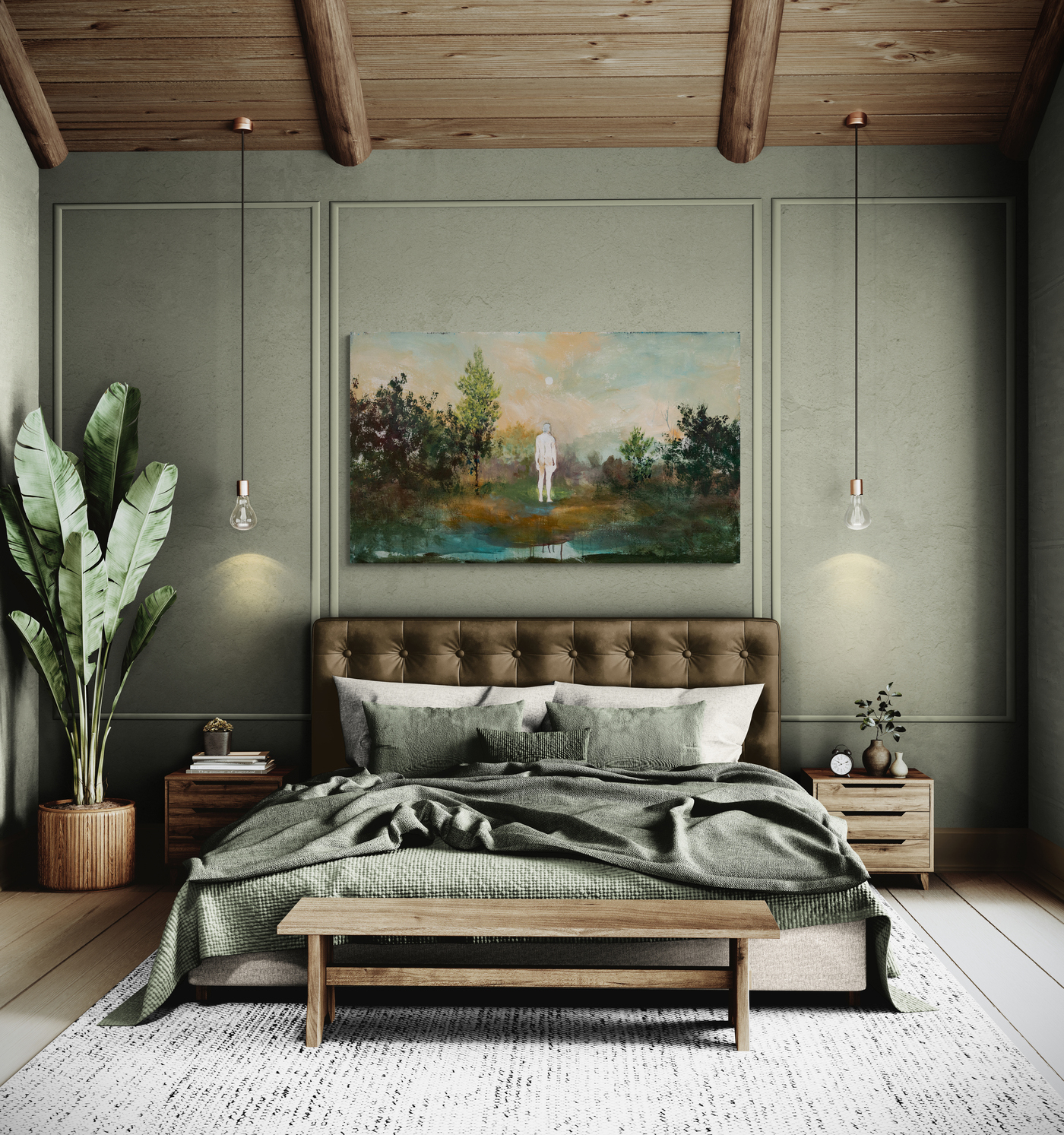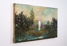 This piece—a unique mix of clay and pigment on jute captures a view of the countryside…with a single human figure in the center—an almost ghost-like white image who appears to be gazing at the moon. The figure is surrounded by lush foliage painted with expressive brushstrokes in deep greens, aubergine, golden earthy browns and turquoise waters. The sky is a mix of soft blues and blush.