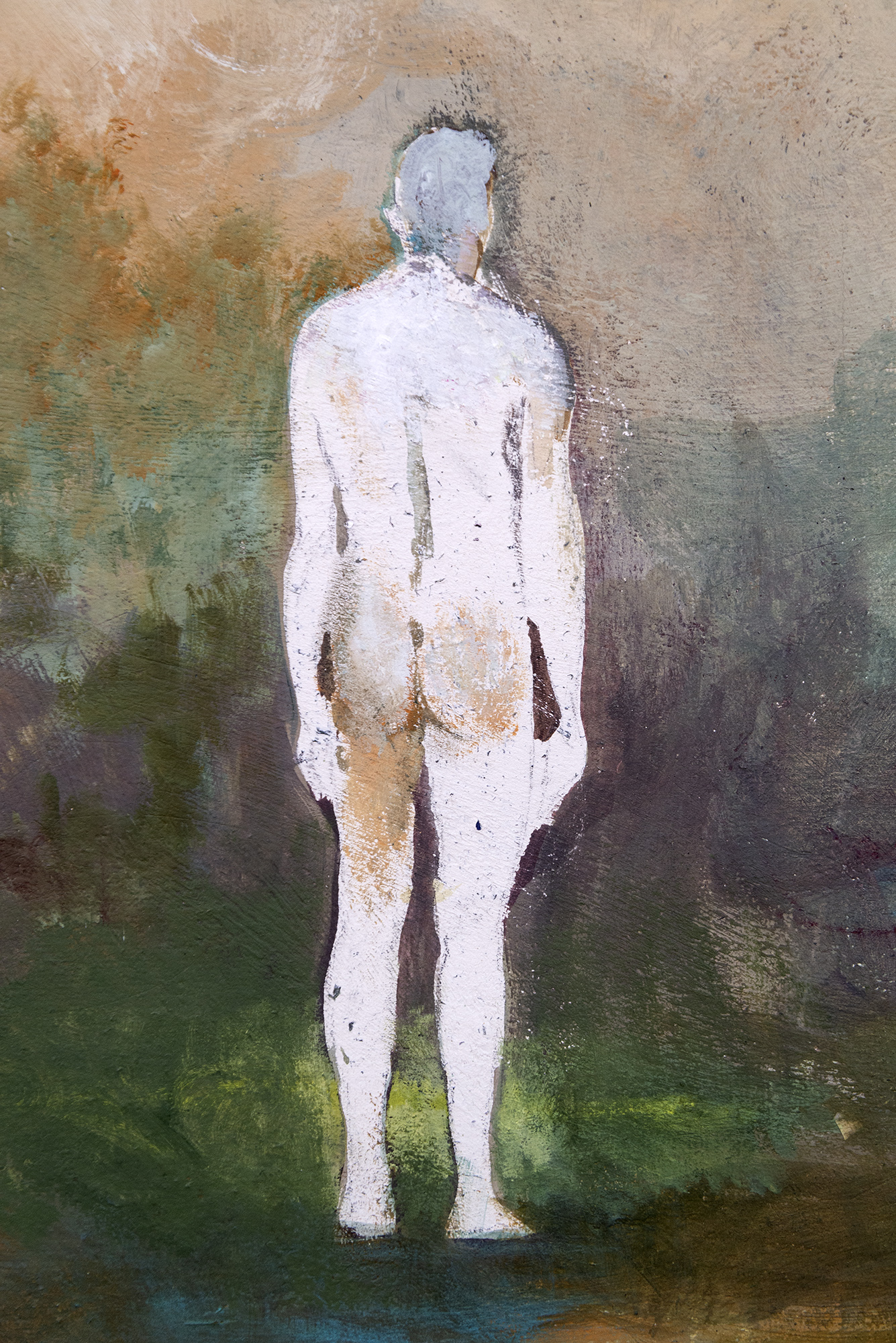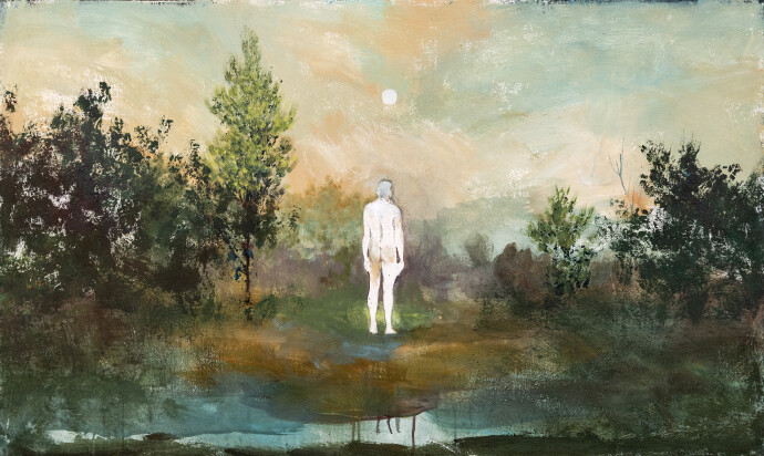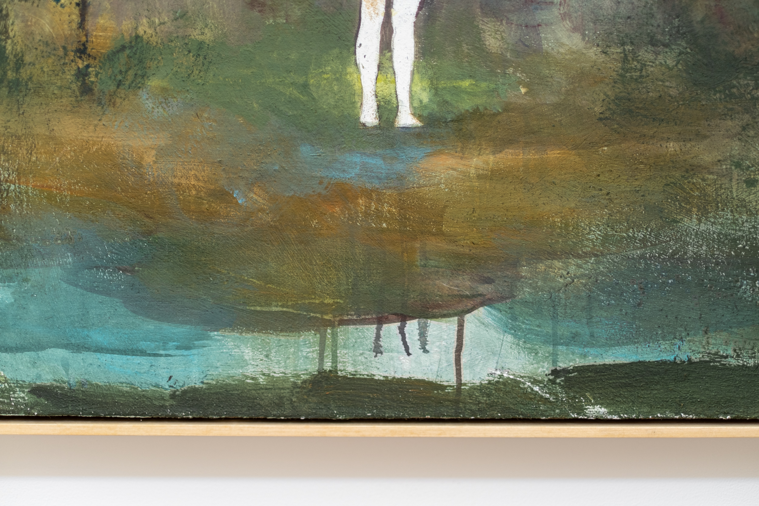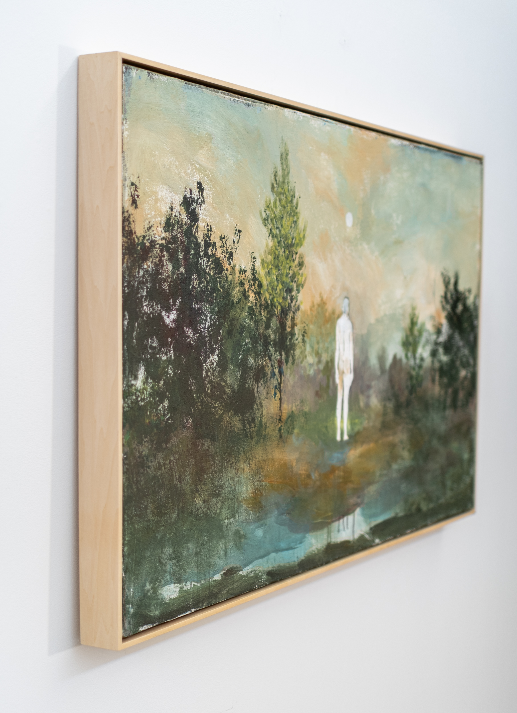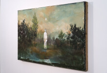 This piece—a unique mix of clay and pigment on jute captures a view of the countryside…with a single human figure in the center—an almost ghost-like white image who appears to be gazing at the moon. The figure is surrounded by lush foliage painted with expressive brushstrokes in deep greens, aubergine, golden earthy browns and turquoise waters. The sky is a mix of soft blues and blush.