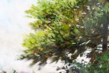 A magnificent mature pine tree stands tall in this serene landscape by Peter Hoffer. The rich green of the pine boughs contrast with the deep turquoise blue of the sky and the pastoral countryside. Hoffer has created an entire series of tree portraits. Each one expresses their individual shape and personality. Known for his romantic landscapes, Hoffer’s treatment of each work on panel and sealed with resin in a high gloss finish is thoroughly modern.“A landscape is continually evolving. Its topography consists of repetitive gestures of surfacing, resurfacing and erosion. Exposed to the elements, scarred by the wind and shifting soils, the landscape reveals its own narrative.” Peter Hoffer
