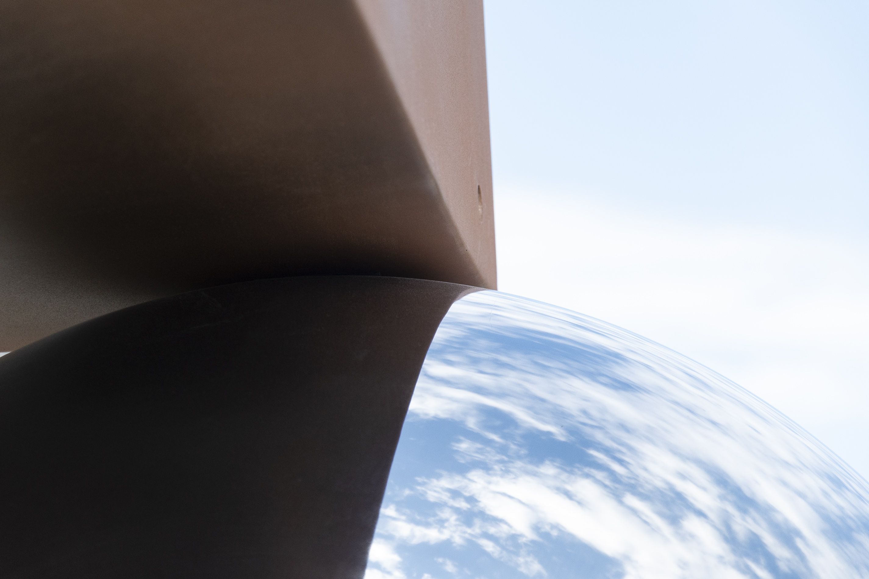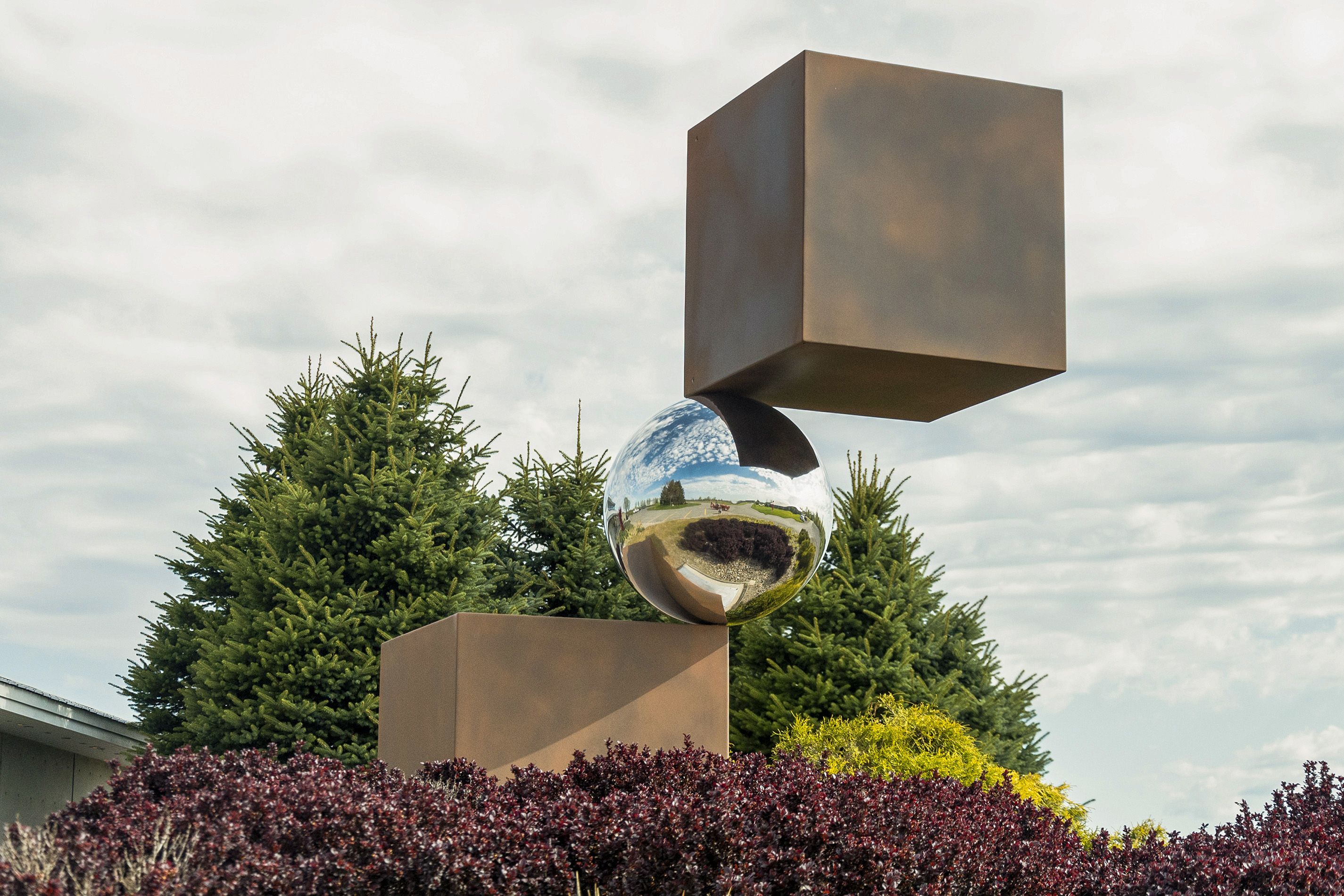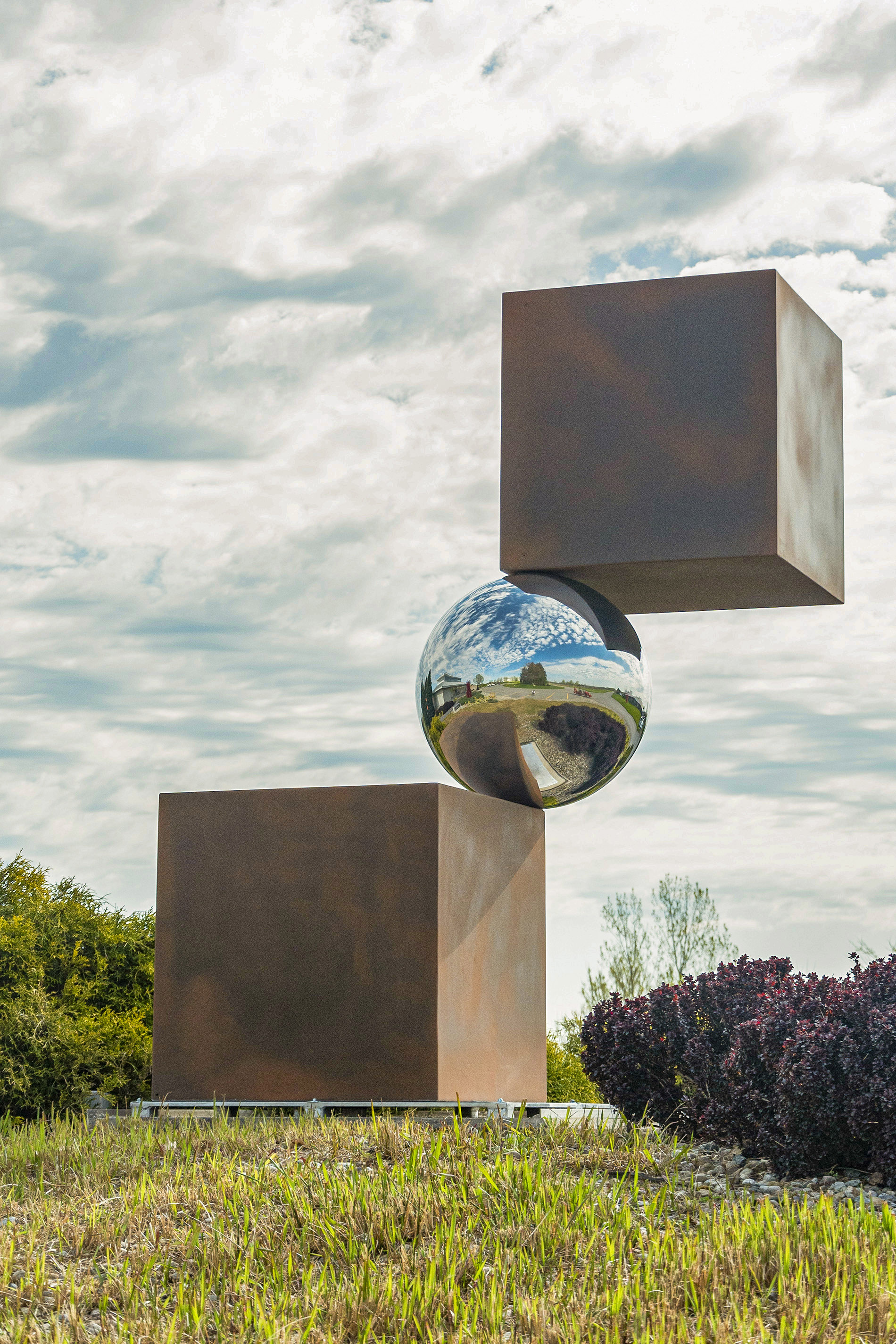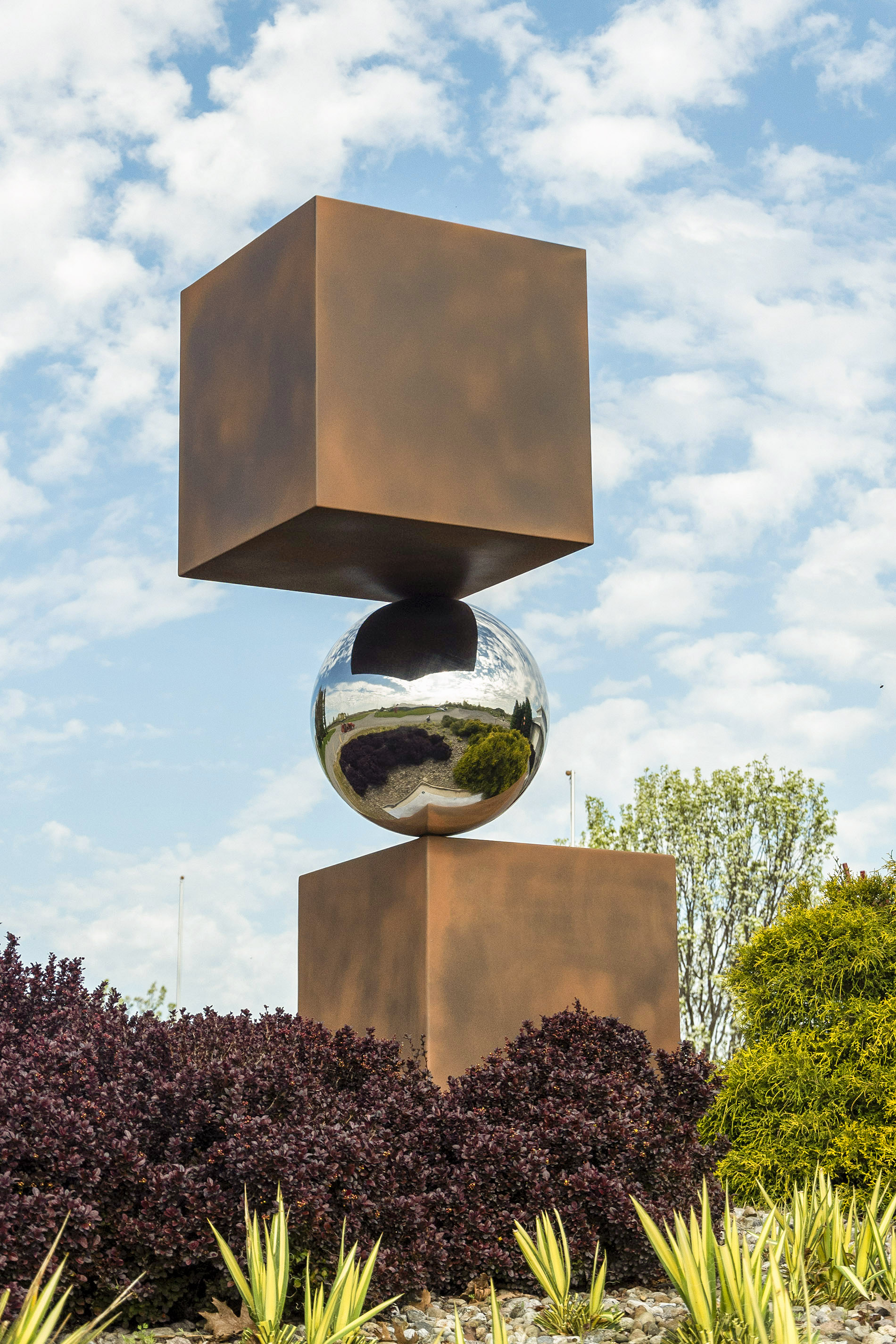 This piece is numbered in an edition of 10. Available on commission. Please allow 6-8 weeks for completion.Philippe Pallafray’s dramatic contemporary sculptures often appear to defy the laws of gravity. This imposing minimalist piece features a highly polished stainless steel ball precariously balanced between two large ‘rusty’ metal cubes. ‘Equilibre’ means ‘balance’. The sculpture appears to sit in dramatic contrast to its natural environment and yet also mirrors it back to the viewer through the reflective surface of the ball. ‘Rouille’ means rust-coloured in English.