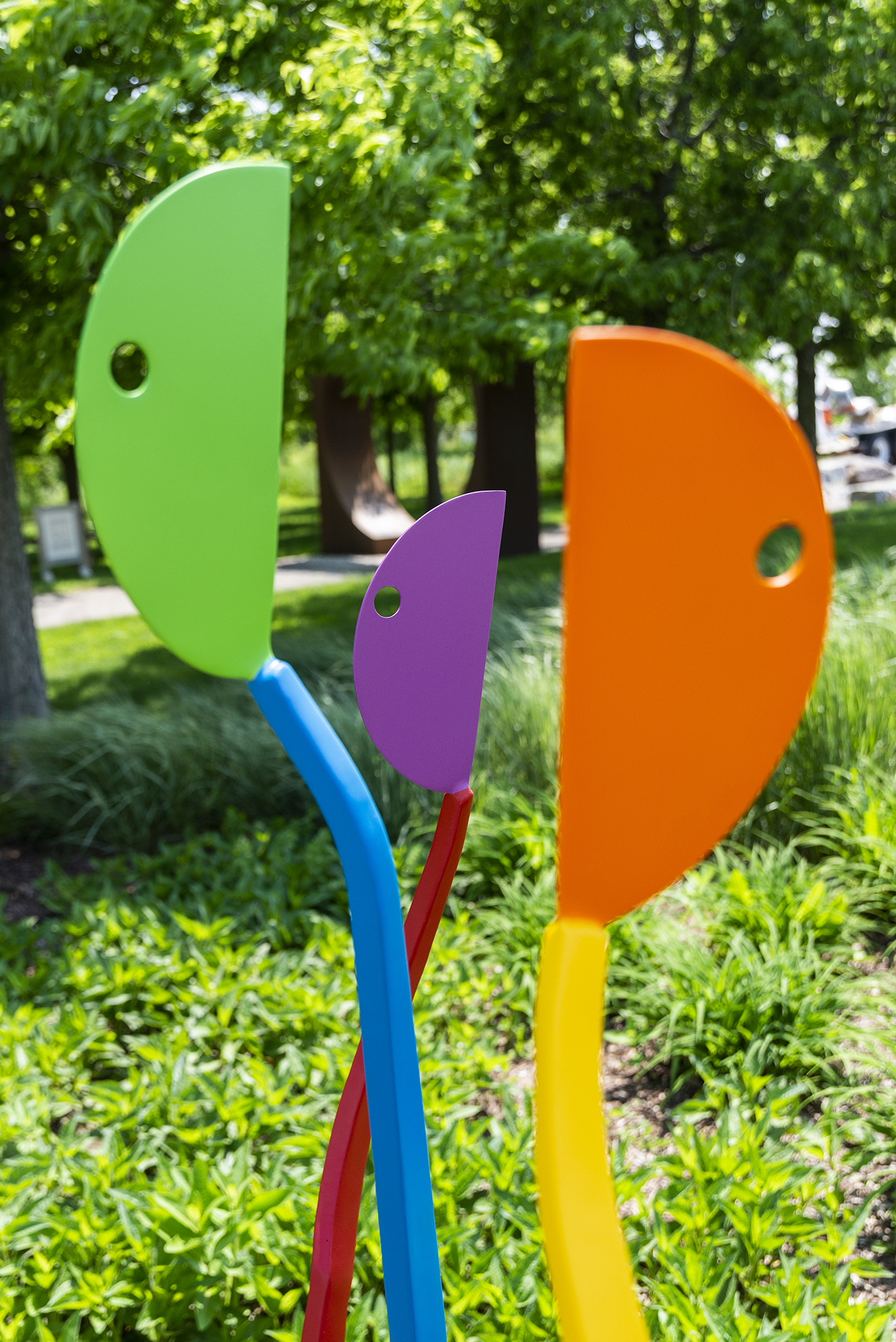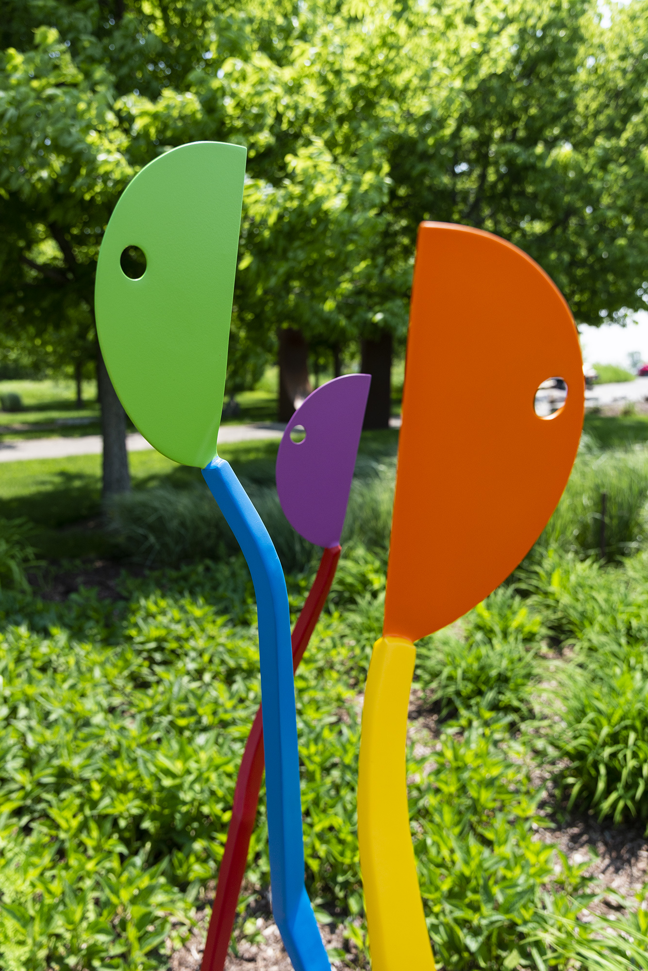 The engaging, theatrical and colourful work of Robert Clarke-Ellis has found an audience in both Canada and the U.S. Known for his simple, minimalist form, the Canadian artist uses steel to forge human-like forms that are painted in brilliant colours. Here, three slender figurative pieces stand together, rendered in a contemporary palette of bright orange, yellow, lime green, blue, purple and red.