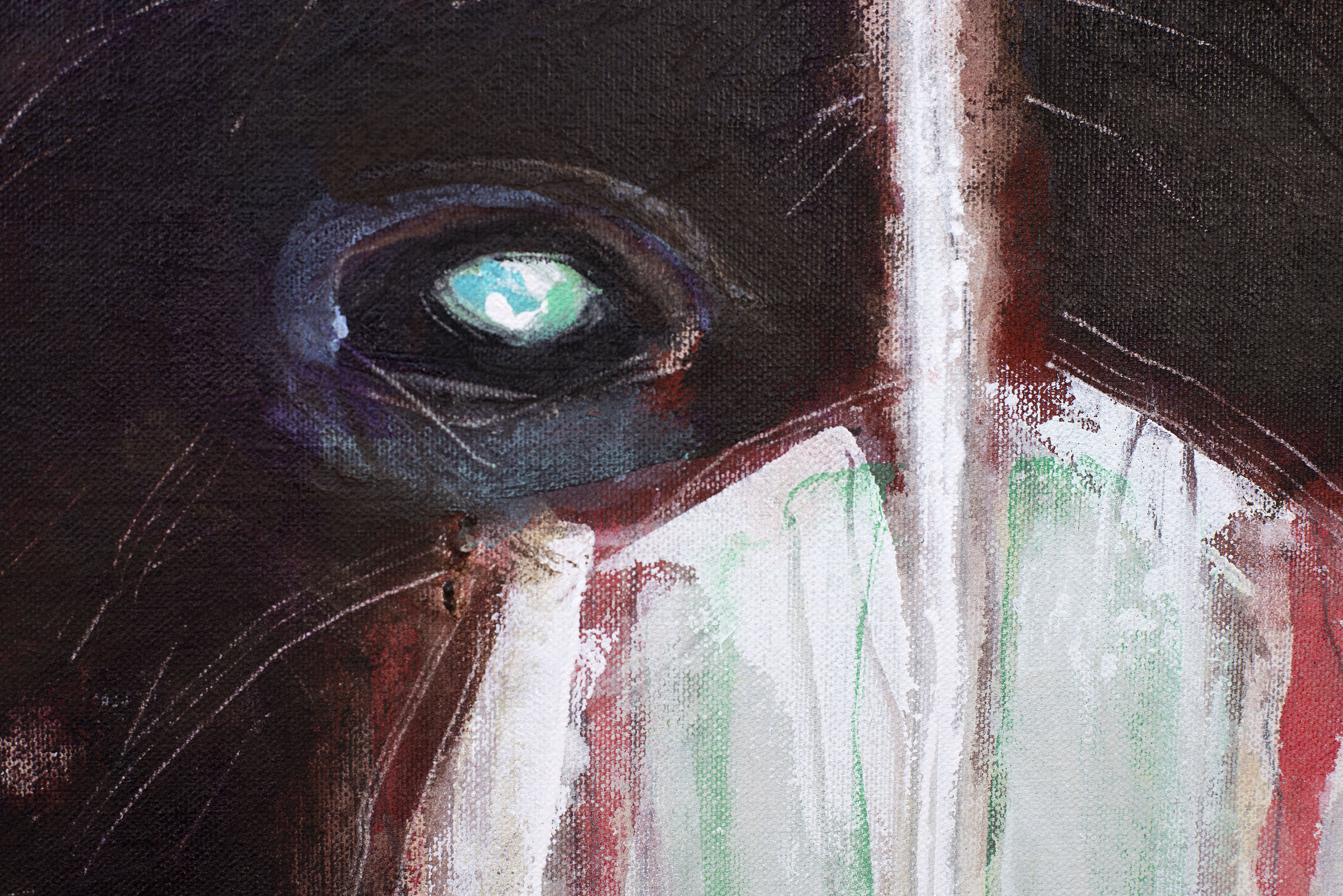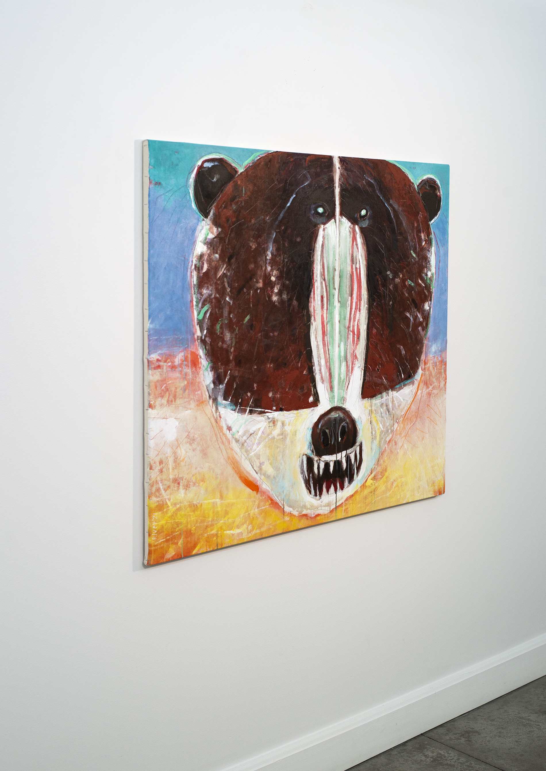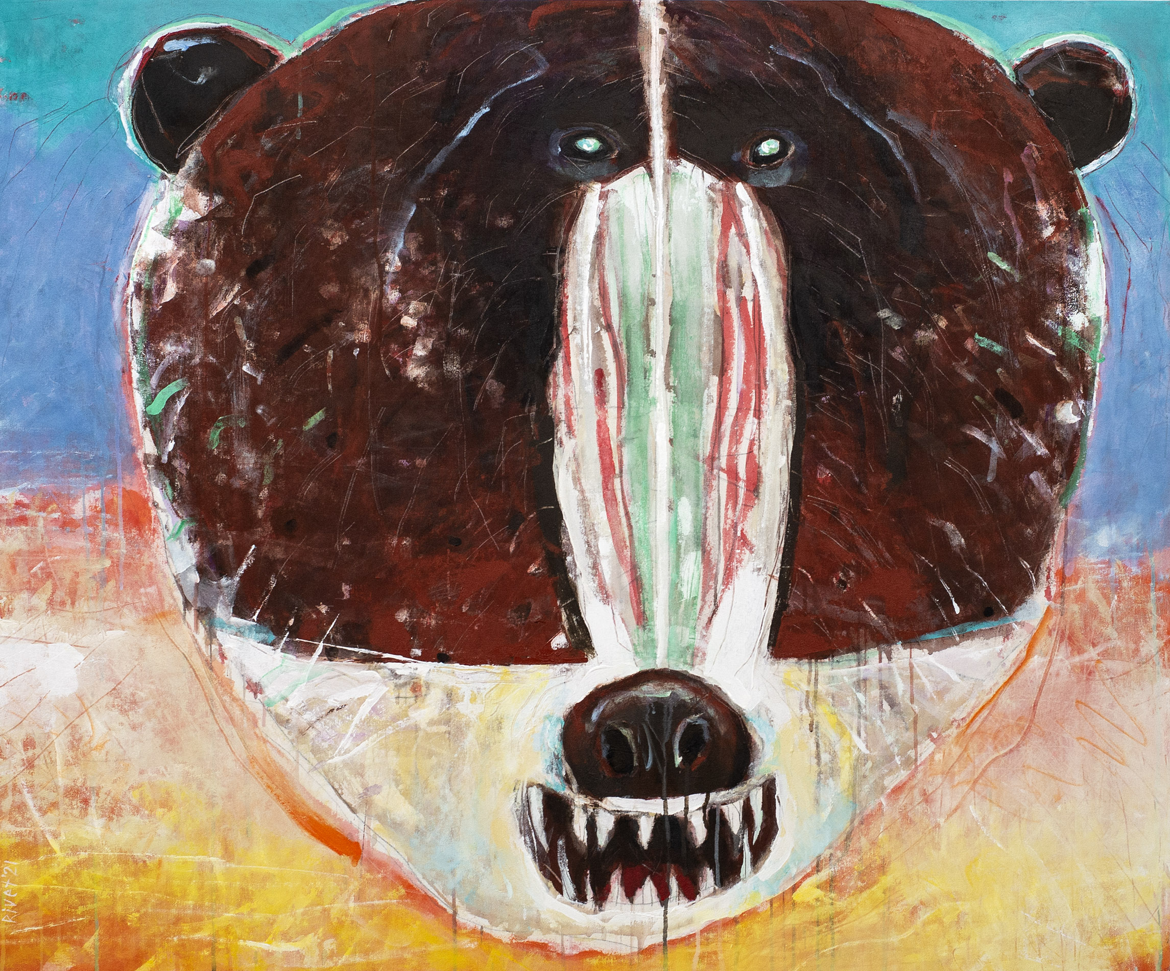 In many indigenous cultures, the bear is seen as a symbol of wisdom, as a guardian, teacher and leader. For Metis artist Rick Rivet, this powerful image of a grizzly bear’s head pays homage to that ancient idea. Inspired by his own rich culture and history, Rivet creates colourful, abstracted paintings often rooted in the natural world. Rivet’s grizzly is looking directly at the viewer rendered in chocolate brown, white, red and green against an expressive wash of yellow, orange, sky blue and turquoise."This artistic perspective involves beliefs centred in myths and dreams, both individual and collective, in a culture which has as its central figure, the shaman. It is a ‘nature-oriented’ belief system and ideology, a holistic world-view.” Rick Rivet