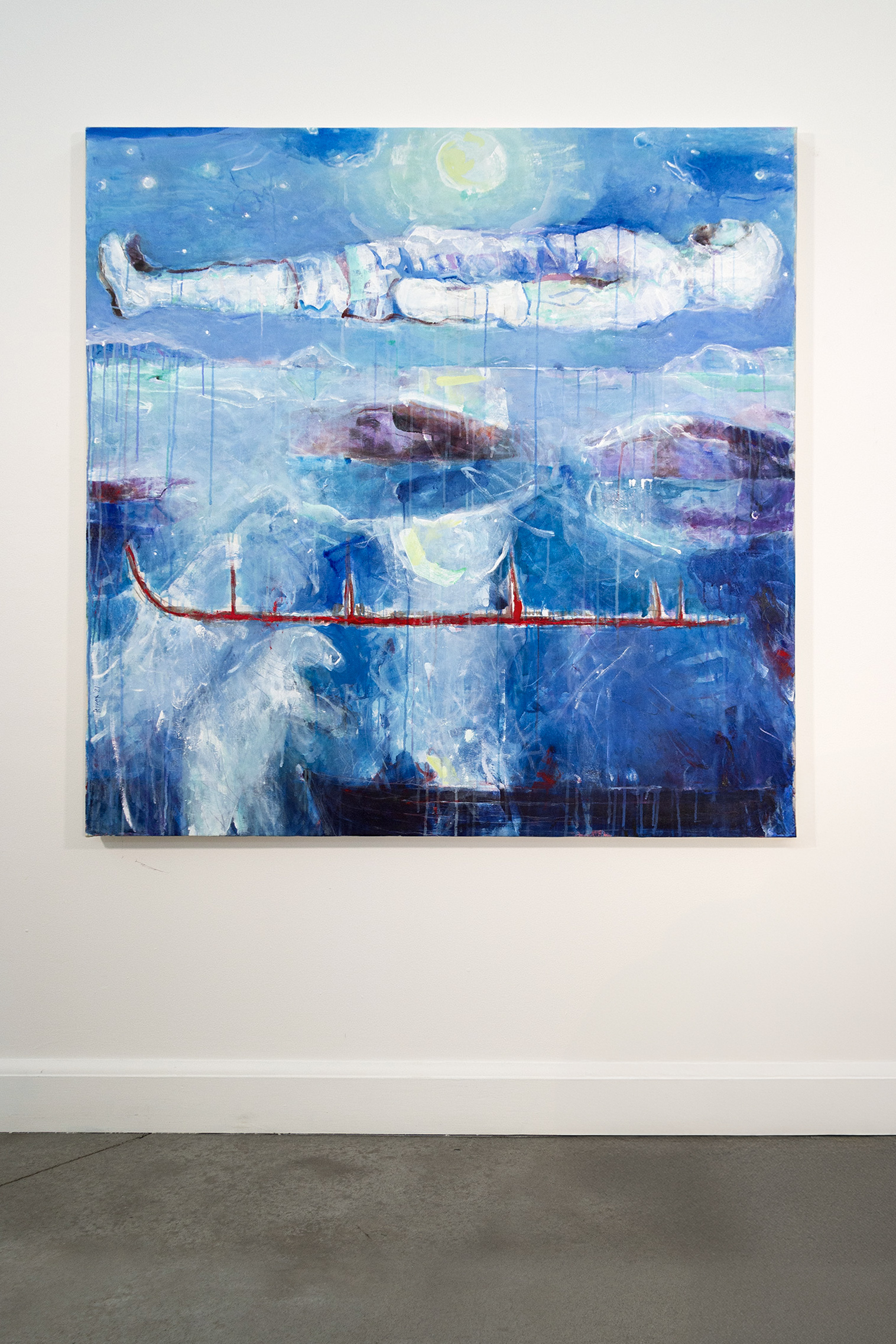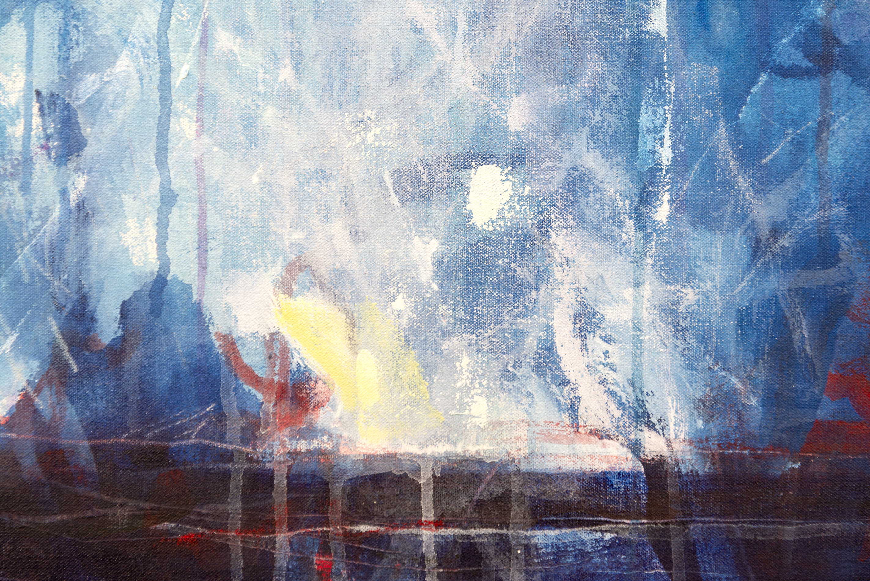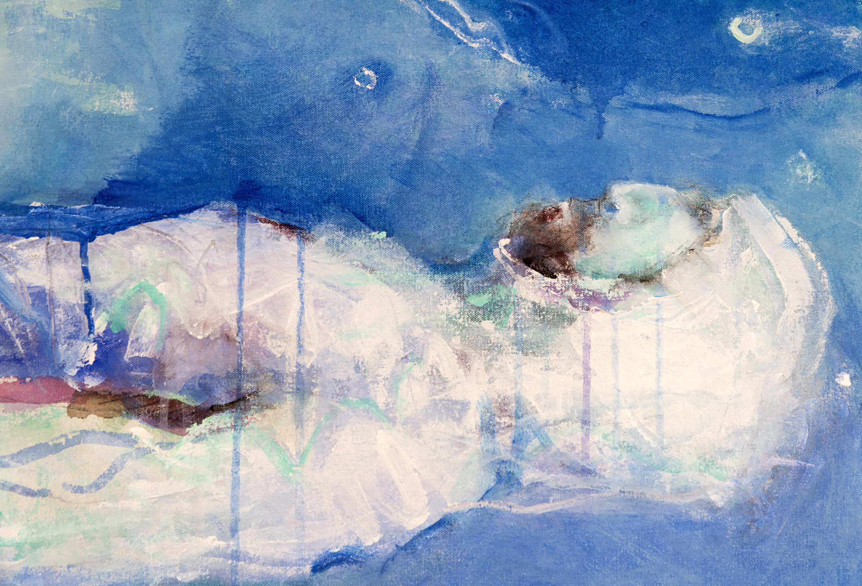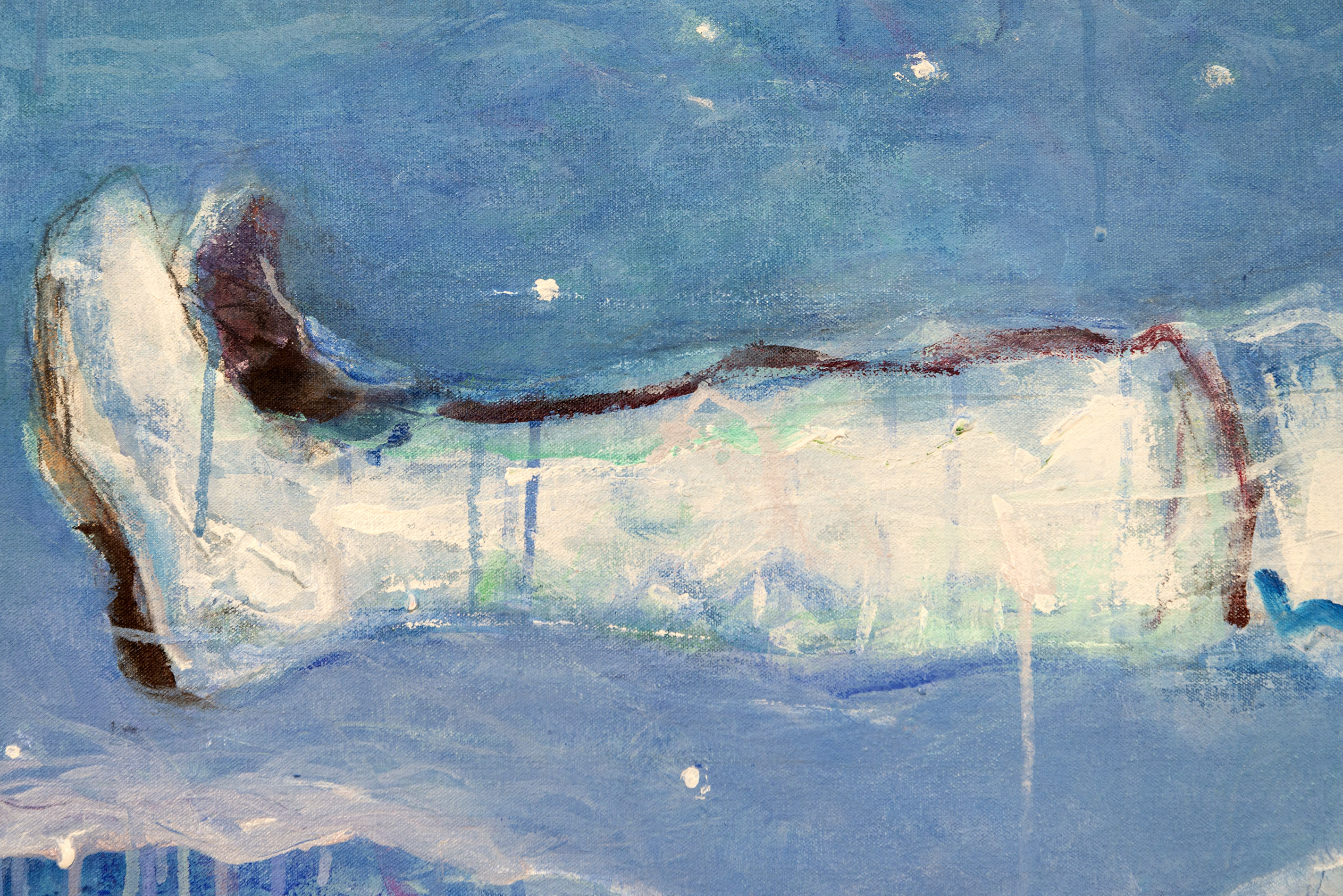 The haunting images of a doomed 19th-century Arctic exploration are the powerful theme behind this series of abstract paintings by Rick Rivet. They memorialize the tragic story of a British expedition led by Sir John Franklin that sailed into glacial waters in the winter of 1845 despite warnings from the local indigenous population, became trapped in the ice and died. In this painting, a corpse in white appears to float in a blue sky, above the landscape and turquoise waters. The dark image of a ship lies on the bottom of the frame; a red line above it appears to represent a navigational path. The abstracted form, expressive markings and paint drippings are enhanced by a rich palette of blues, white, red and black.“The approach is Expressionist/Primitivist with concerns related to aspects of my Native-Canadian reality and viewpoint. These concerns are expressed in two ways – in relation to the shamanistic/spiritual tradition and the historical/cultural/socio-political/eco-environmental viewpoint in the examination of issues related to my experience.” Rick Rivet