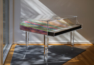 To create the piano, she works with a talented team of acrylic glass artisans who craft the piano’s body and its keyboard. Using laser technology, thousands of holes are drilled both by computer and by hand to ensure that all of the threads are perfectly parallel. She is currently working on a series of transparent stringed instruments.
