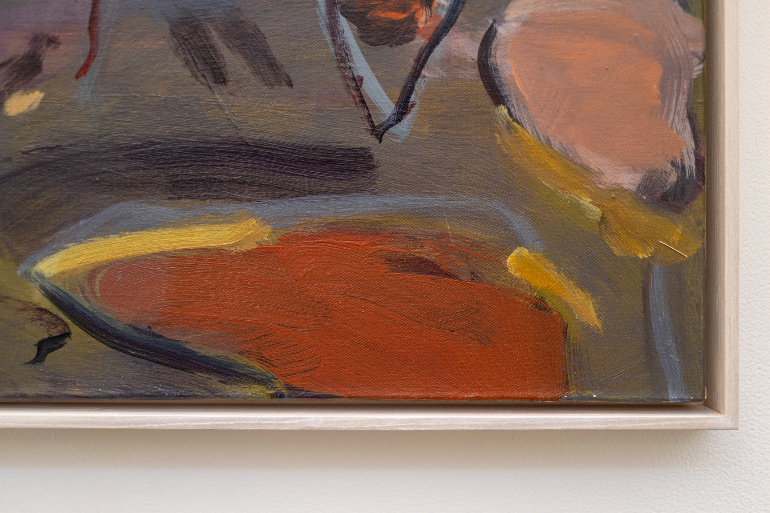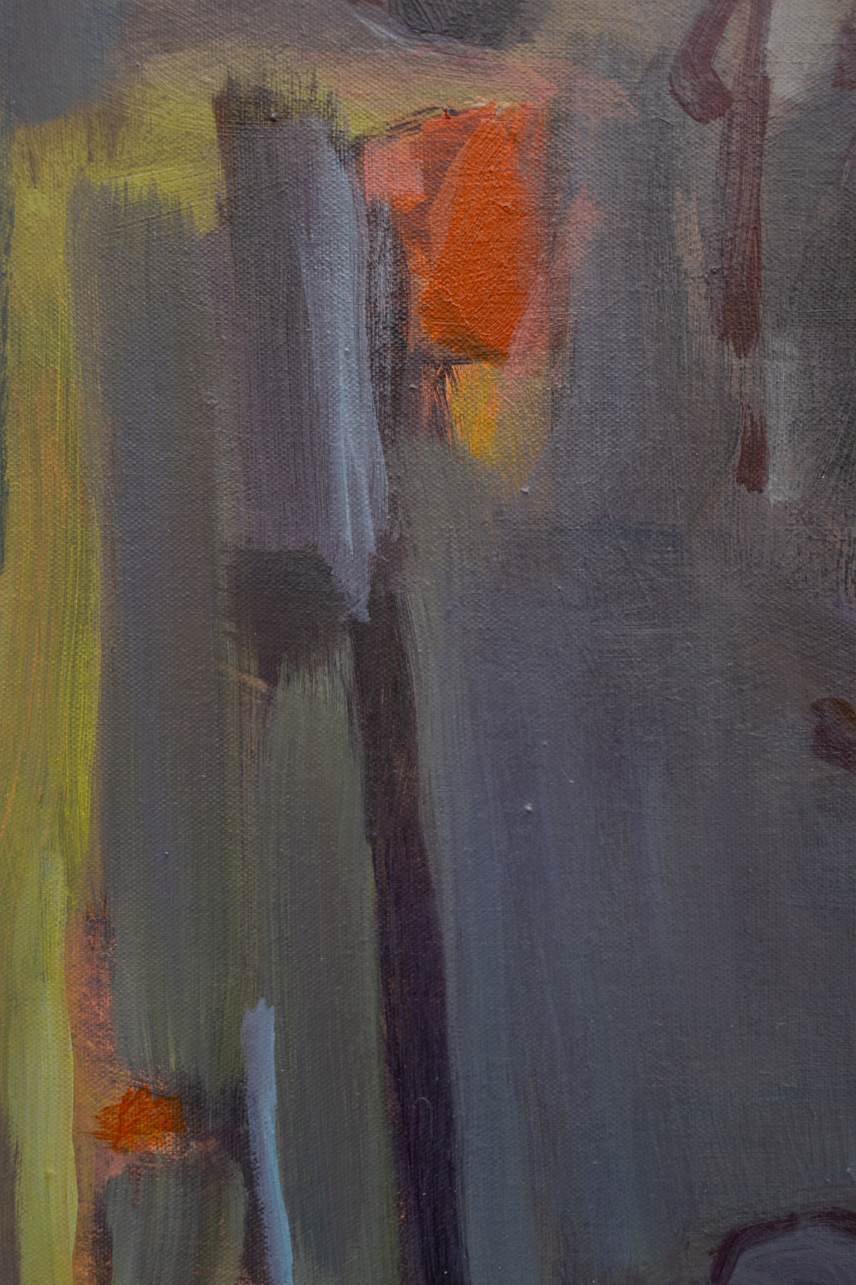 With Blue Hour, this horizontal composition is anchored by a rich, dark, gray-blue backdrop. Across the surface, she ‘draws’ with paint--expressive brushstrokes and calligraphic marks in black, aubergine, melon, golden yellow, and orange unfold in layered, muted tones. These forms suggest leaves, flowers, petals, and vines that appear to “dance” across the canvas. Sandra Goldie’s work feels alive with movement—something she attributes to her early exposure to the freeform rhythms of jazz. One of the series entitled “mingled yarn.”