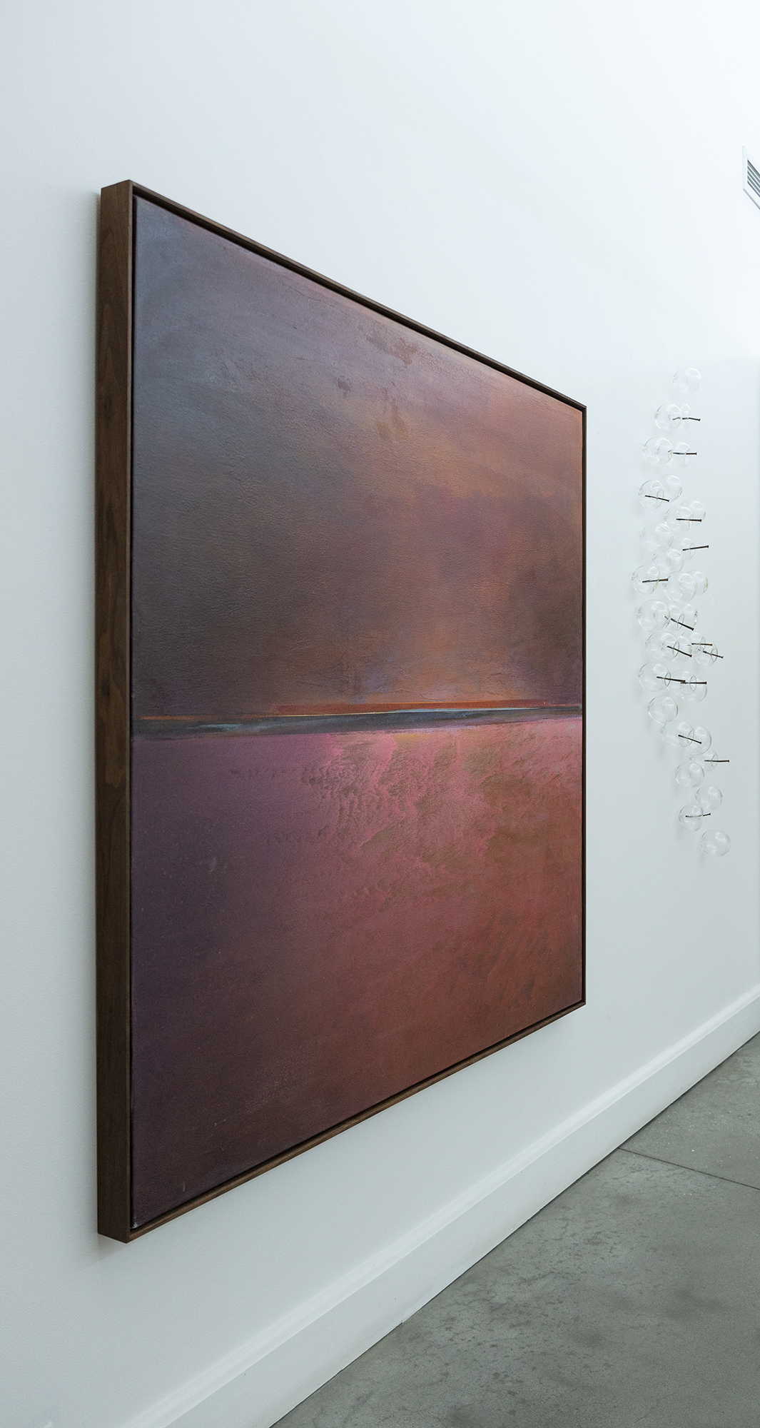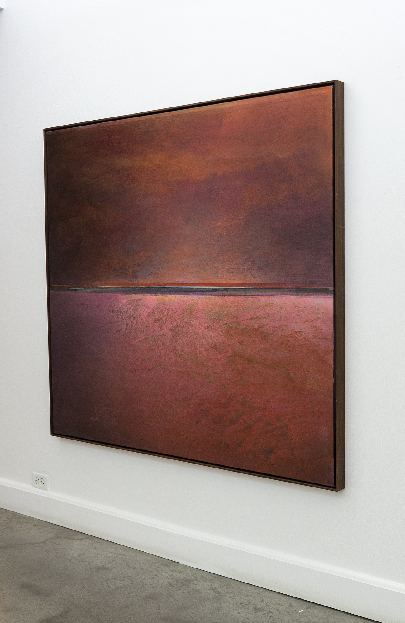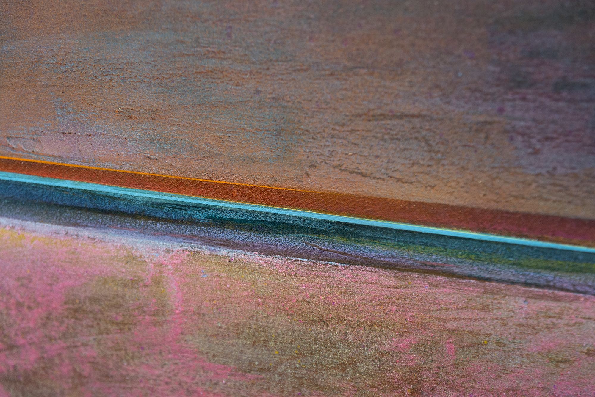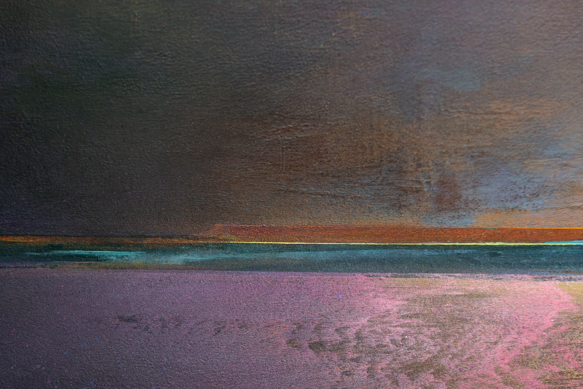 That primal experience has inspired Roger’s signature ‘horizon line’ that separates the colour field of her landscapes into two hemispheres. This piece in a rich melange of pinks, reds, and purples features a dividing line of turquoise, blue, green and black. Rogers is highly regarded for her masterful use of gestural brush strokes, intense colour, light and texture. As an artist, she has been influenced by William Turner, Mark Rothko, Agnes Martin, Antoni Tapies and her own father, the celebrated sculptor and painter, Otto Rogers.