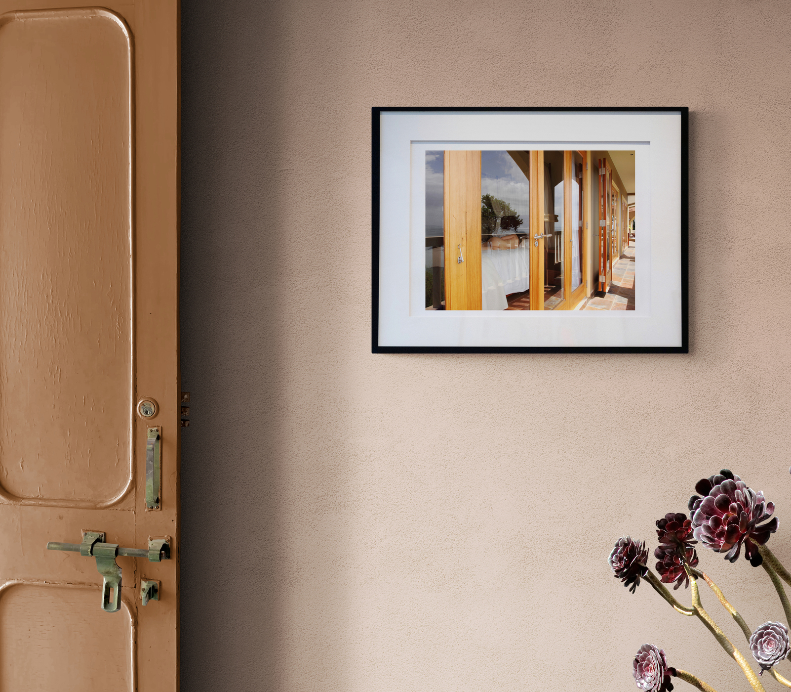 In this compelling image by Shani Mootoo—the strategic framing of the photograph draws the viewer’s eye down the length of a long, bright corridor past a succession of glass French doors. But a resting figure on a white bed just visible behind the glass draws the eye inside. This creates a tension between interior and exterior, between known and unknown, public and private. There is a quiet voyeurism at play here. This is Mootoo’s signature—engaging photographs of interior spaces that invite the viewer to discover a personal story. This giclee print is number 1 from an edition of 10.“The manner in which I take a photo is very much assuring me that what I saw was there—particularly in this day and age when truth and reality seem to be contentious and subjective.” Shani Mootoo