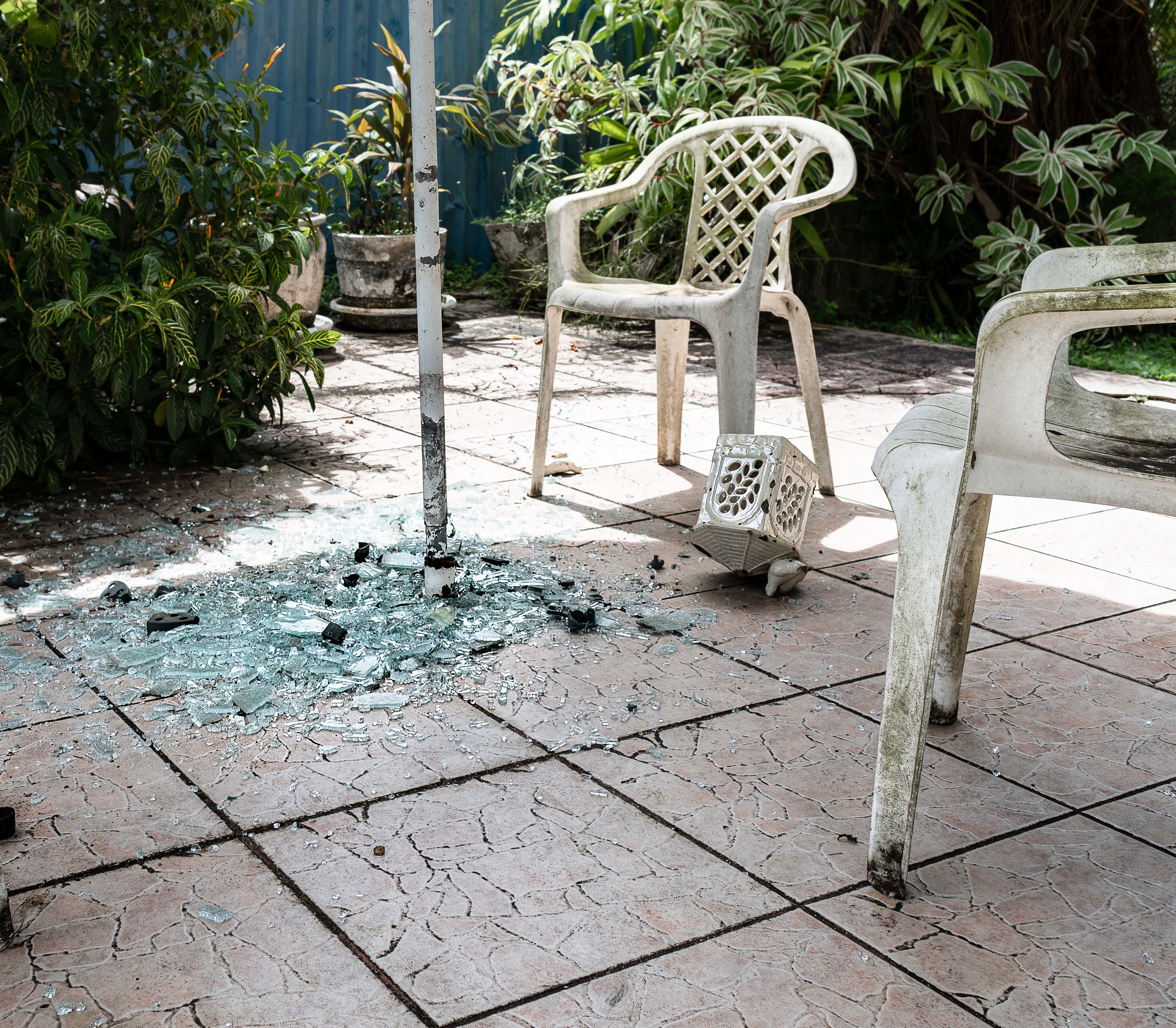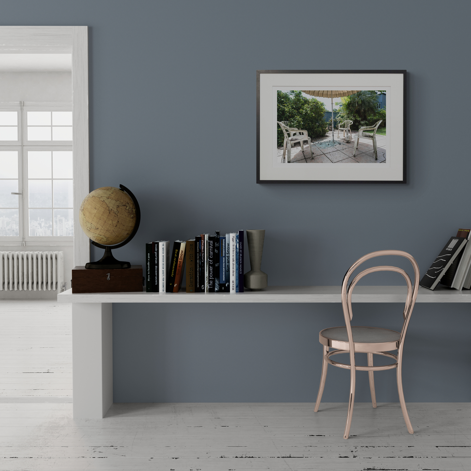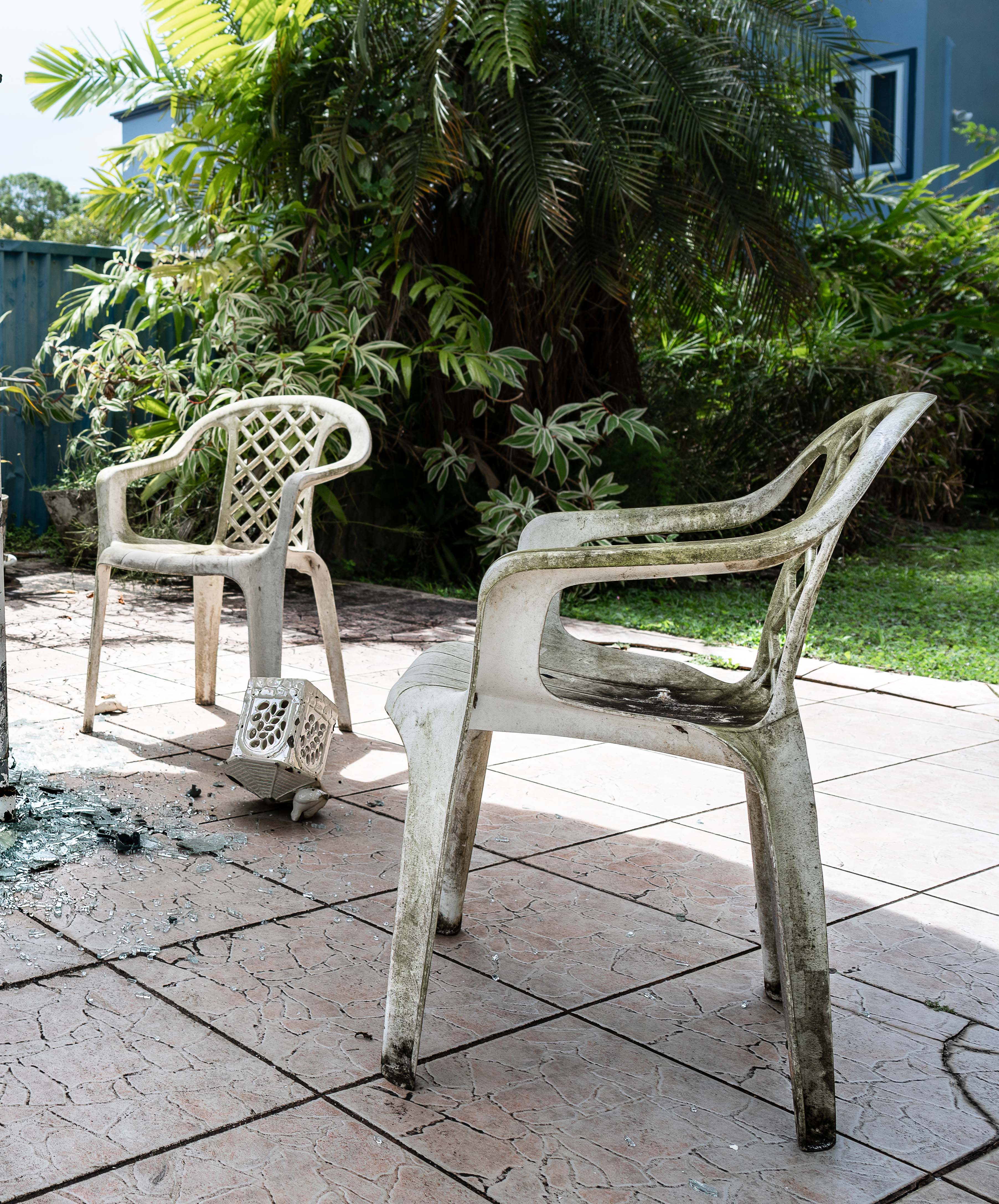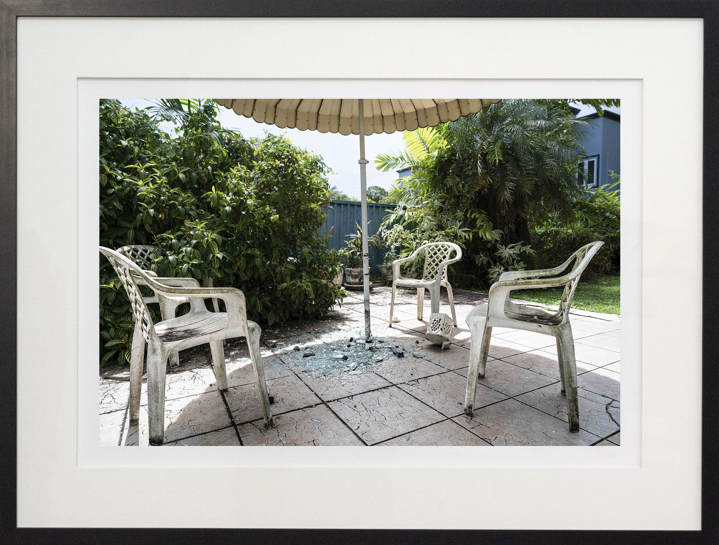 Compelling, enigmatic and ultimately real, Shani Mootoo’s photographs of her childhood home in Trinidad chronicle a life. This is one in a series of images the artist calls the ‘History Revisited Series’ that provide richly detailed, uncurated records of the house—inside and out that she grew up in. The patio is surrounded by lush tropical greenery, an open umbrella shades three dirty plastic white chairs; glass from a broken lamp is scattered on the patio stones. What do you see?This giclee print is editioned, 1/8. The work is matted, framed. Framed size is 25 x 33 inches and is available in two additional sizes, 21 x 31.5 inches (30.5 x 40 inches framed, edition of 5, $3,400); 12 x 18 inches (21 x 27 inches framed, $2,000.)