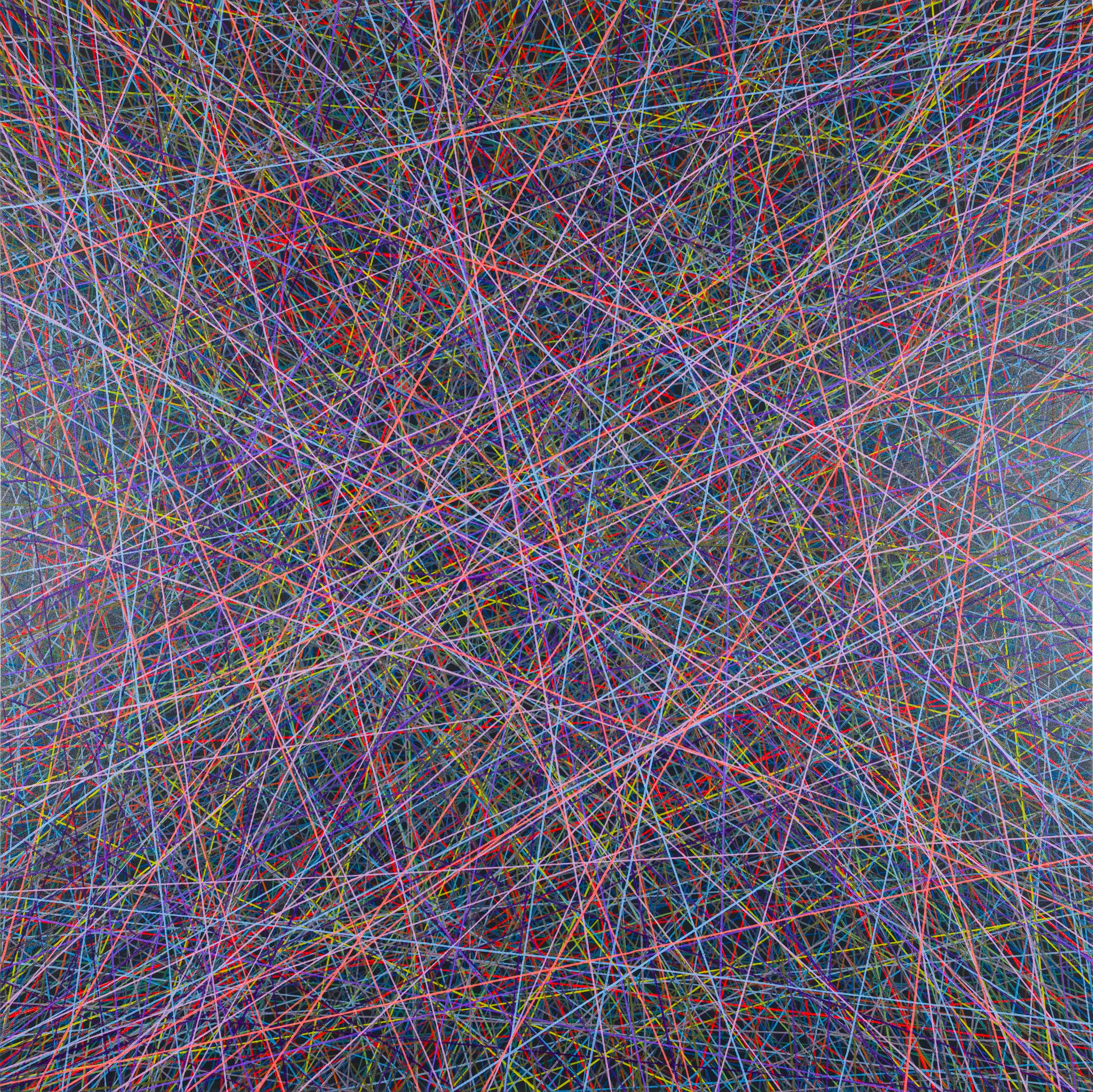 Shayne Dark calls his extraordinary new series of dynamic oil paintings—'calculated chaotic colour.’ The Canadian artist is known for using expressive bold colours in his contemporary artwork. Inspired by a recent trip to Northern India and the heady vision of rich colours in that ancient land, Dark’s highly textured intersected series features hundreds of angled lines. Rendered in violet, pink, yellow, green, and blue play against a neutral backdrop. The lines are layered and run vertically and horizontally across the canvas—a virtual web of energy and colour. Number six in a series of nine.“When viewed from a distance, the lines look sharp edged however as you get closer to the painting it becomes obvious there is a texture to each line of colour.” Shayne Dark