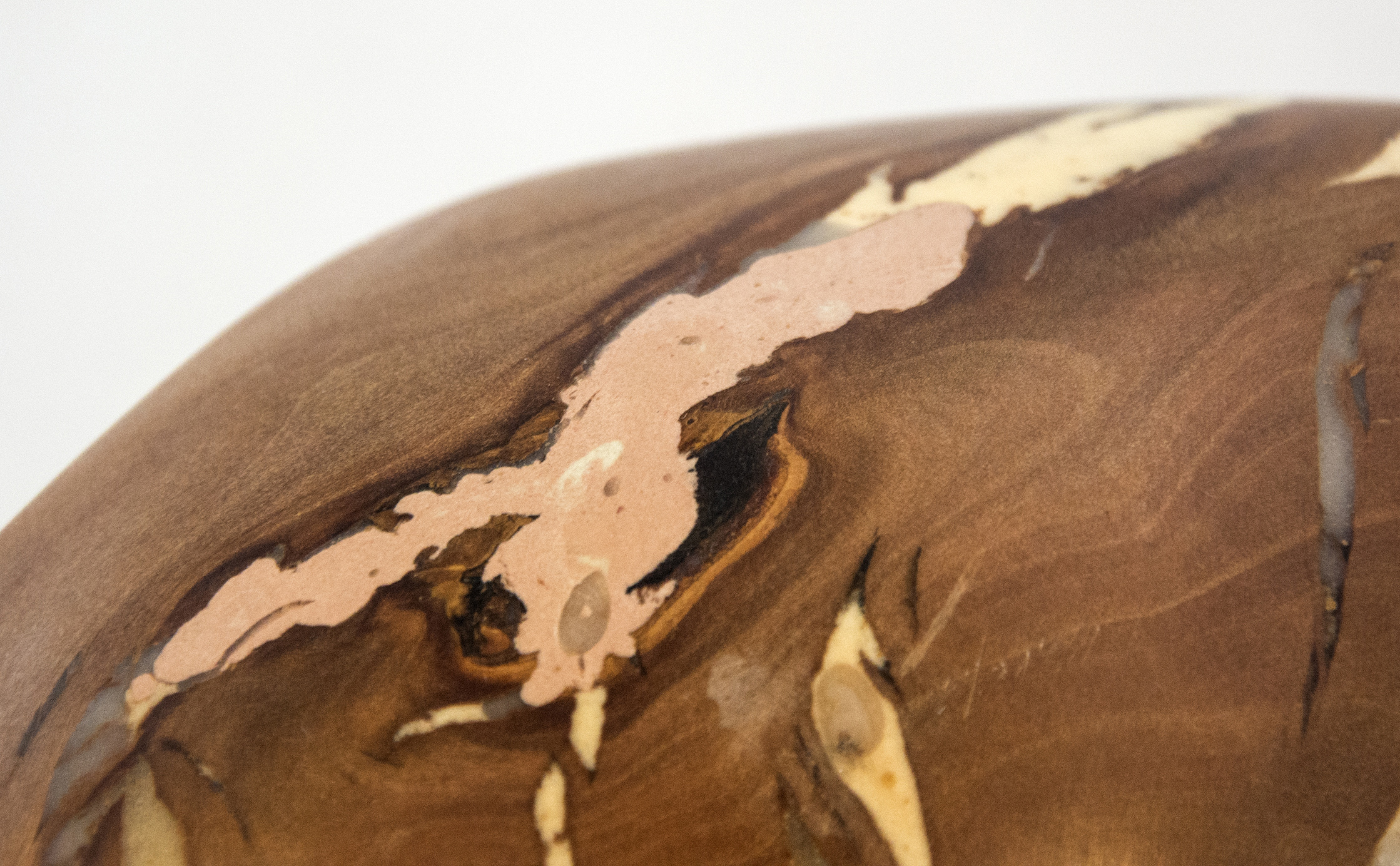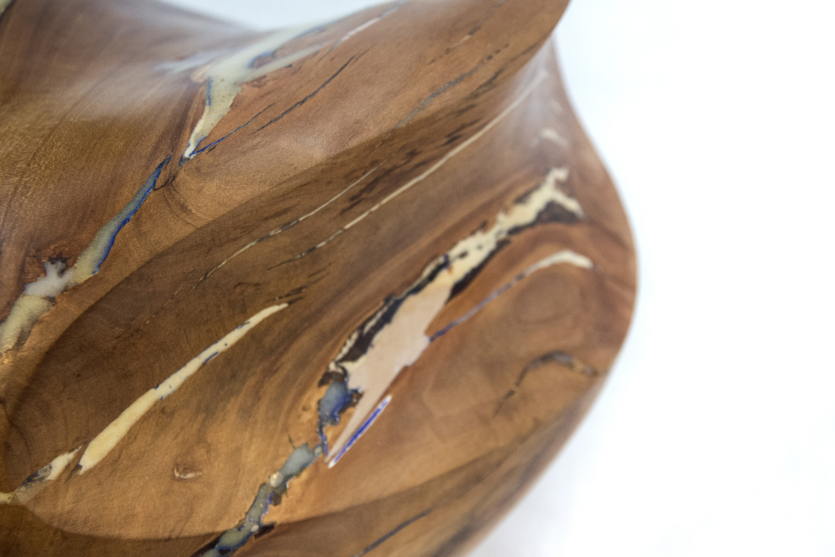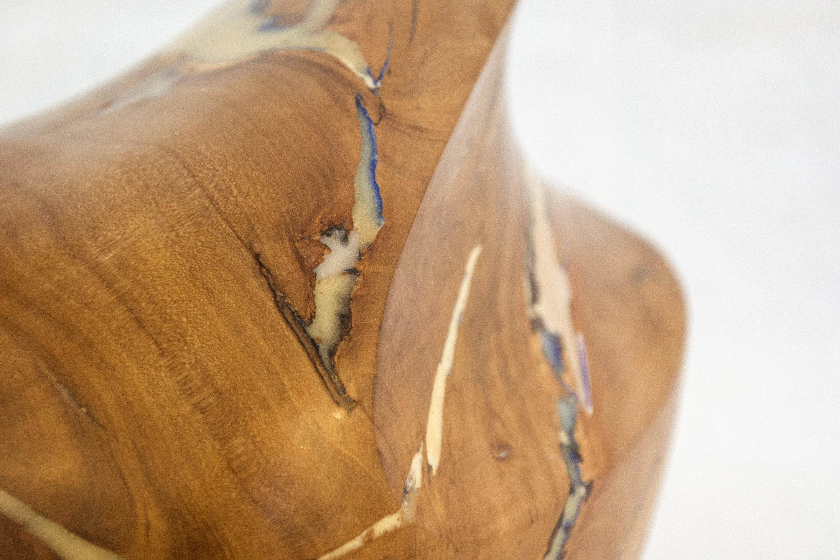 Applewood burls from orchards in Prince Edward County, Ontario were collected by master sculptor Shayne Dark to create this unique piece, one of a series.Historically, local apple farmers were paid by the government to cut down healthy mature apple trees to help control the market for apples. Dark stripped the bark from the remaining dense knotty burls and allowed them to dry for several years. While repairing the cracks in the dried burls, he was reminded of the Japanese art of fixing broken pottery--Kintsugi. Their philosophy views breakage and repair as part of the history of an object. Dark decided not to coat the burls in paint, leaving their natural beauty exposed.