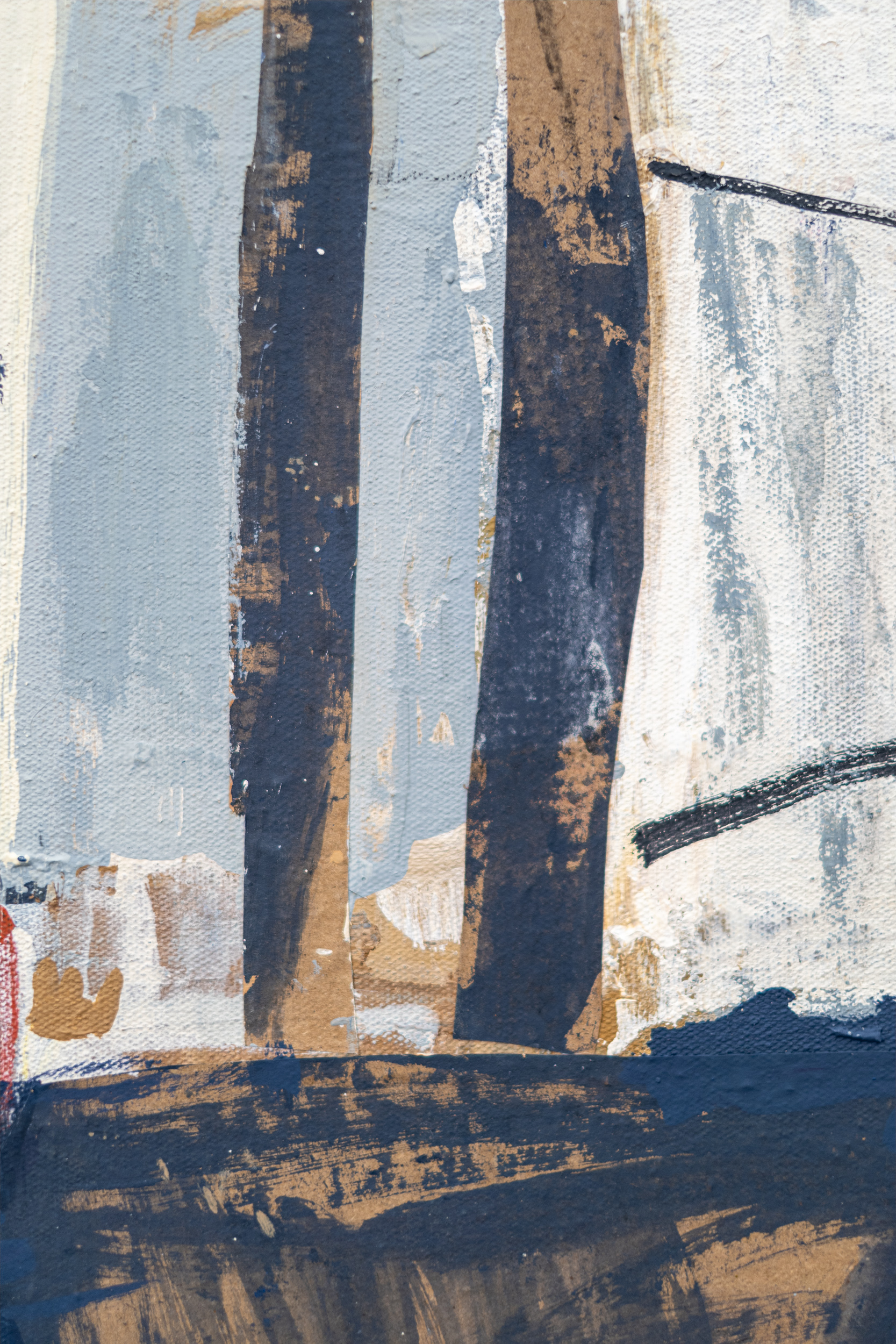 This mixed media contemporary abstract composition is rendered in earthy colours.The dramatic and elegant artwork of Shireen Kamran is rooted in and inspired by her rich Pakistani heritage—reminiscent of ancient architectural forms. Kamran works intuitively, without preconceived ideas much like an ‘automatist’ whereby drawing is automatic allowing the subconscious to emerge. By using a mix of media in layers, by scraping and rubbing pigment, and acrylic paint her work is distinctively expressive, has great depth and is visibly textured. Lyrical brushstrokes in earth tones—golden browns combined with dark and soft grays and blues are punctuated by white and a dash of red. The title of this series refers to the seven seas of the world. The Persian word—Haft Qulzum literally means ‘seven seas’ and also perhaps refers to the 19th century Persian dictionary from India that had seven volumes and symbolized ‘the vast and deep ocean of knowledge’.