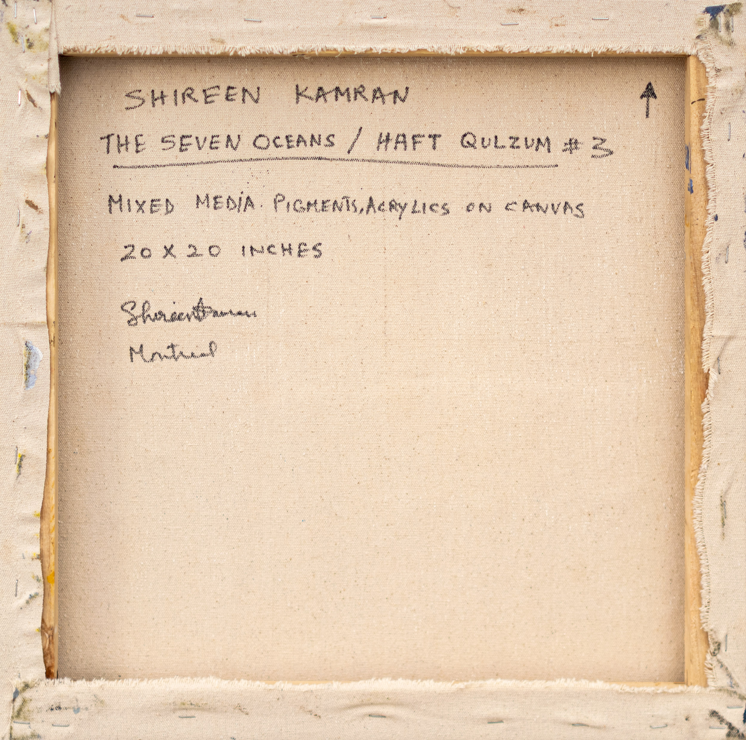 This mixed media contemporary abstract composition is rendered in earthy colours.The dramatic and elegant artwork of Shireen Kamran is rooted in and inspired by her rich Pakistani heritage—reminiscent of ancient architectural forms. Kamran works intuitively, without preconceived ideas much like an ‘automatist’ whereby drawing is automatic allowing the subconscious to emerge. By using a mix of media in layers, by scraping and rubbing pigment, and acrylic paint her work is distinctively expressive, has great depth and is visibly textured. Lyrical brushstrokes in earth tones—golden browns combined with dark and soft grays and blues are punctuated by white and a dash of red. The title of this series refers to the seven seas of the world. The Persian word—Haft Qulzum literally means ‘seven seas’ and also perhaps refers to the 19th century Persian dictionary from India that had seven volumes and symbolized ‘the vast and deep ocean of knowledge’.