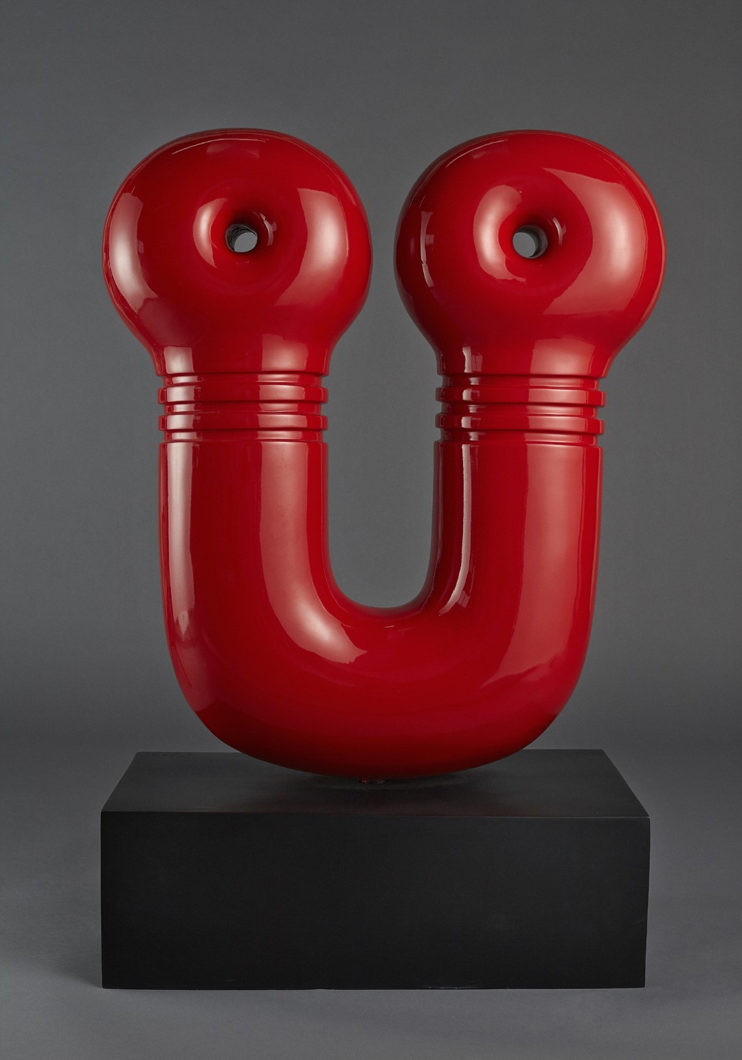 This modern piece cast in bronze and coated with shiny bright red enamel paint is from his ‘Screws and Bolts’ series from the 1970’s. This U-shaped form was inspired by mechanical elements—fastening devices such as screws and bolts that Etrog became fascinated with. These pieces played with these bold forms in a humorous and sensual way that explored a new kind of visual language for the artist. Edition 2 of 5.