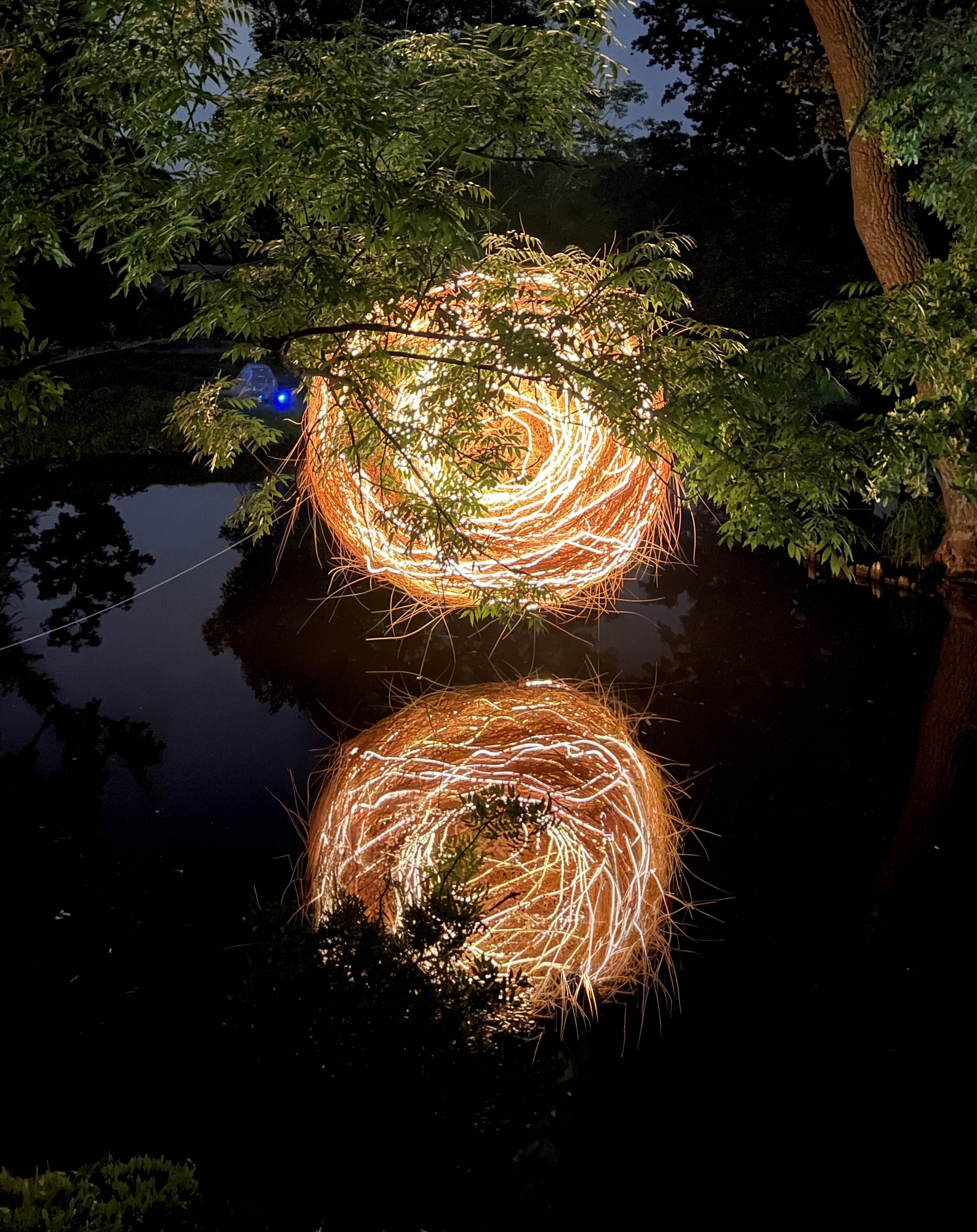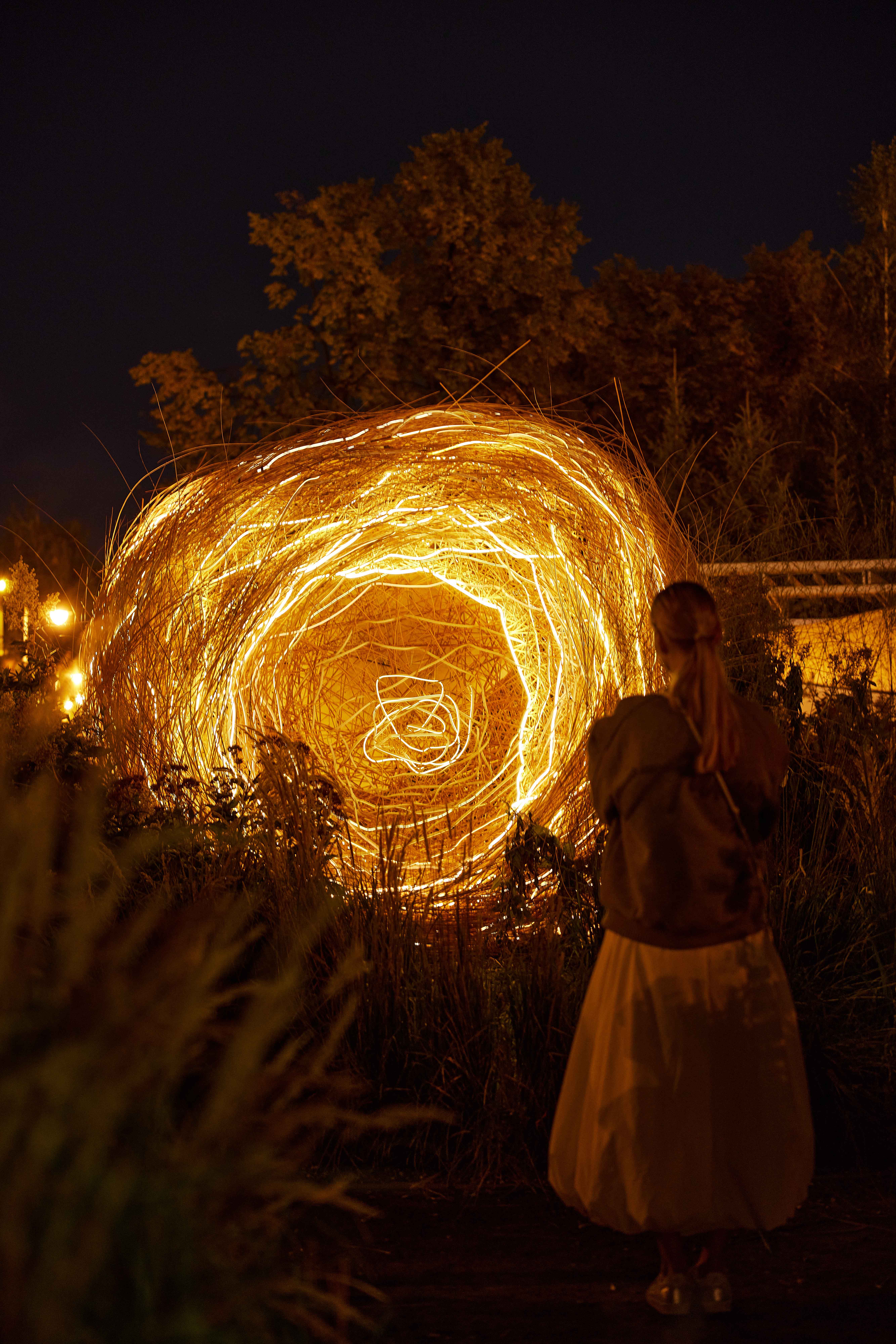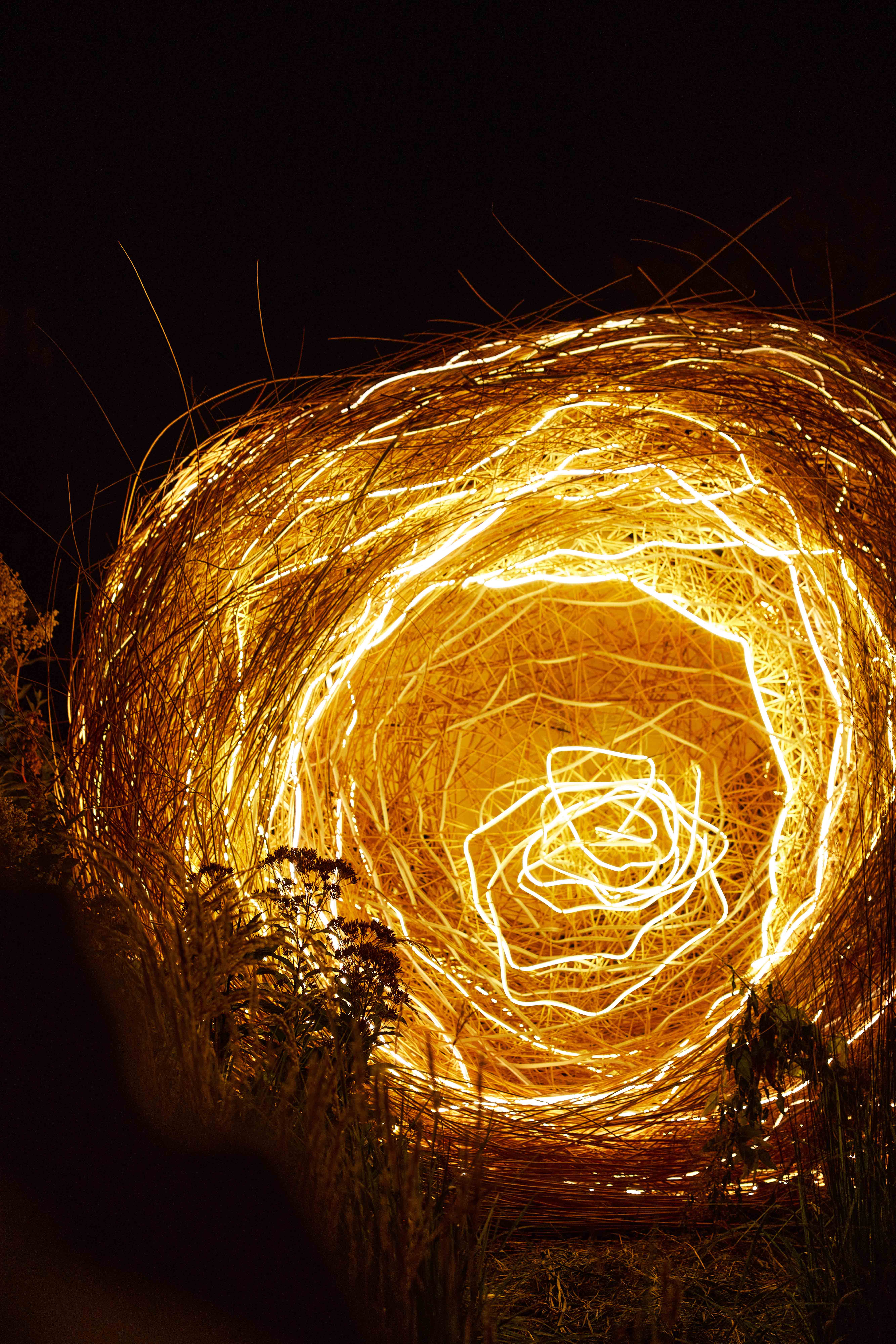 Art and science have co-existed since antiquity. SPLACES Studio’s innovative approach to art re-imagines its relationship to technology and the natural world. Nidium is made from 1,000 hand-woven willow branches, integrated with warm LED lighting. The sculpture emits light and sound generated by neural networks inside the ‘nest’ that respond to environmental input and human presence.