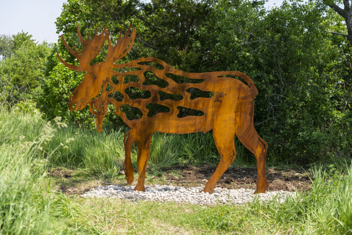 This monumental steel figurative sculpture of a moose is designed for the outdoors.