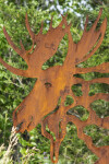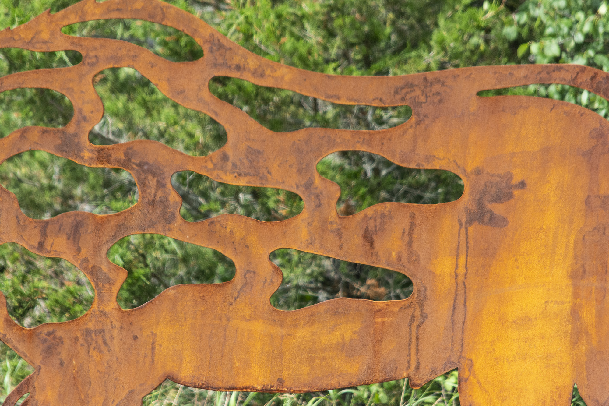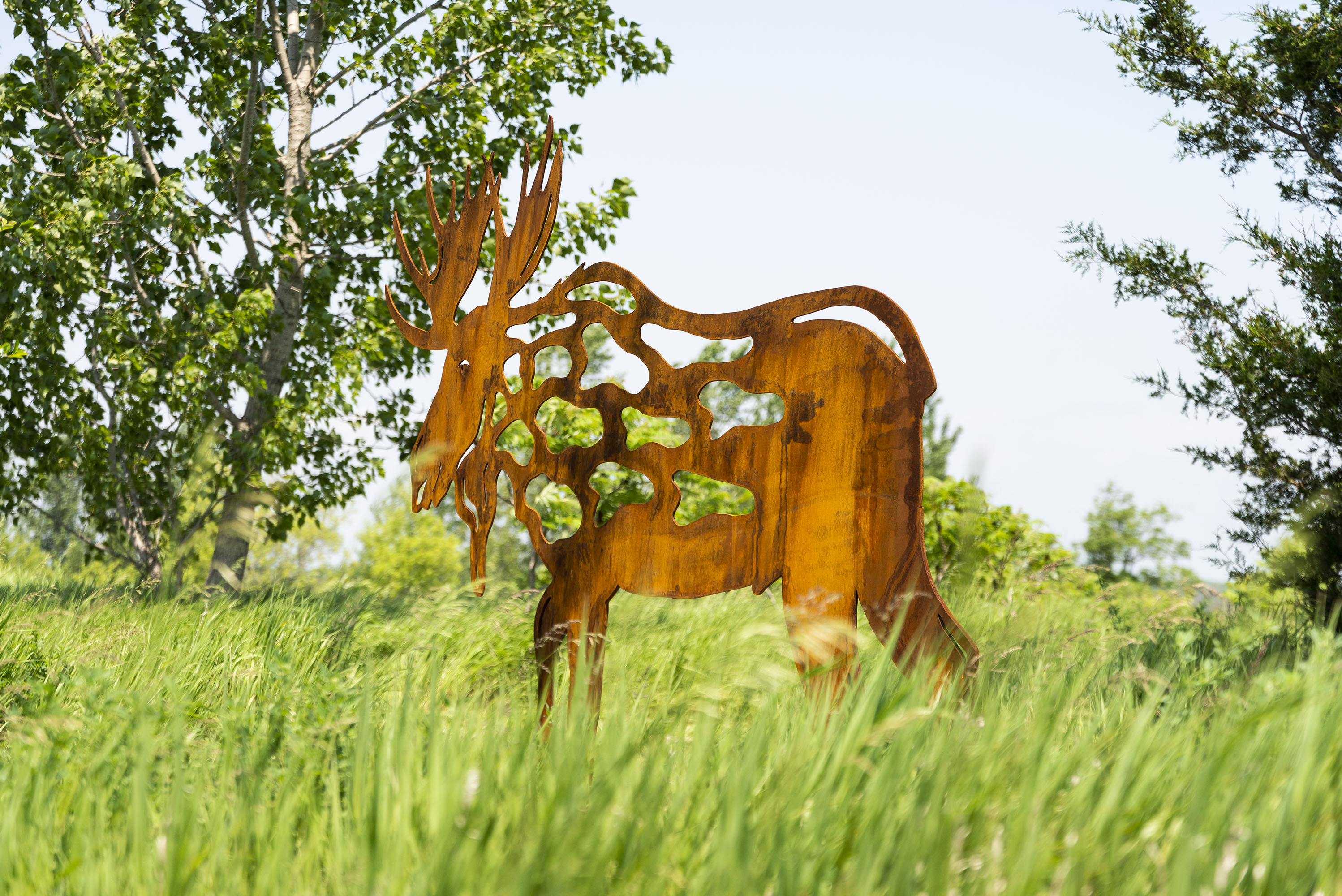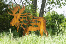 Forged from corten steel, this sculpture will naturally weather and over time acquire an even more attractive rust-coloured patina. Several ‘cut-out’ shapes within the body of the moose are intended to represent the animal’s natural habitat in the wilderness, including ponds, leaves and clouds.