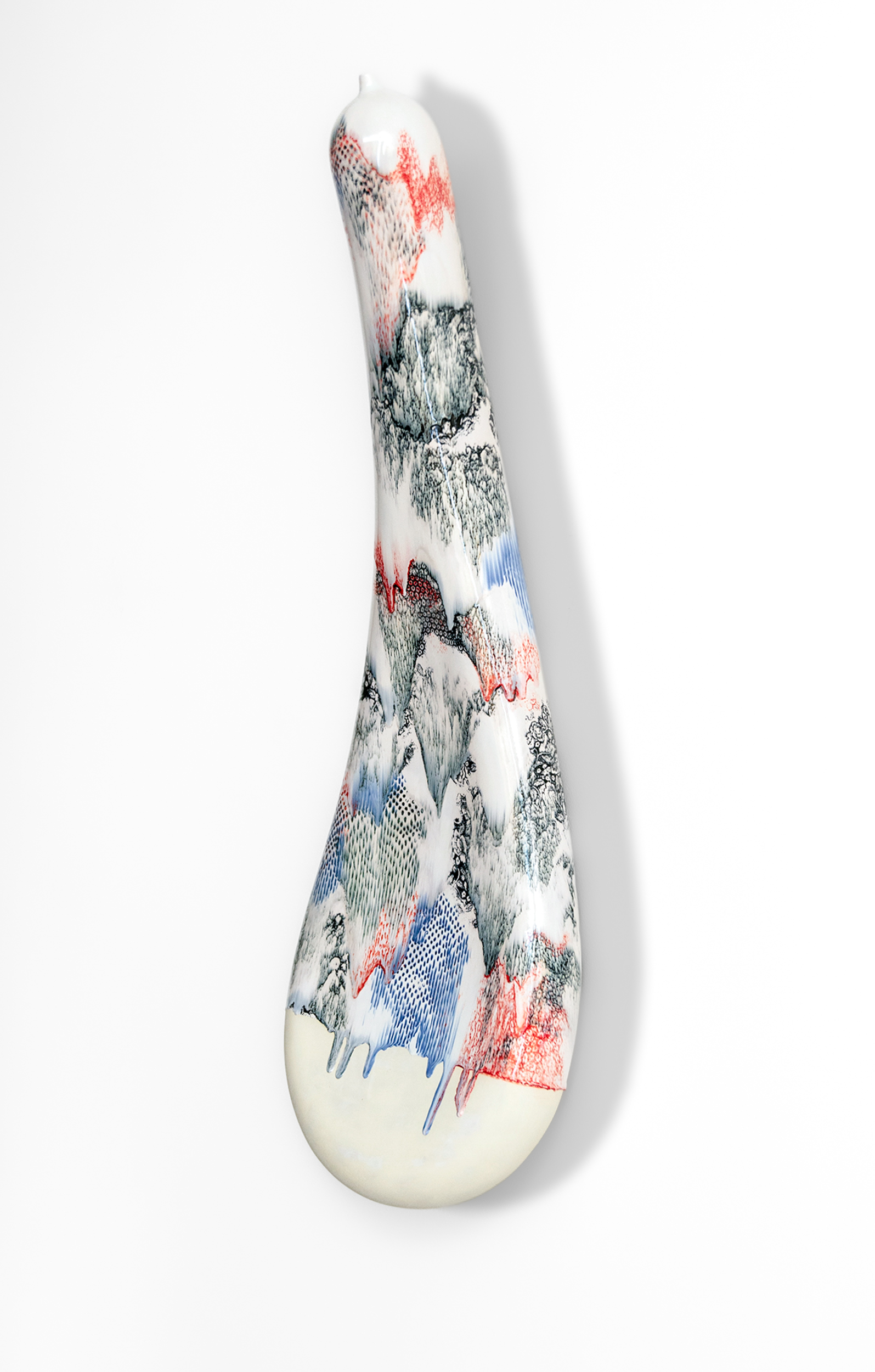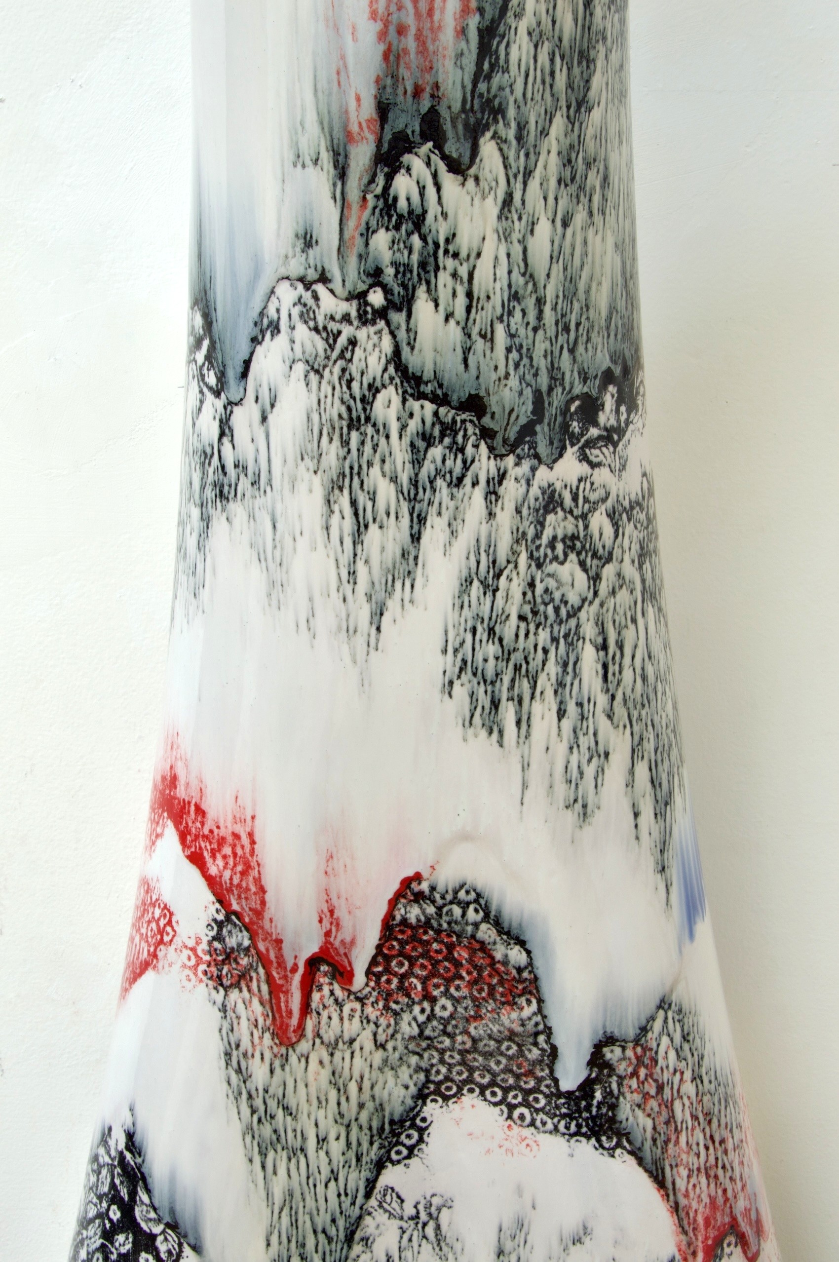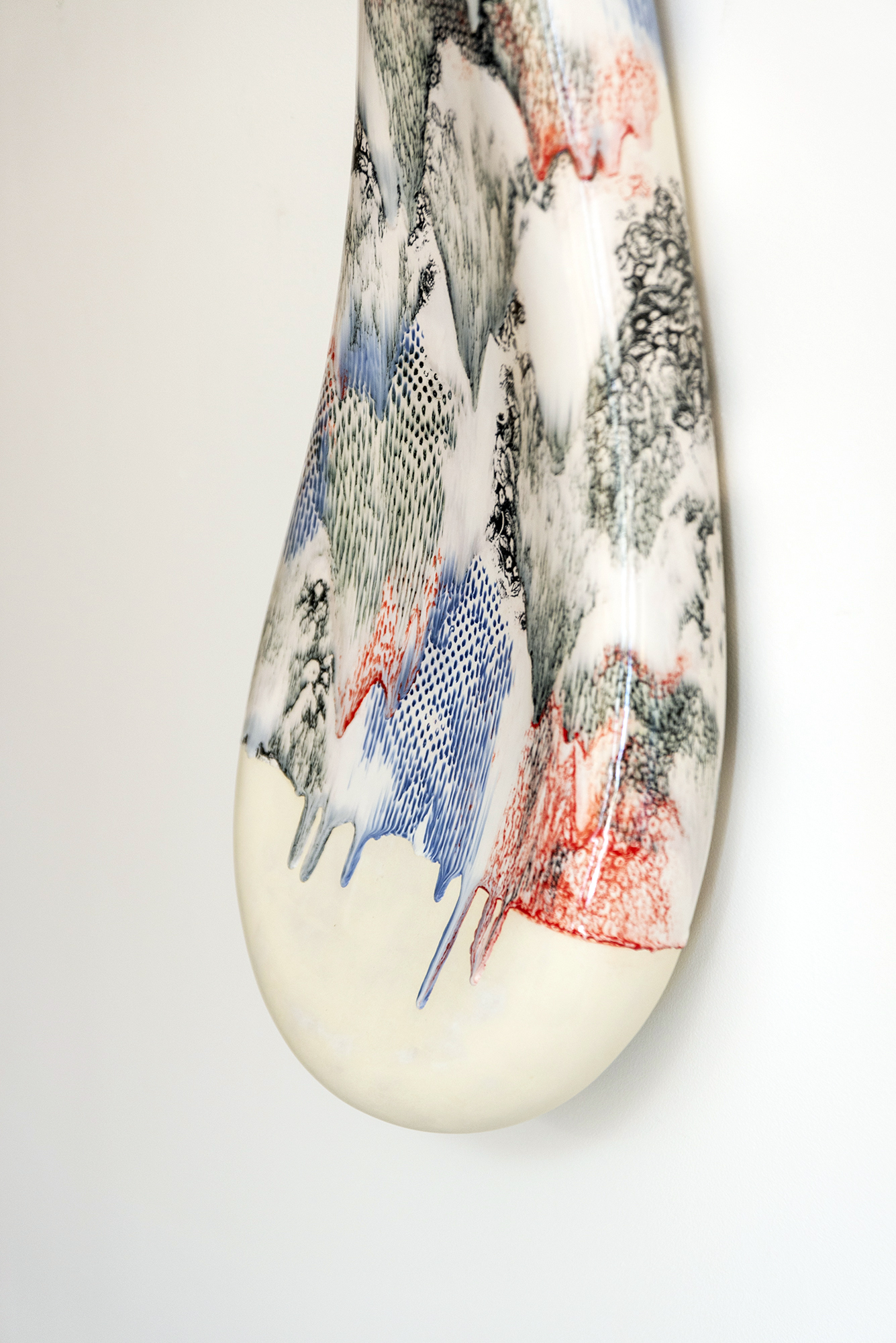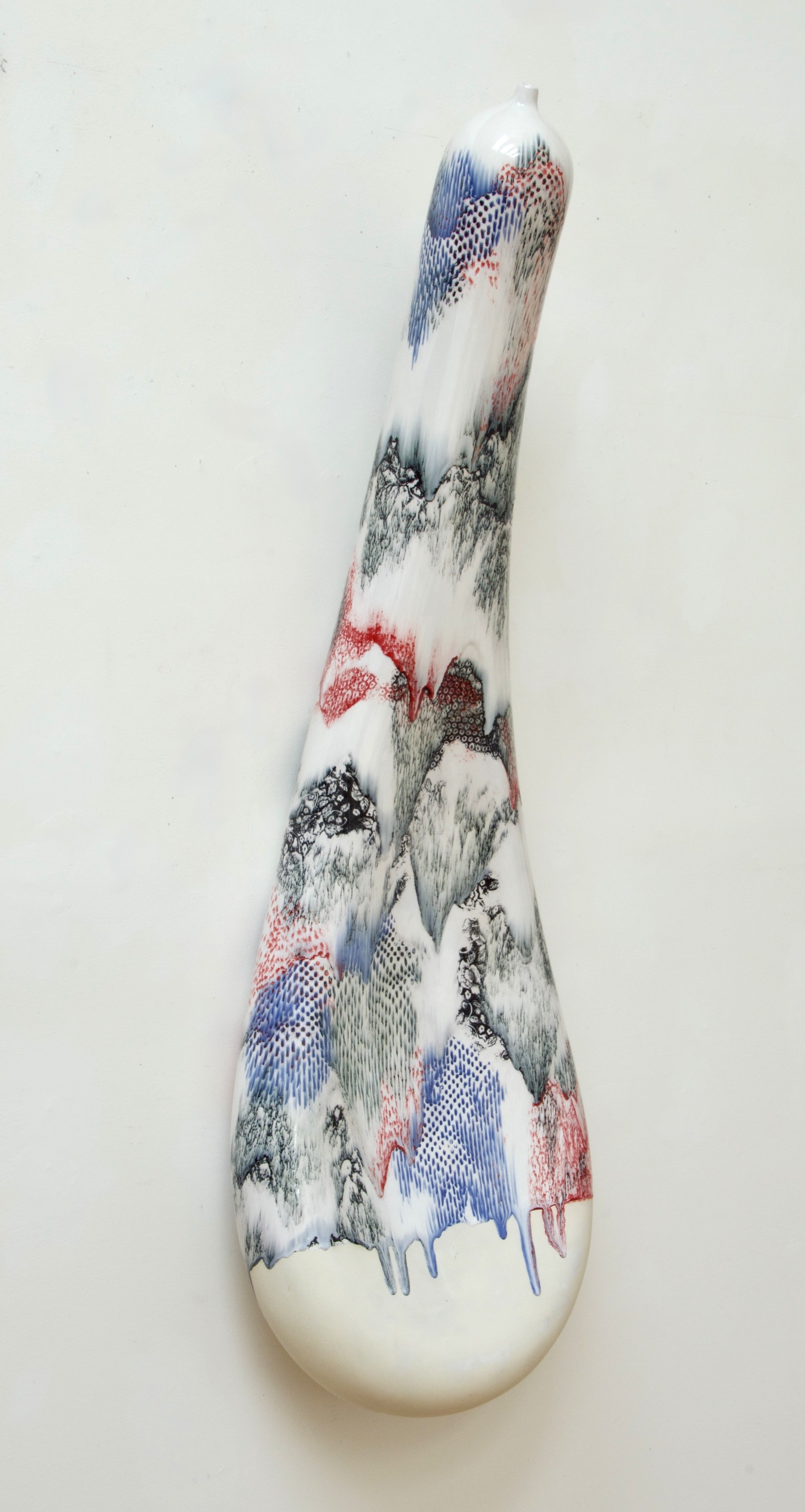 This is one of an ongoing series of vessel forms he created, designed to be wall-mounted. They explore “the sculptural elements of pottery--the 3d side of ceramics.” The elegant form of this raindrop-shaped piece is enhanced by the use of a historical opaque white glaze. Intricate patterns that appear as mountain landscapes in red, blue and black overlap and flow down the face of the work. The title, Seven Story Mountain, was inspired by the famous 1948 autobiography of Thomas Merton that tells the story of his spiritual journey as a young Trappist Monk and priest.