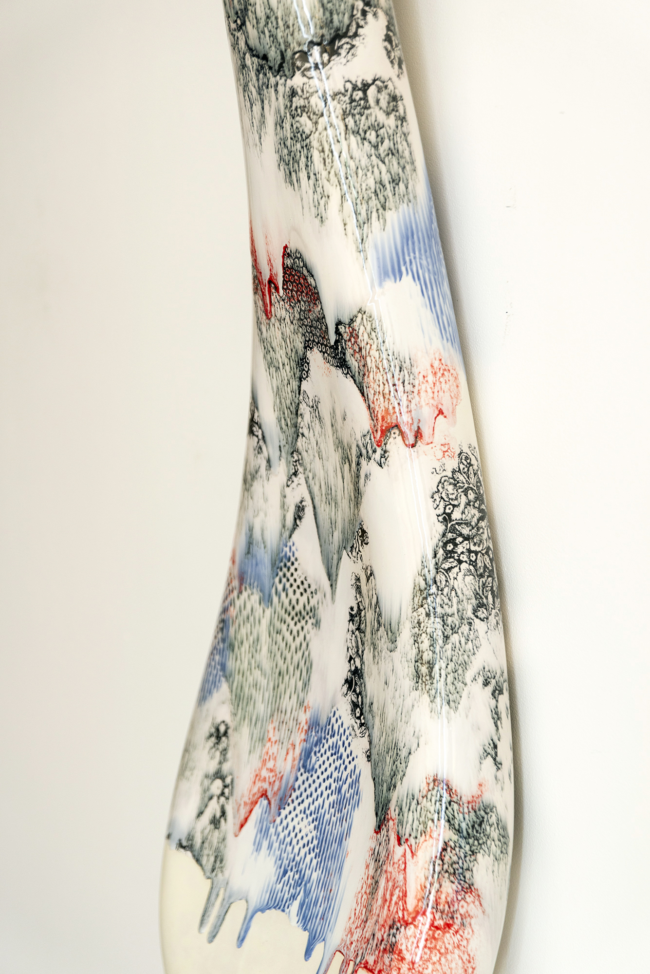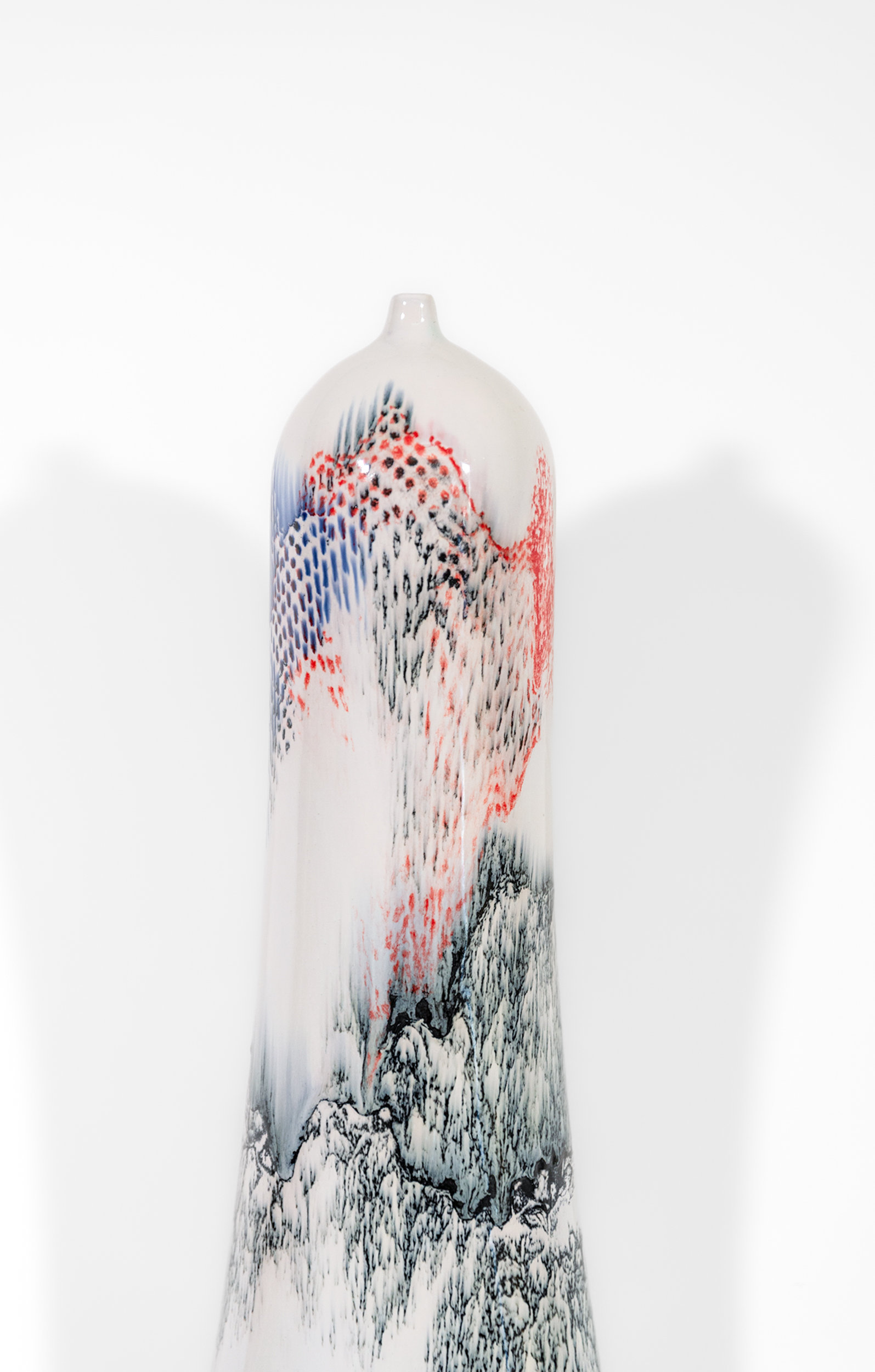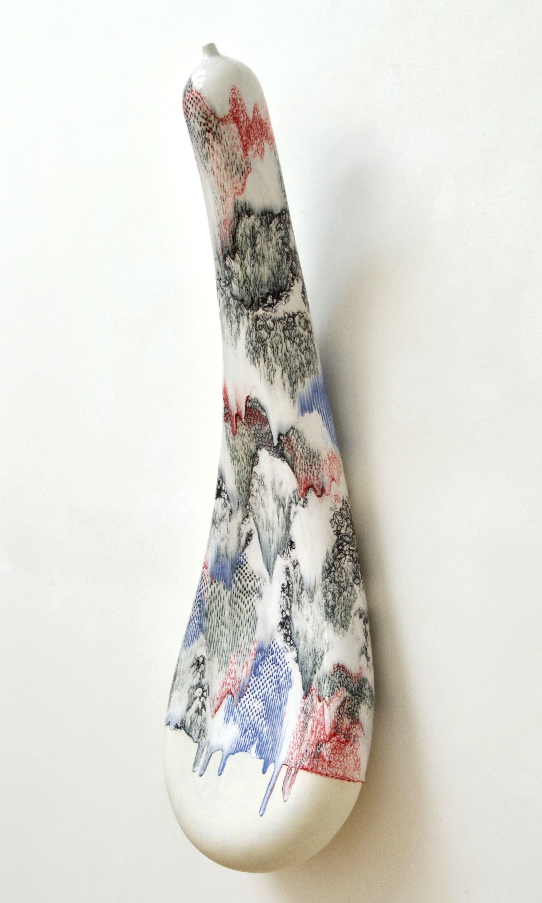 This is one of an ongoing series of vessel forms he created, designed to be wall-mounted. They explore “the sculptural elements of pottery--the 3d side of ceramics.” The elegant form of this raindrop-shaped piece is enhanced by the use of a historical opaque white glaze. Intricate patterns that appear as mountain landscapes in red, blue and black overlap and flow down the face of the work. The title, Seven Story Mountain, was inspired by the famous 1948 autobiography of Thomas Merton that tells the story of his spiritual journey as a young Trappist Monk and priest.