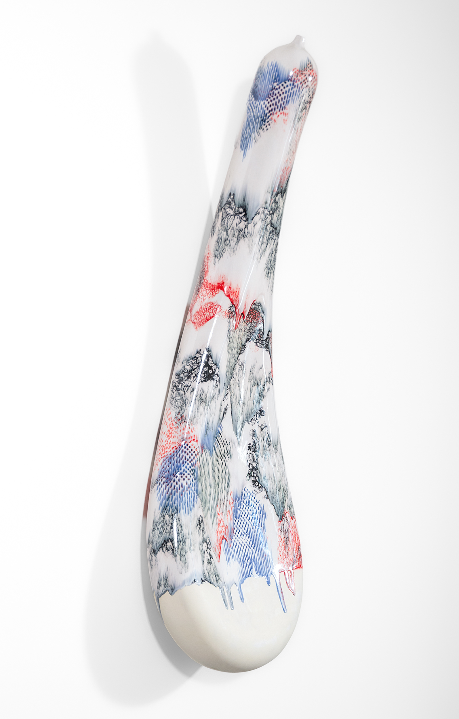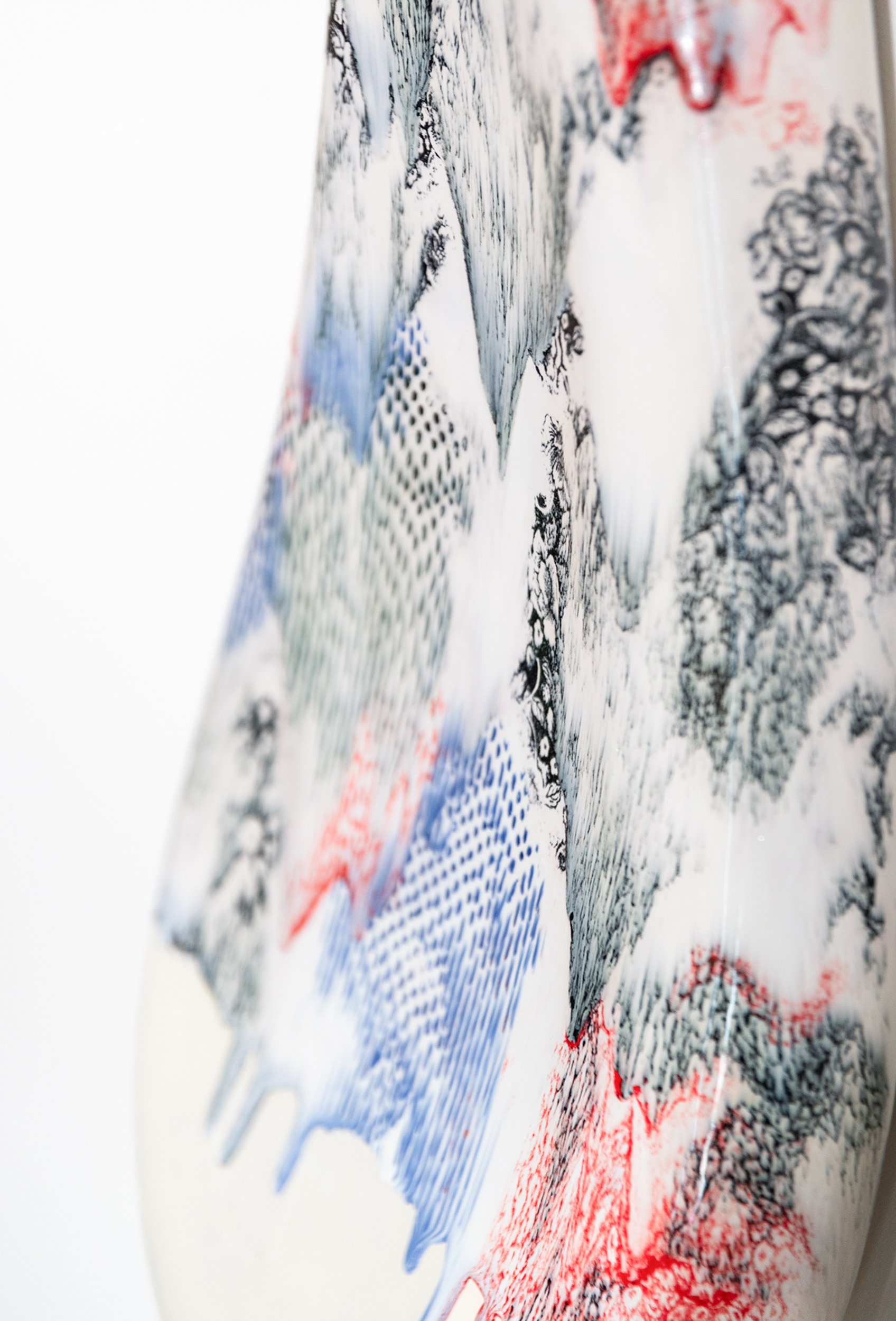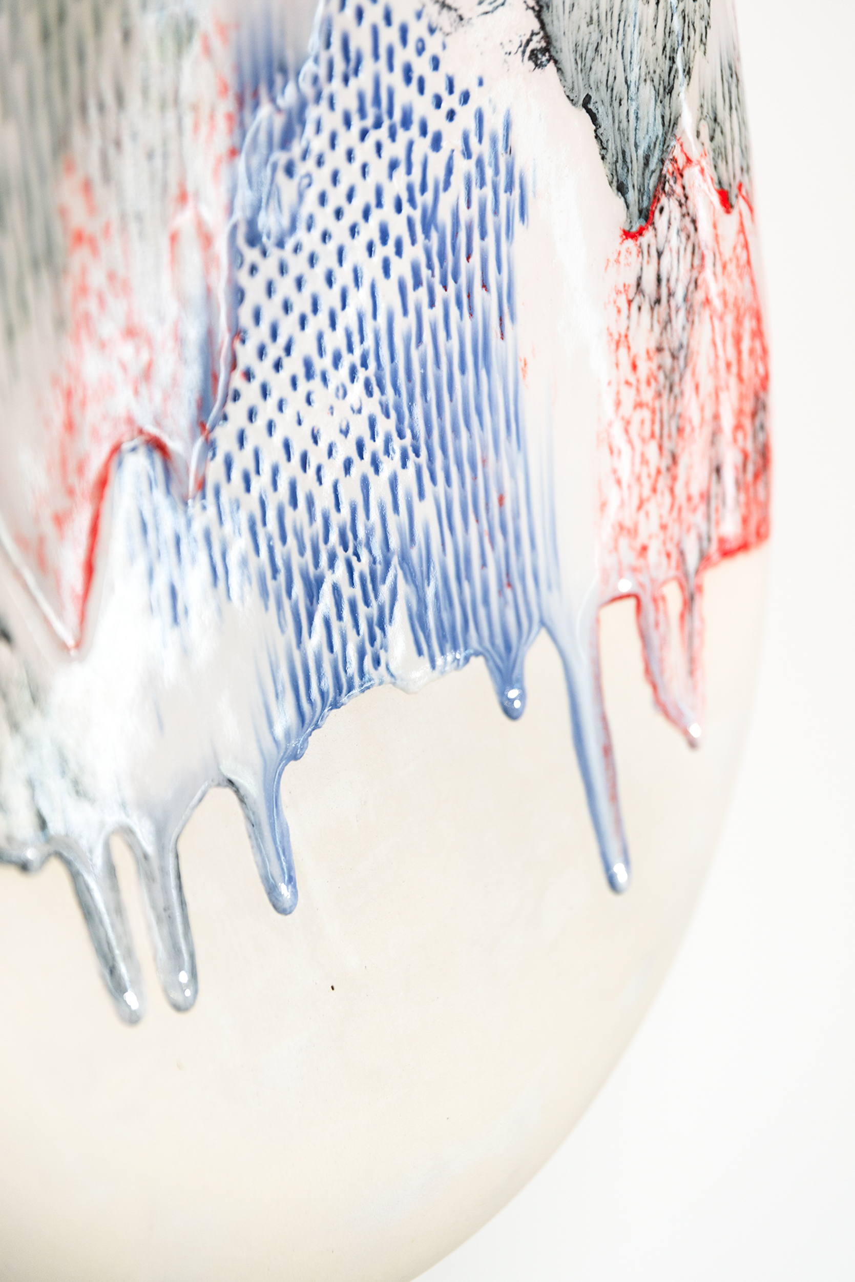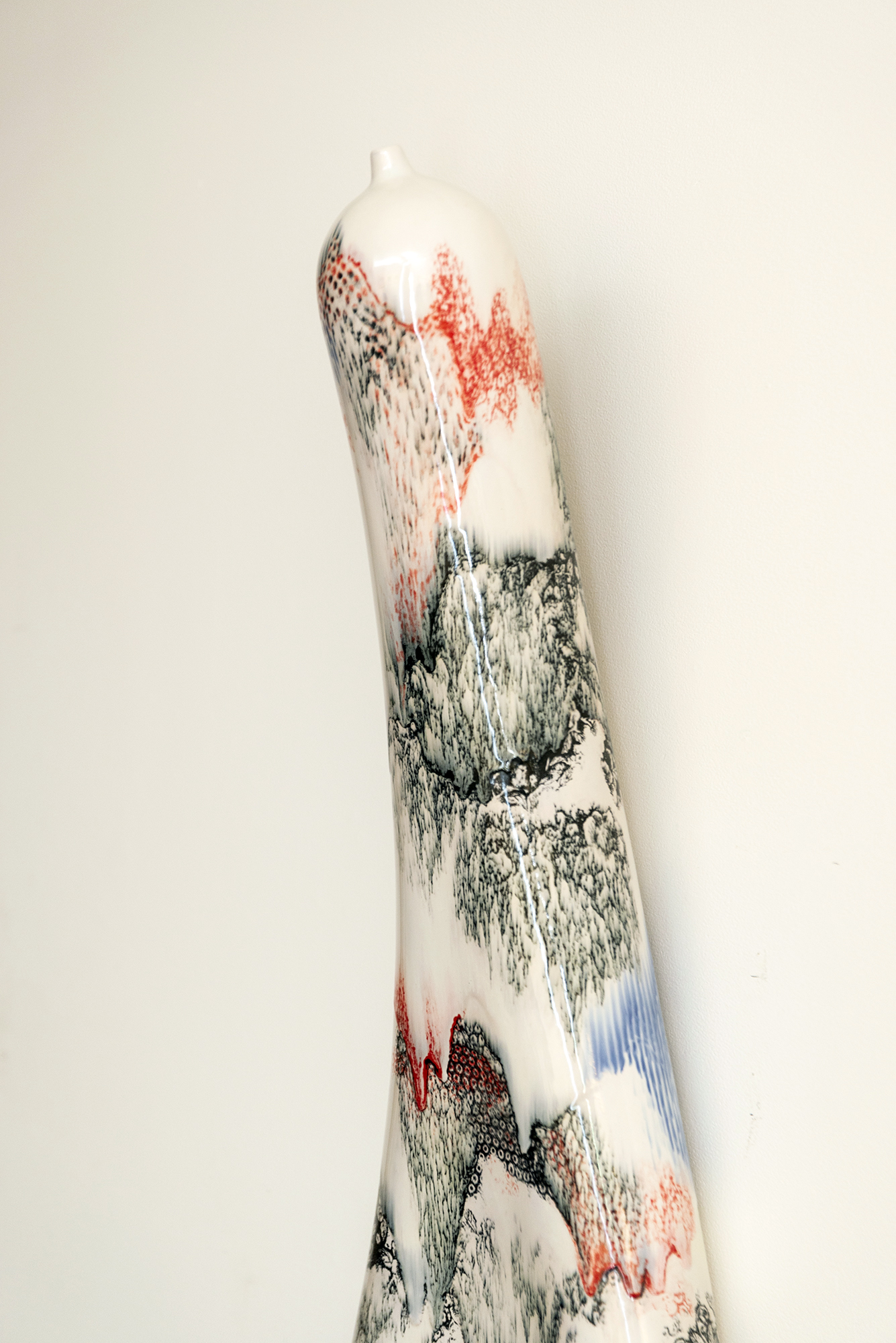 This is one of an ongoing series of vessel forms he created, designed to be wall-mounted. They explore “the sculptural elements of pottery--the 3d side of ceramics.” The elegant form of this raindrop-shaped piece is enhanced by the use of a historical opaque white glaze. Intricate patterns that appear as mountain landscapes in red, blue and black overlap and flow down the face of the work. The title, Seven Story Mountain, was inspired by the famous 1948 autobiography of Thomas Merton that tells the story of his spiritual journey as a young Trappist Monk and priest.