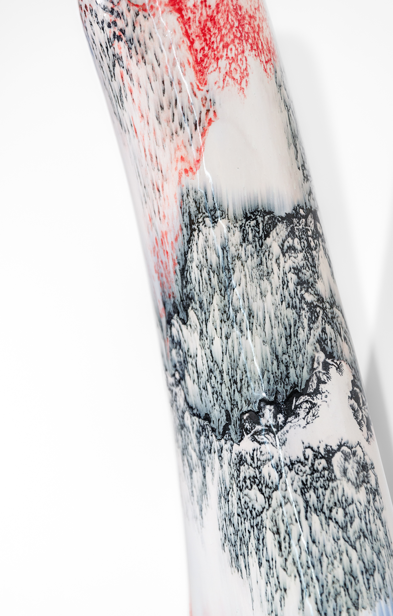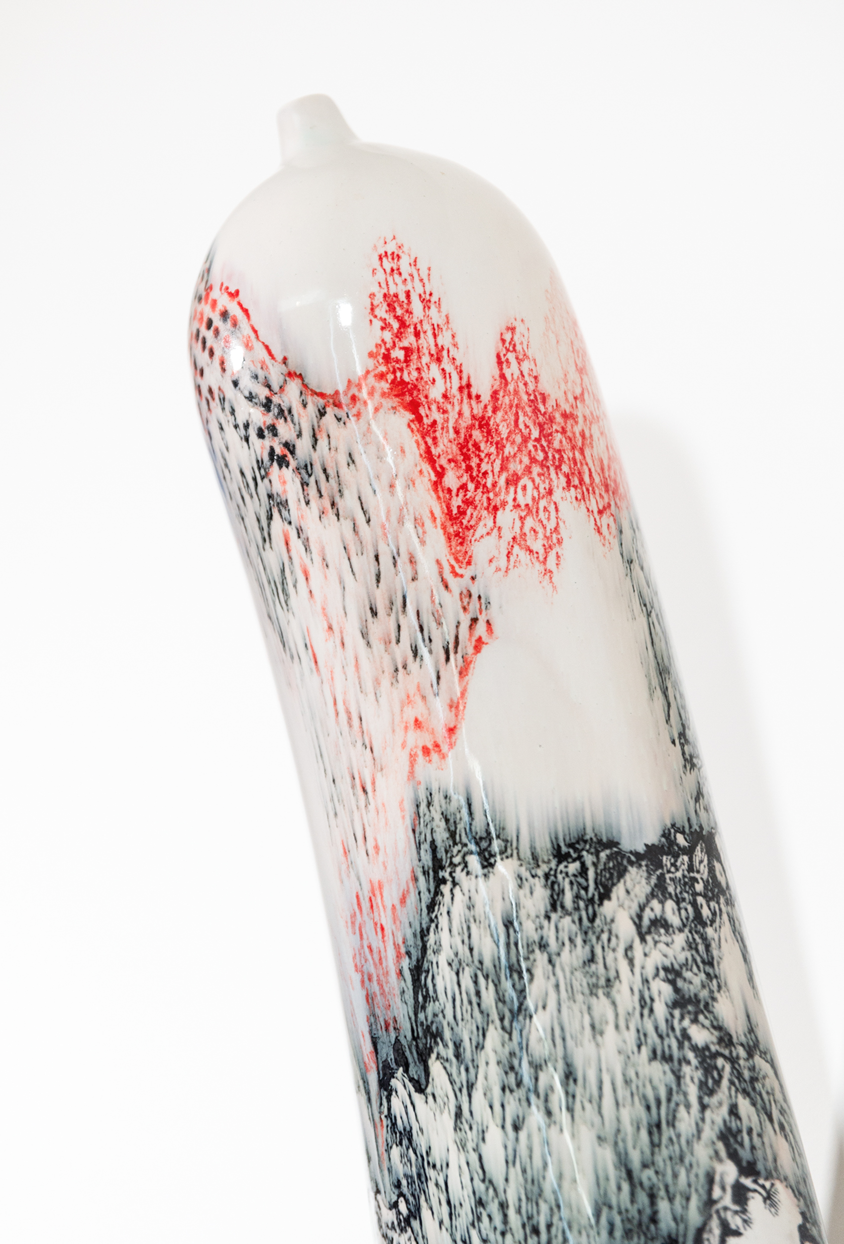 “Instead of seeking a stable ground on which to apply decoration, I developed a fluid, unstable glaze to allow the pattern (in this case, stock commercially available transfers) to flow after application, during the firing. The title is a reference to Merton (an important figure for me in early days), but the resulting flows also evoke for me mythic mountain landscapes.” Steven Heinemann