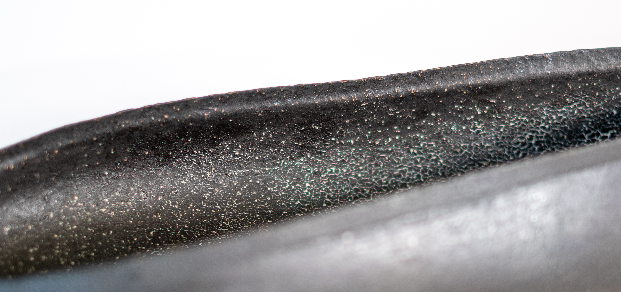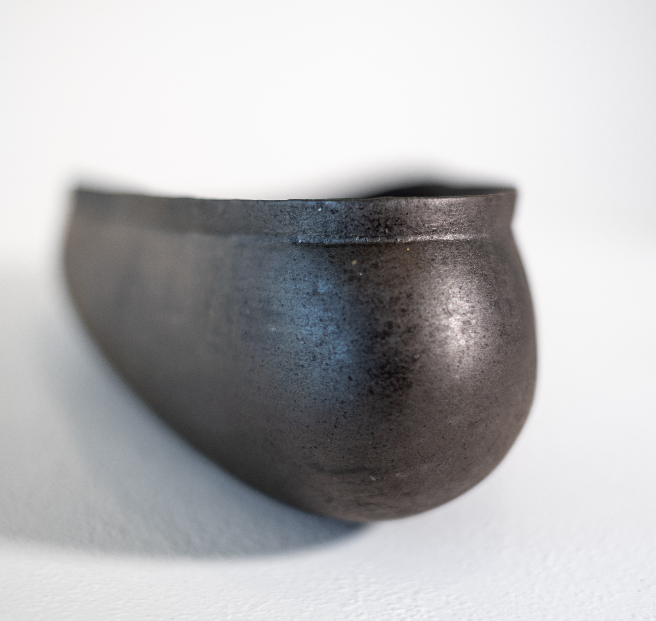 This contemporary ceramic oval-shaped bowl was handbuilt by Steven Heinemann.For the celebrated Canadian ceramicist Steven Heinemann, the humble shape of a bowl has always been an endless source of inspiration. Working with clay, he often uses ‘slip cast moulding’—a technique that is used for shapes that cannot be easily built on a potter’s wheel. By building up fine layers of clay and allowing each one to dry, he attains incredible textures and variations in the surface as they naturally shrink and crack. This has become Heinemann’s signature in his decades-long exploration of minimalist form, colour and texture. The elegant, long, and narrow oval form of this bowl is enhanced by a dark and light palette. The exterior features a smooth flat finish with a ‘collar’ edge; the interior illustrates Heinemann’s signature aesthetic—a highly textured cracked finish in black that reveals a lighter coloured layer.