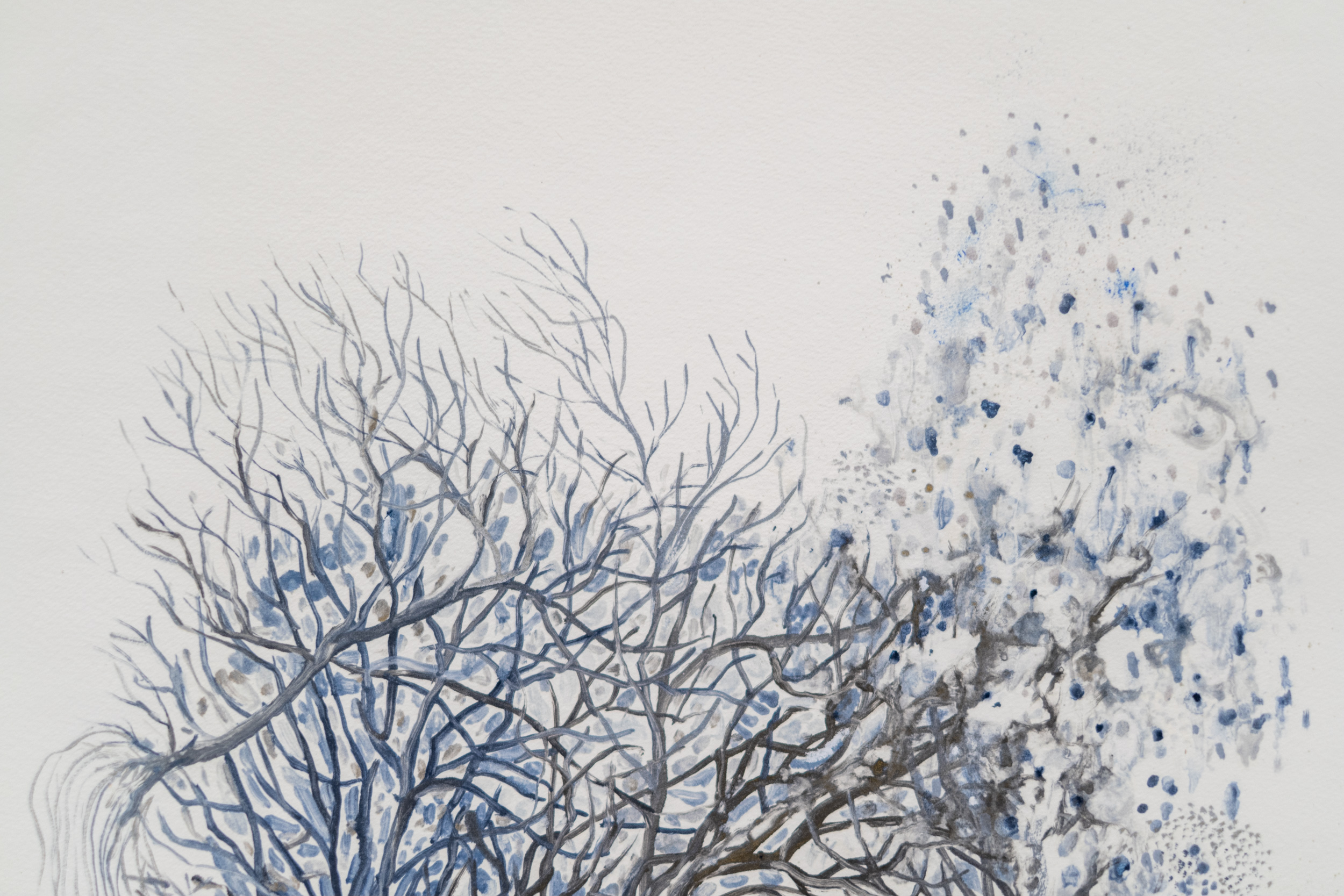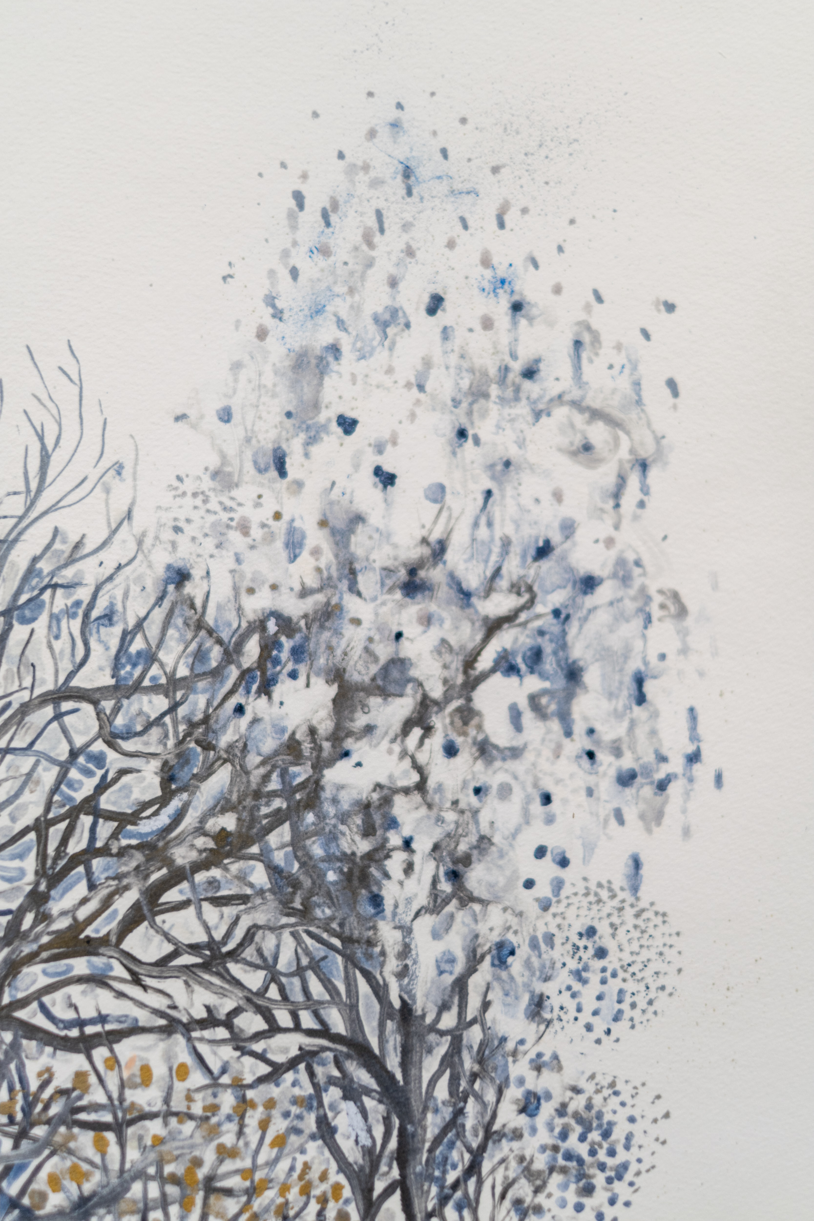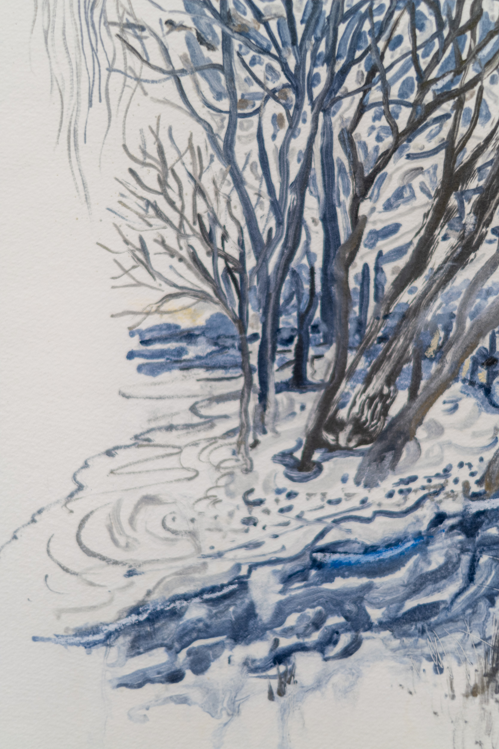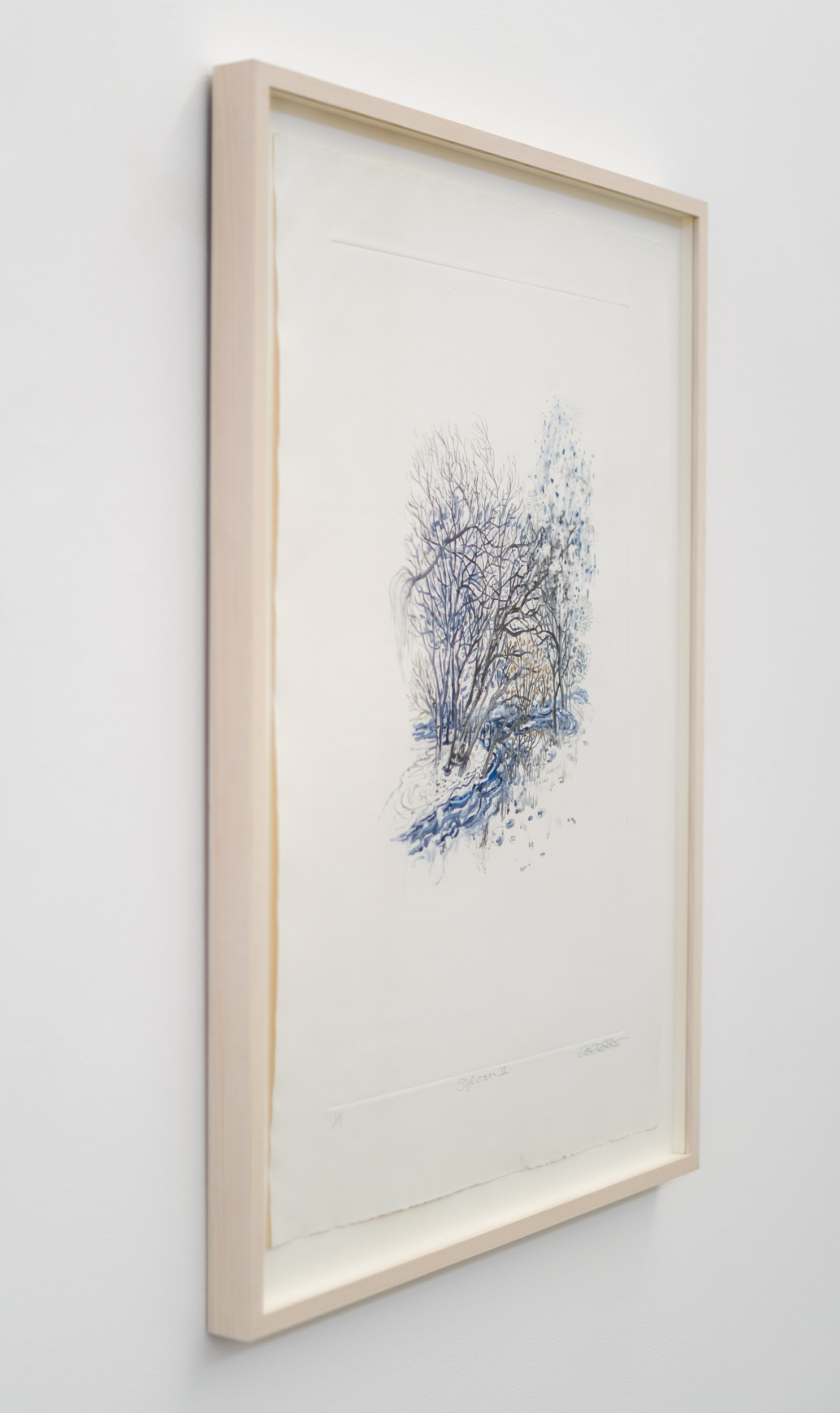 This sketch in ink of bare trees was pressed onto archival paper–just once, so each one is truly an original. (Hahnemuhle Paper dates back to the sixteenth century) After each printing, the copper plates are wiped clean, and a new image is used.The palette is a classic mix of black, gray and steel blue with golden highlights. One of a series that makes an attractive grouping.