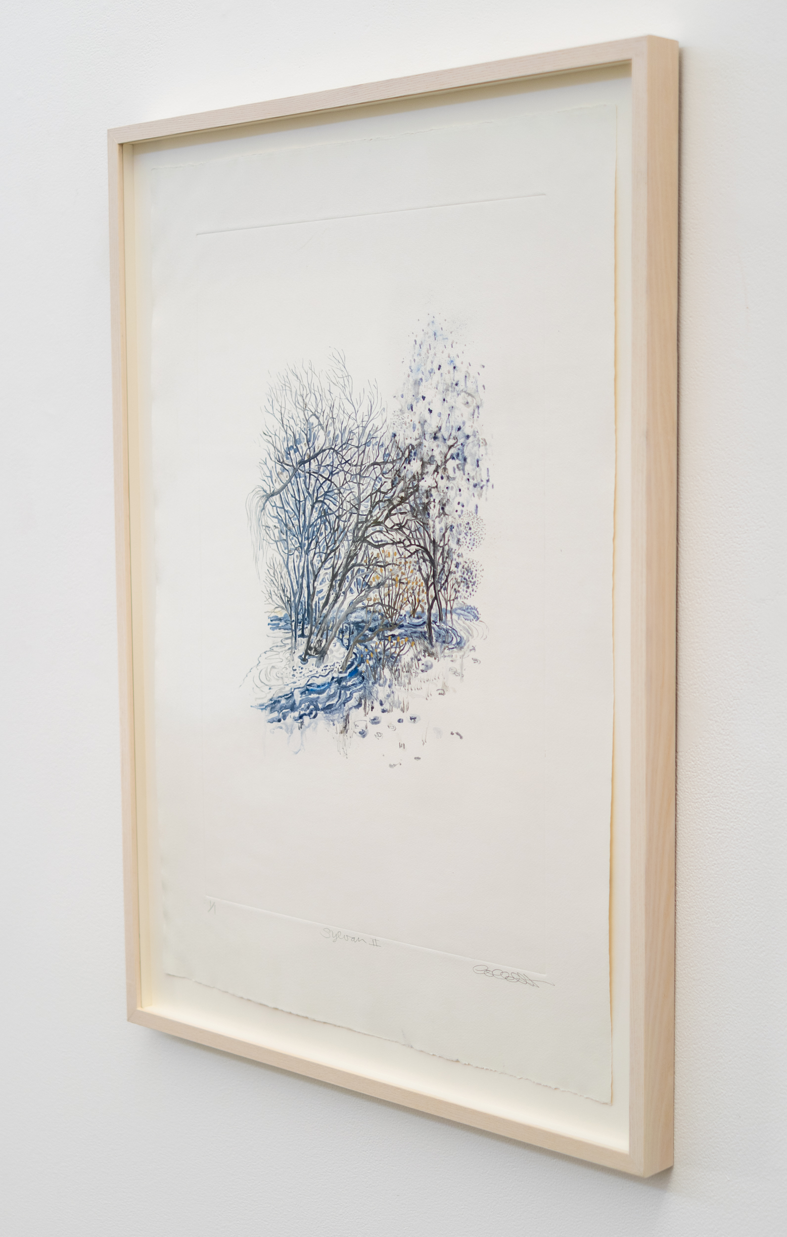 This unique nature print by Susan Collett features a sketch of the woods.This beautiful, delicately detailed monoprint is reminiscent of Chinese landscape paintings. Susan Collett is inspired by the colours, textures and shapes found in nature. A gifted ceramicist, Collett originally studied printmaking at Central Tech High School in Toronto and continues to work in this medium today.