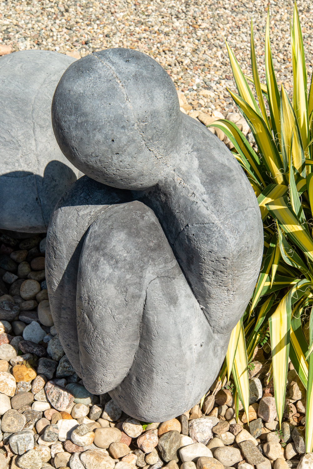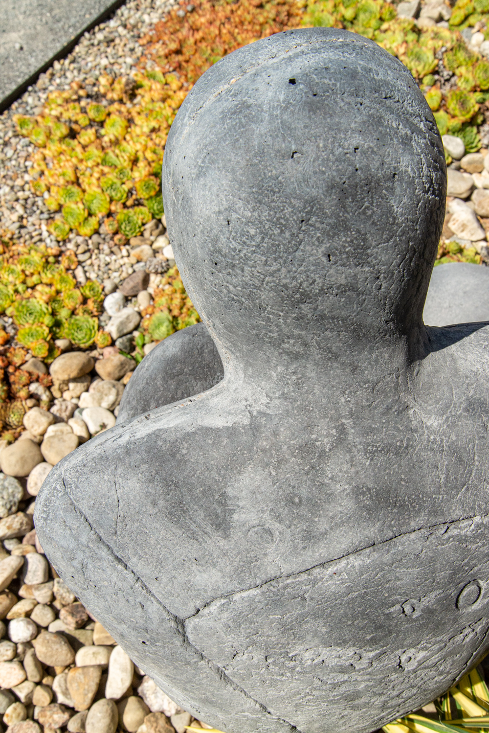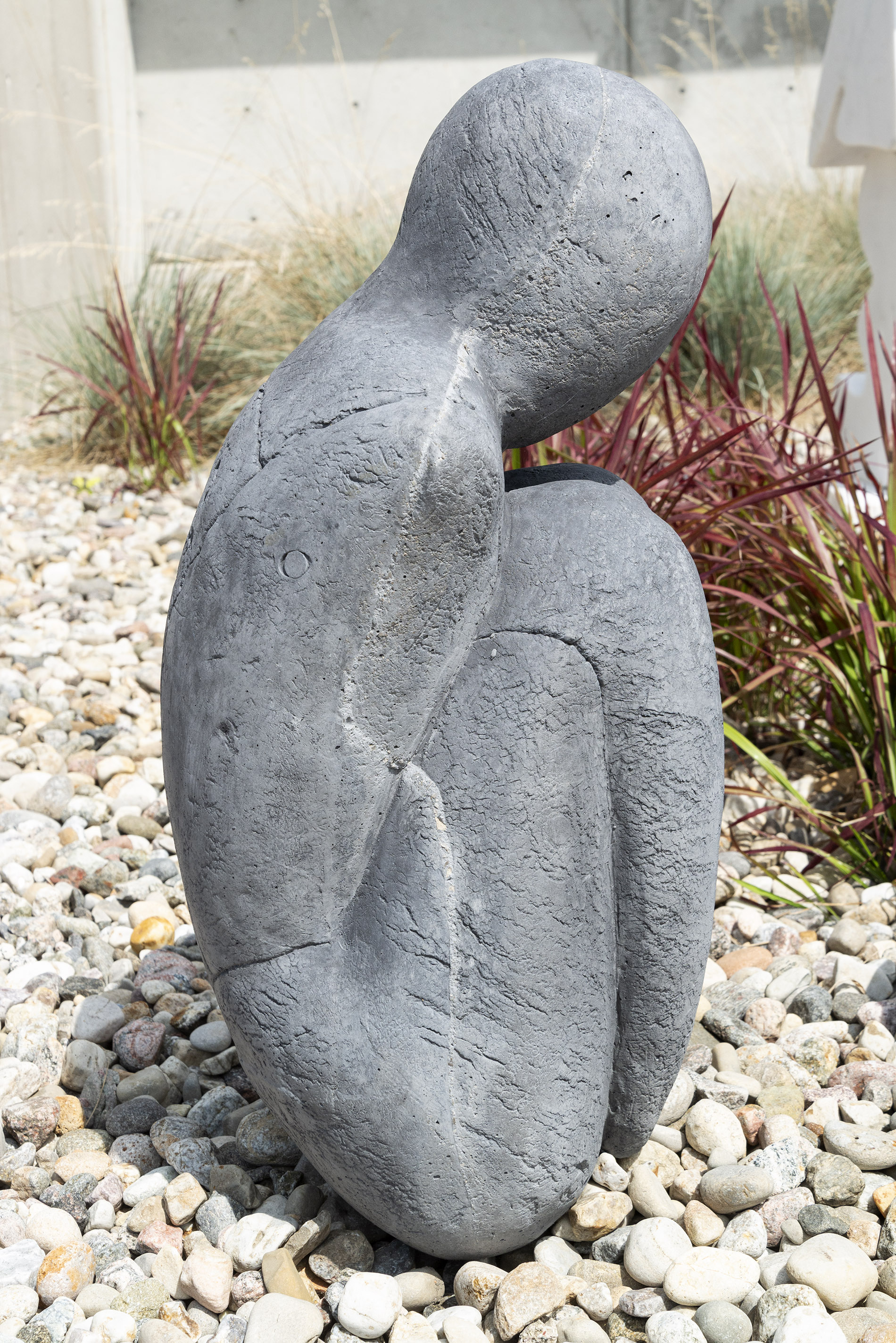 This figurative minimalist outdoor sculpture is made of concrete.A single figure…kneeling, head down facing the earth is one in a series of contemplative sculptures by Susan Low-Beer. The concrete figure is simple--minimalist in form but its narrative—the human connection to nature is both compelling and profound. This series was originally created as part of a large garden installation in which thirty similar figures—all made from a single mold were grouped together as a powerful statement.