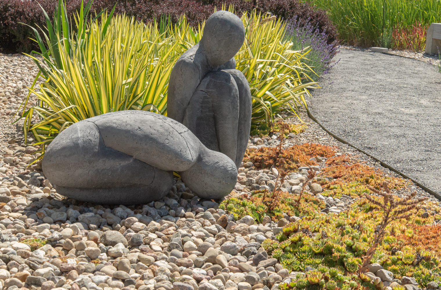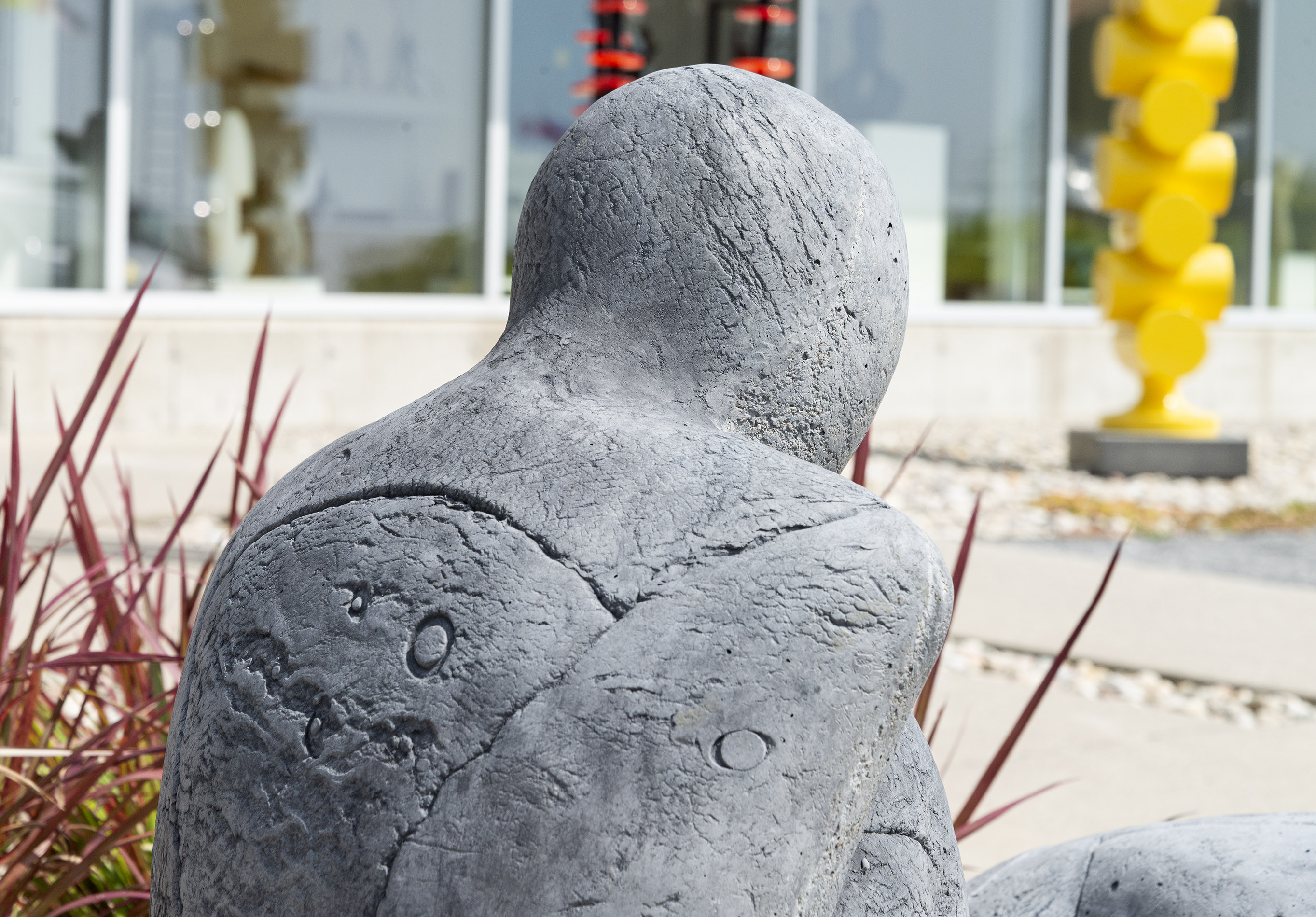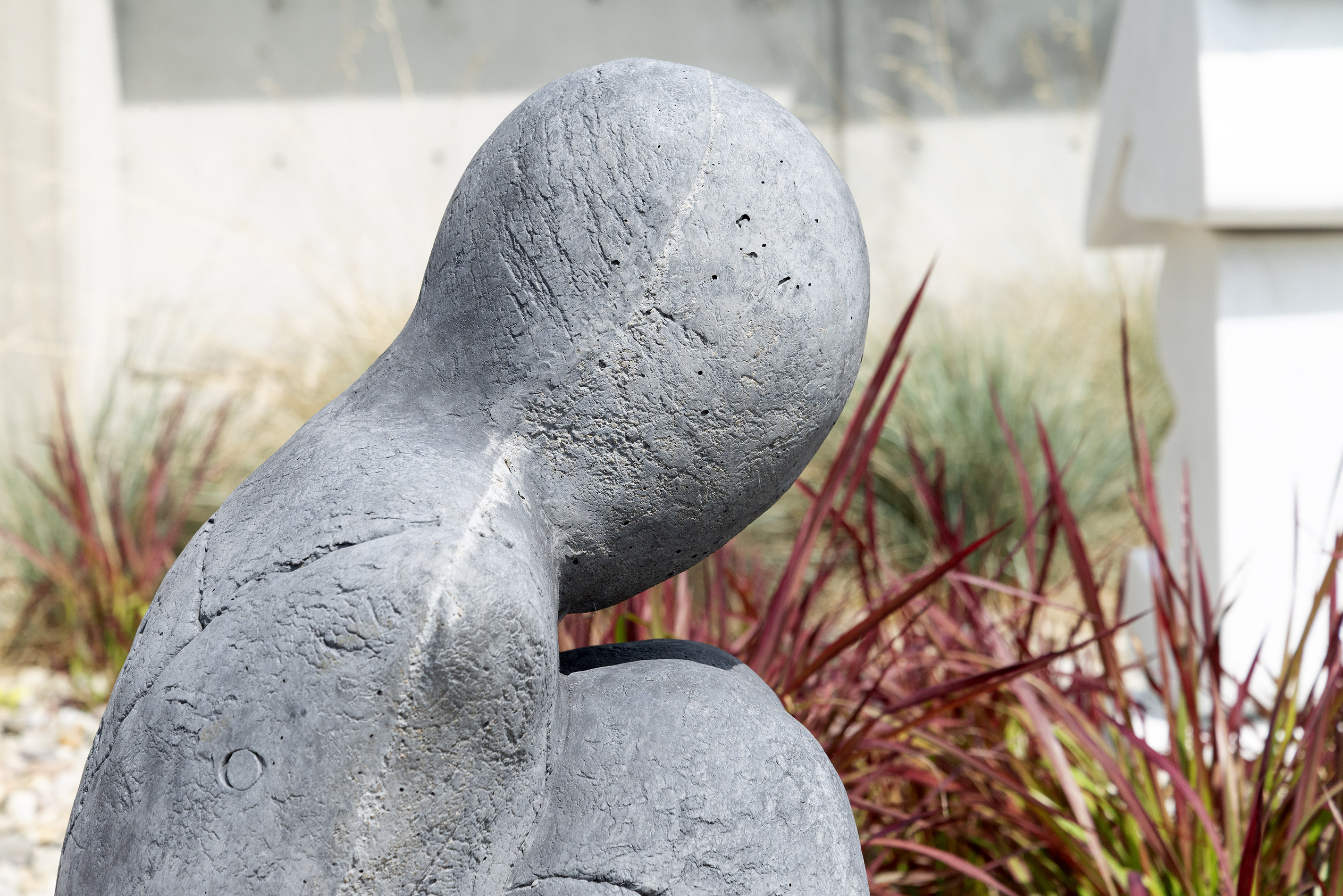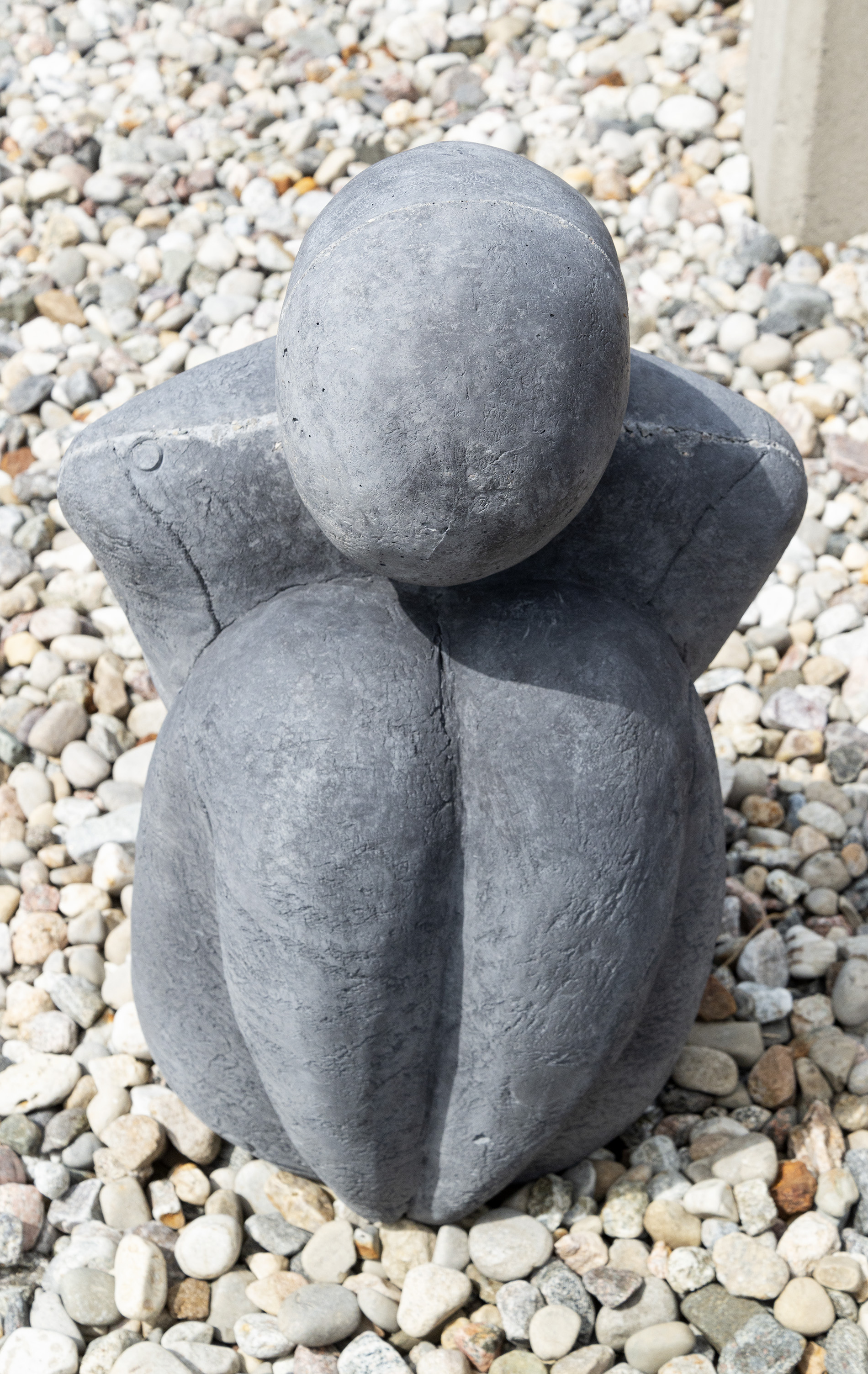 This figurative minimalist outdoor sculpture is made of concrete.A single figure…kneeling, head down facing the earth is one in a series of contemplative sculptures by Susan Low-Beer. The concrete figure is simple--minimalist in form but its narrative—the human connection to nature is both compelling and profound. This series was originally created as part of a large garden installation in which thirty similar figures—all made from a single mold were grouped together as a powerful statement.