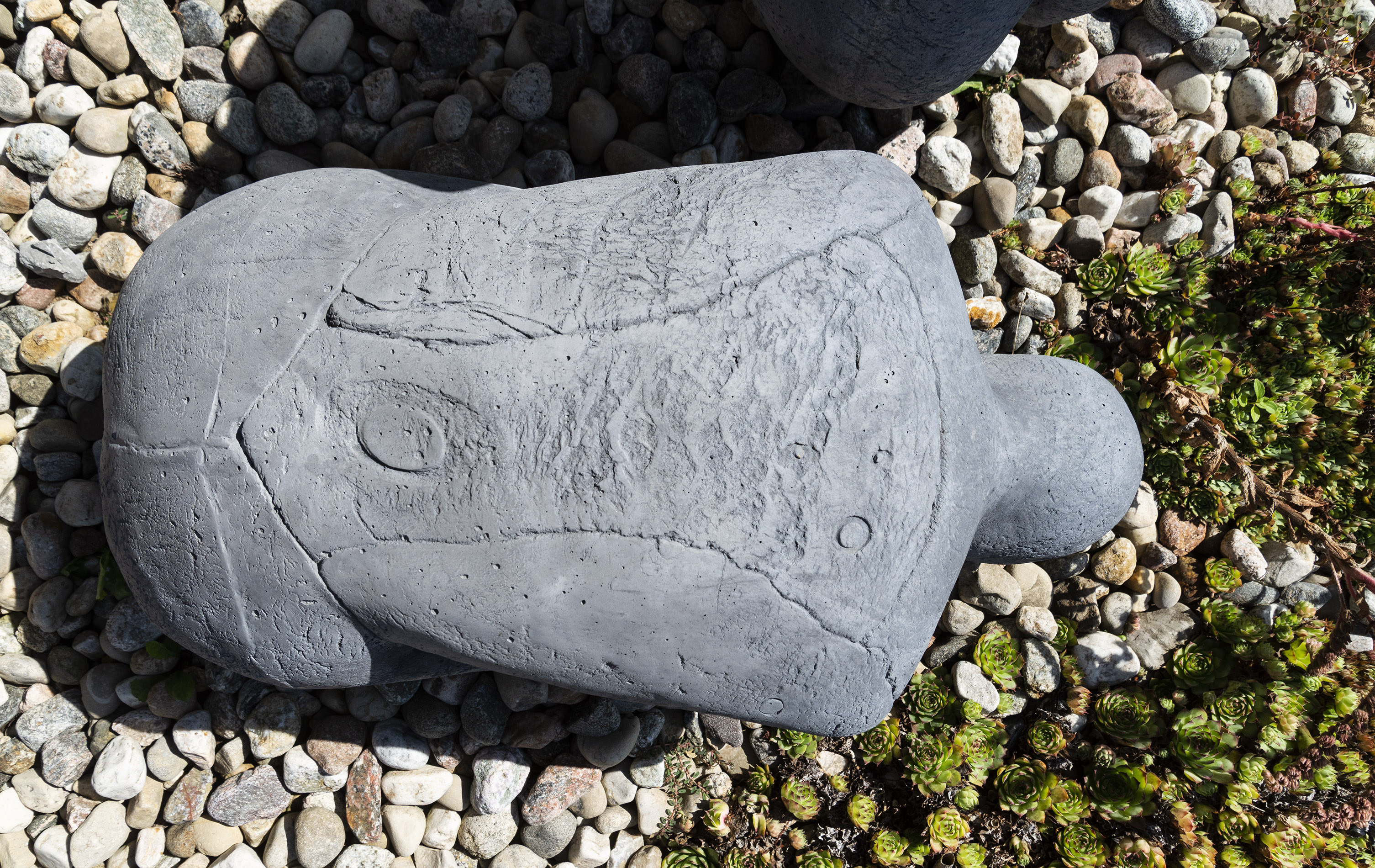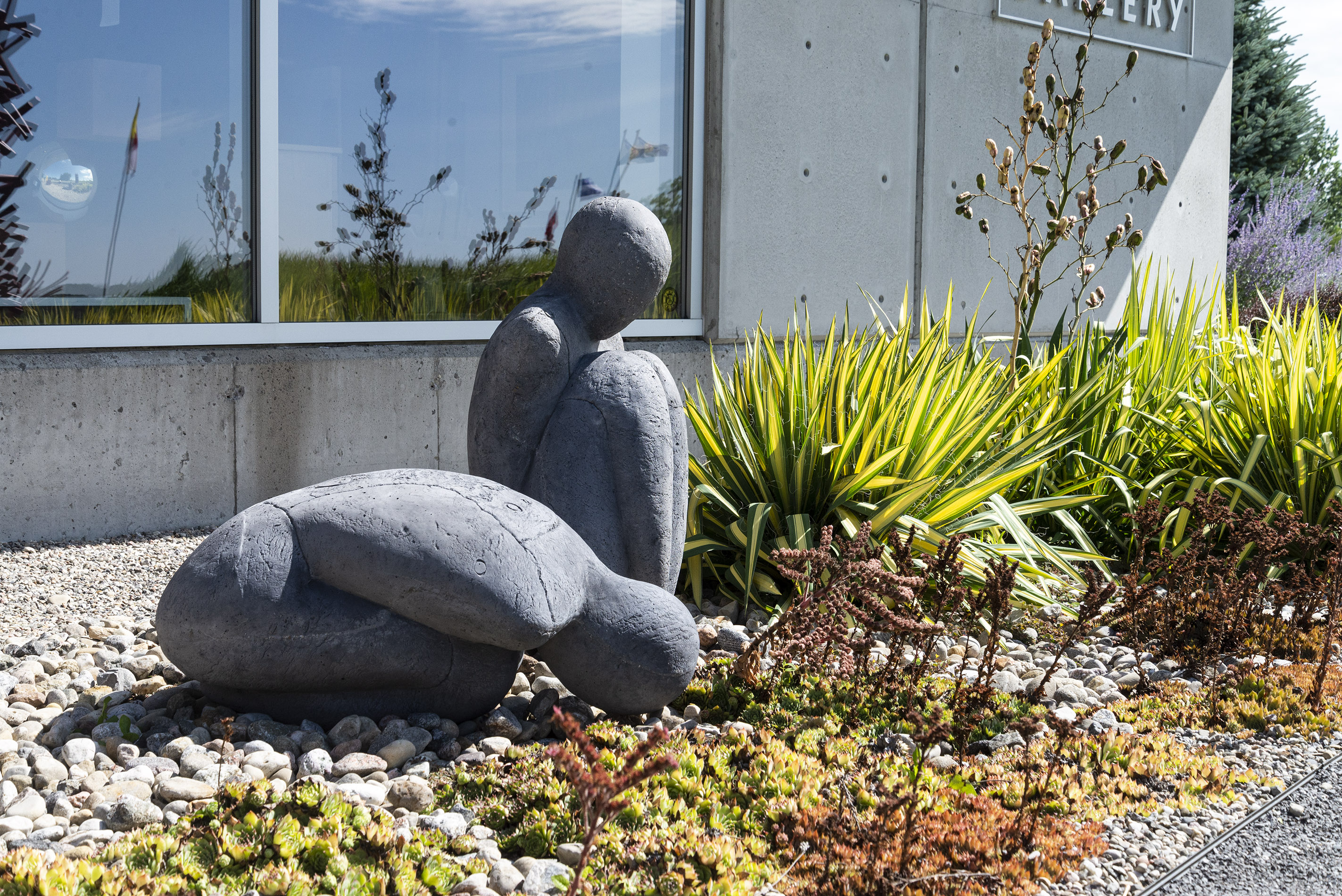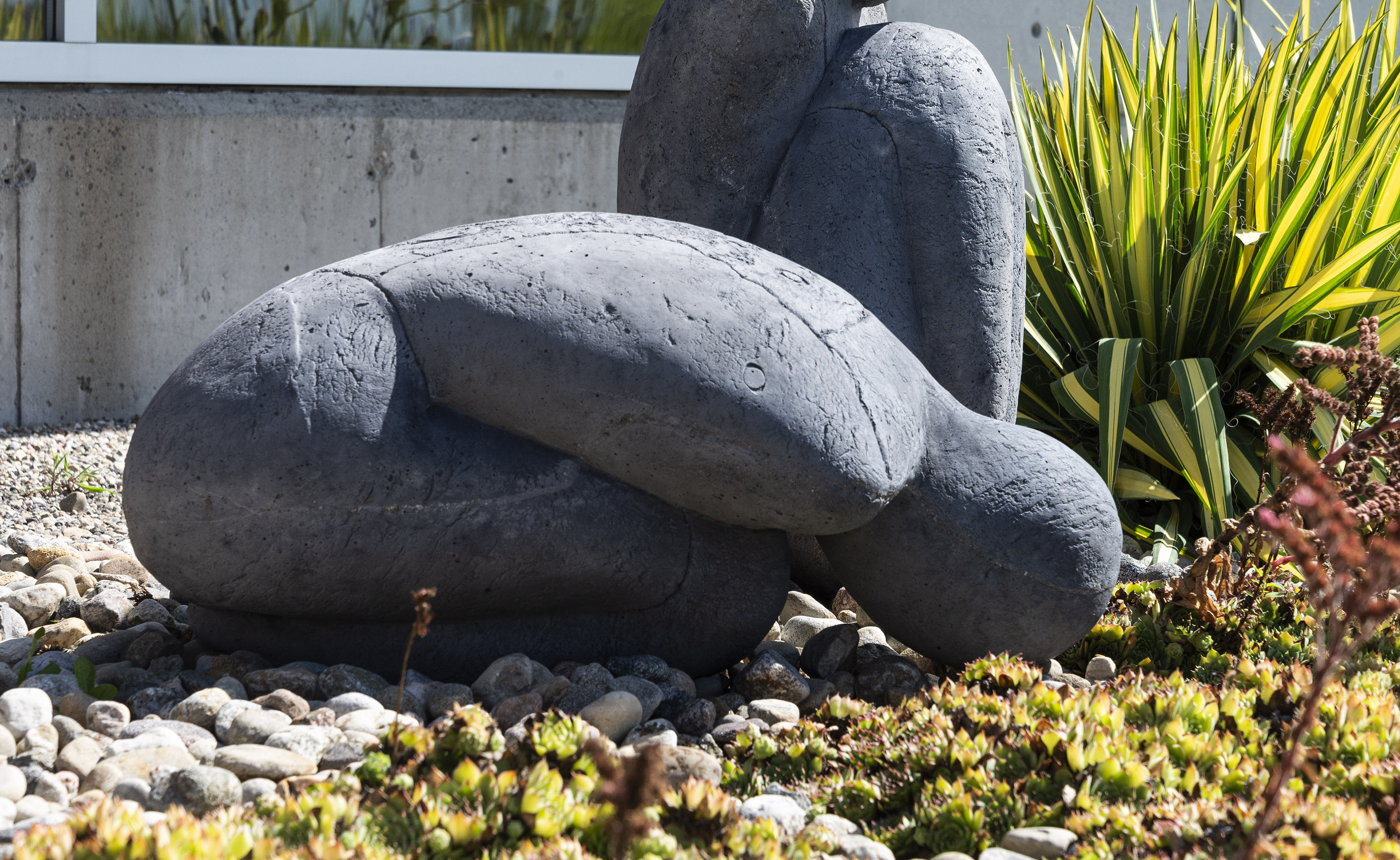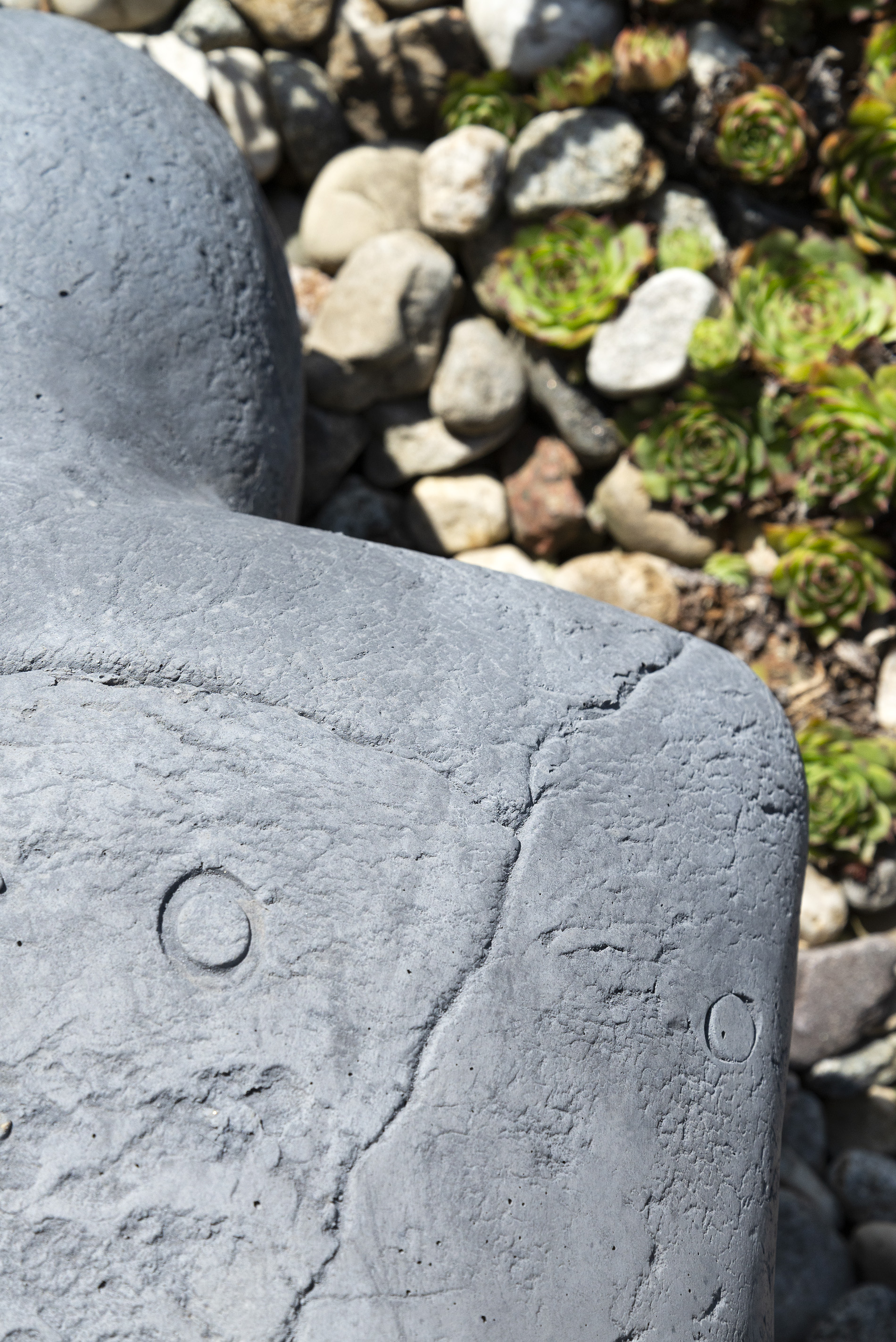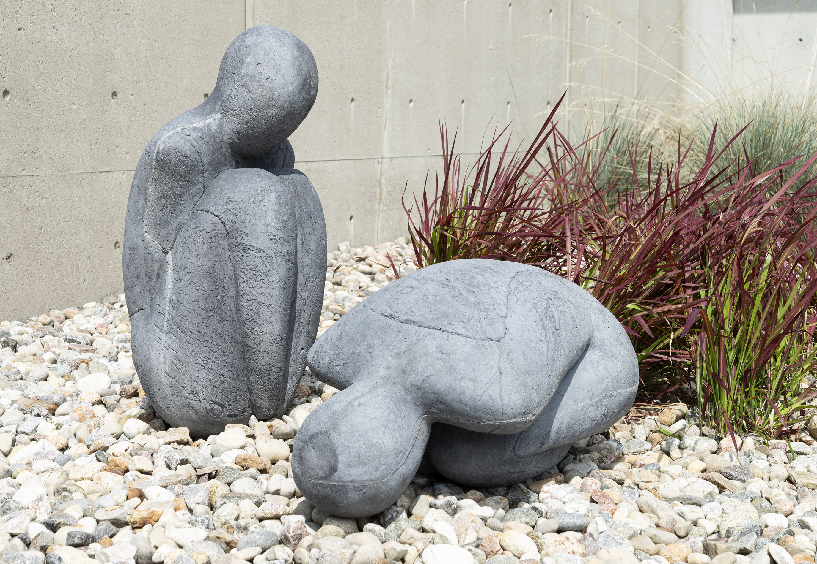 This concrete outdoor sculpture in minimalist form was made by Susan Low-Beer.In this contemplative piece, a single figure is shown kneeling, head down facing the earth. The concrete figure is simple--minimalist in form but the narrative—the human connection to nature is both compelling and profound. This series was originally created as part of a large garden installation in which thirty similar figures—all made from a single mold were grouped together as a powerful statement.
