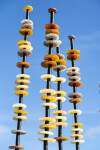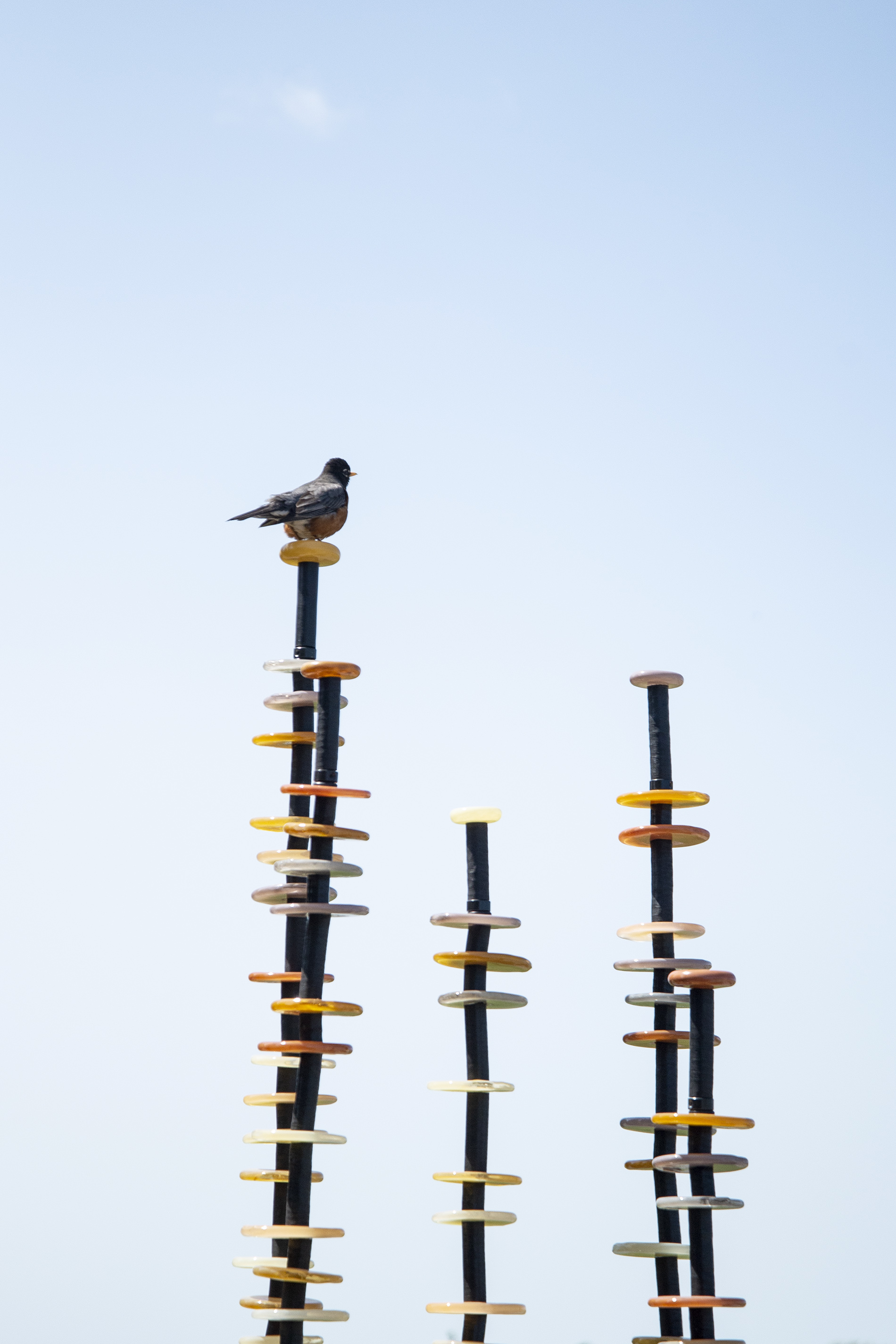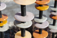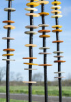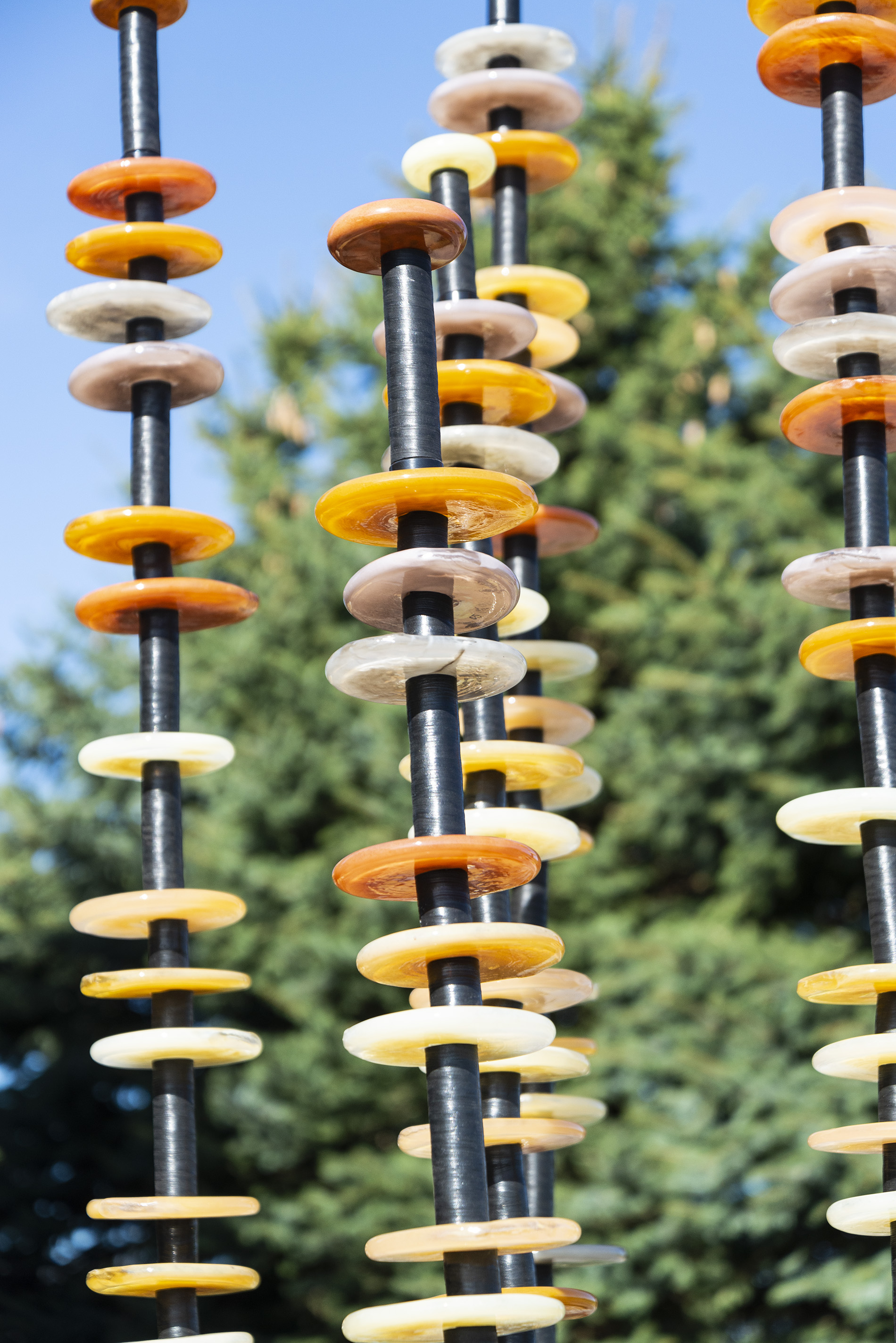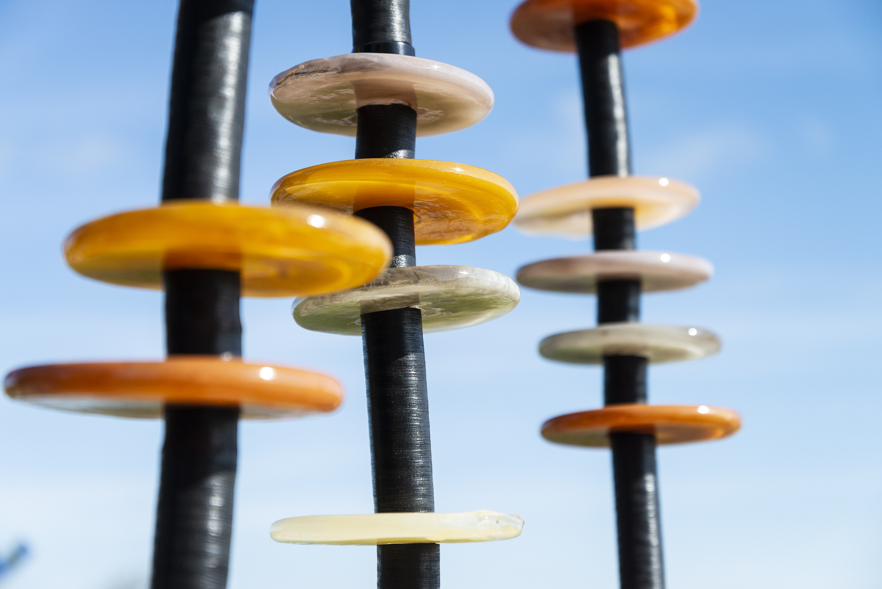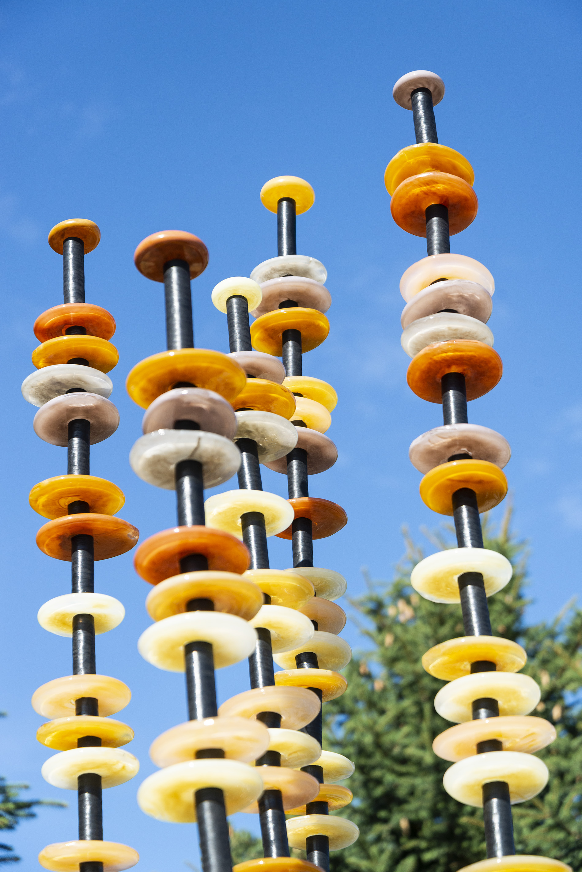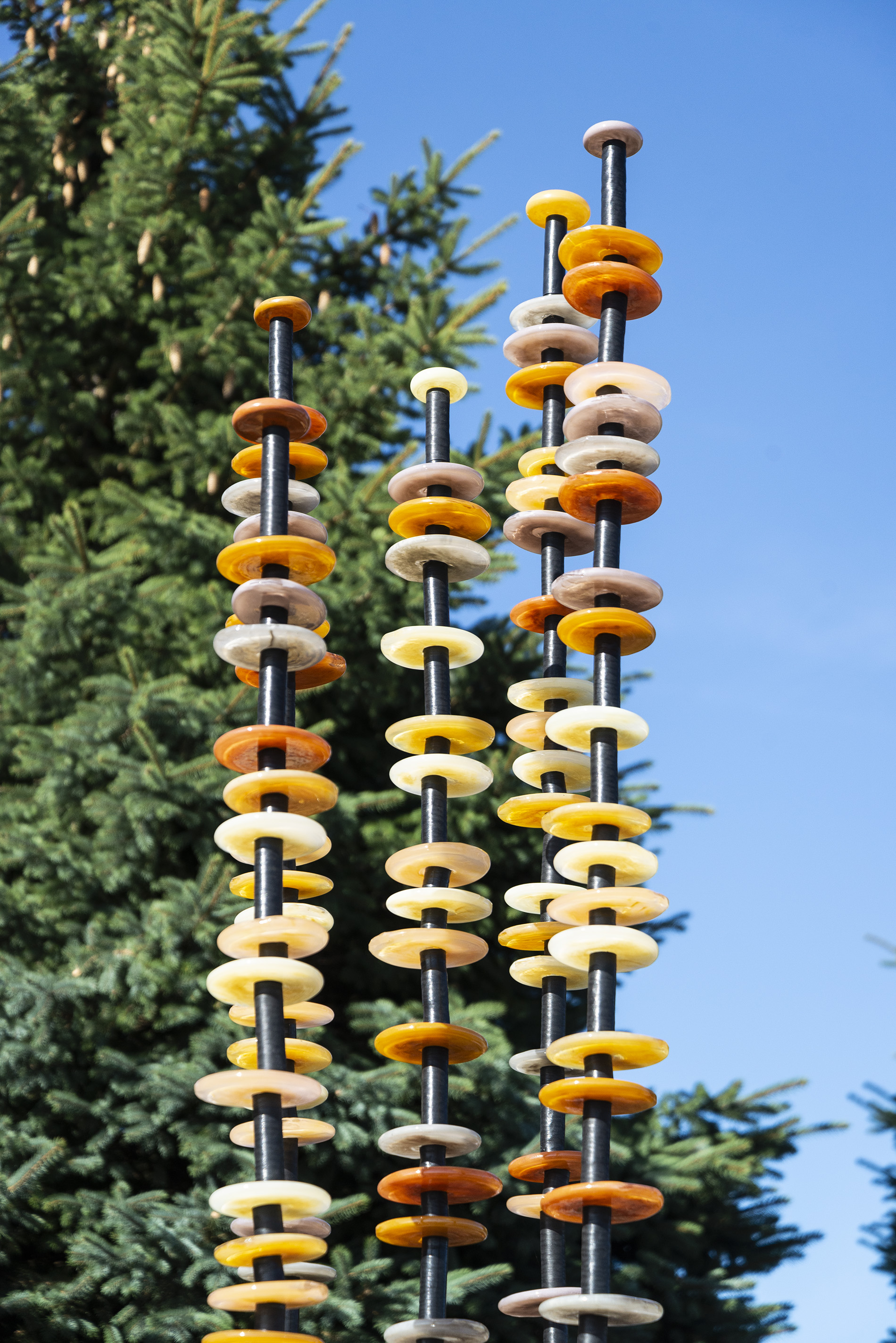 Like flowers in a garden, Susan Rankin’s beautiful glass columns appear to sway in the breeze. An avid gardener, Rankin has created a series of outdoor sculptures inspired by the forms and colours found in nature. These five steel columns feature hand blown glass circular pieces in soft colours from pale yellow to amber stacked organically like flowers on a stem.“Using numerous columns to define a space, I incorporate light through the multiple transparent or opaque glass elements. Drawing on natural and abstracted forms I have created a series of work, which is harmonious and compelling through the seasons.”