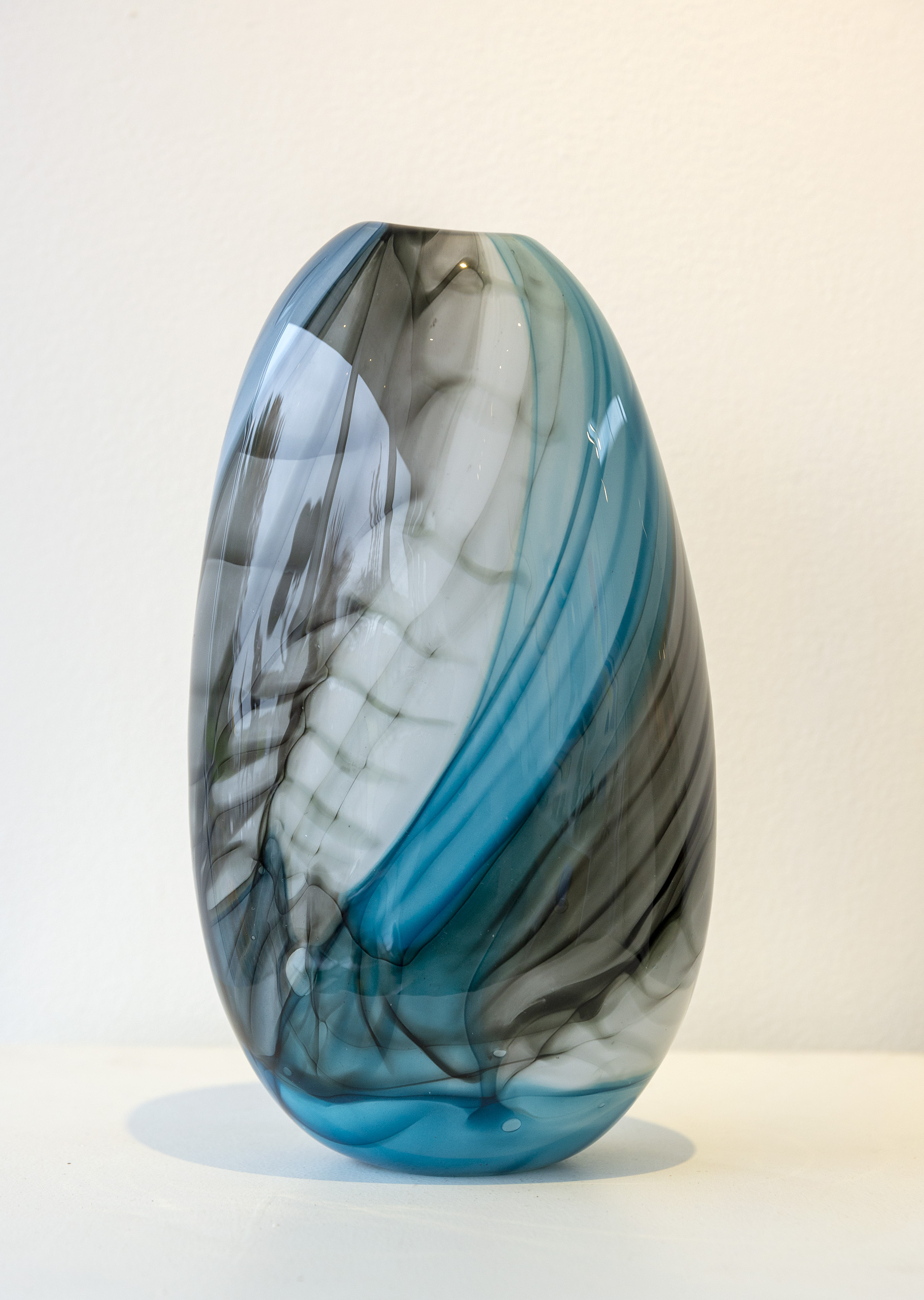 This contemporary aqua and grey coloured glass vessel is by Susan Rankin.The magical optical qualities of glass and light become objects of beauty in the hands of Canadian artist Susan Rankin. Rankin creates contemporary hand-blown glass artwork made from translucent glass that is masterfully manipulated to add distinctive patterns. Here, powder-coated glass bits in aqua and grey hues are layered and thin trails of glass threads add lyrical detail. The form is organic—the finish of each piece is highly polished and naturally reflects light. The vases come in small, medium and tall sizes, which makes for an attractive grouping. Rankin chose the name Ether for the clear, clean air that lives above the clouds.