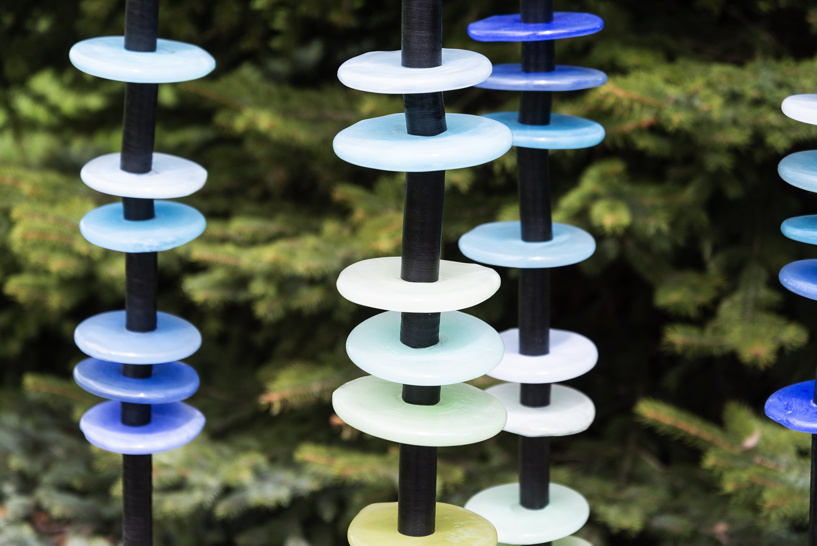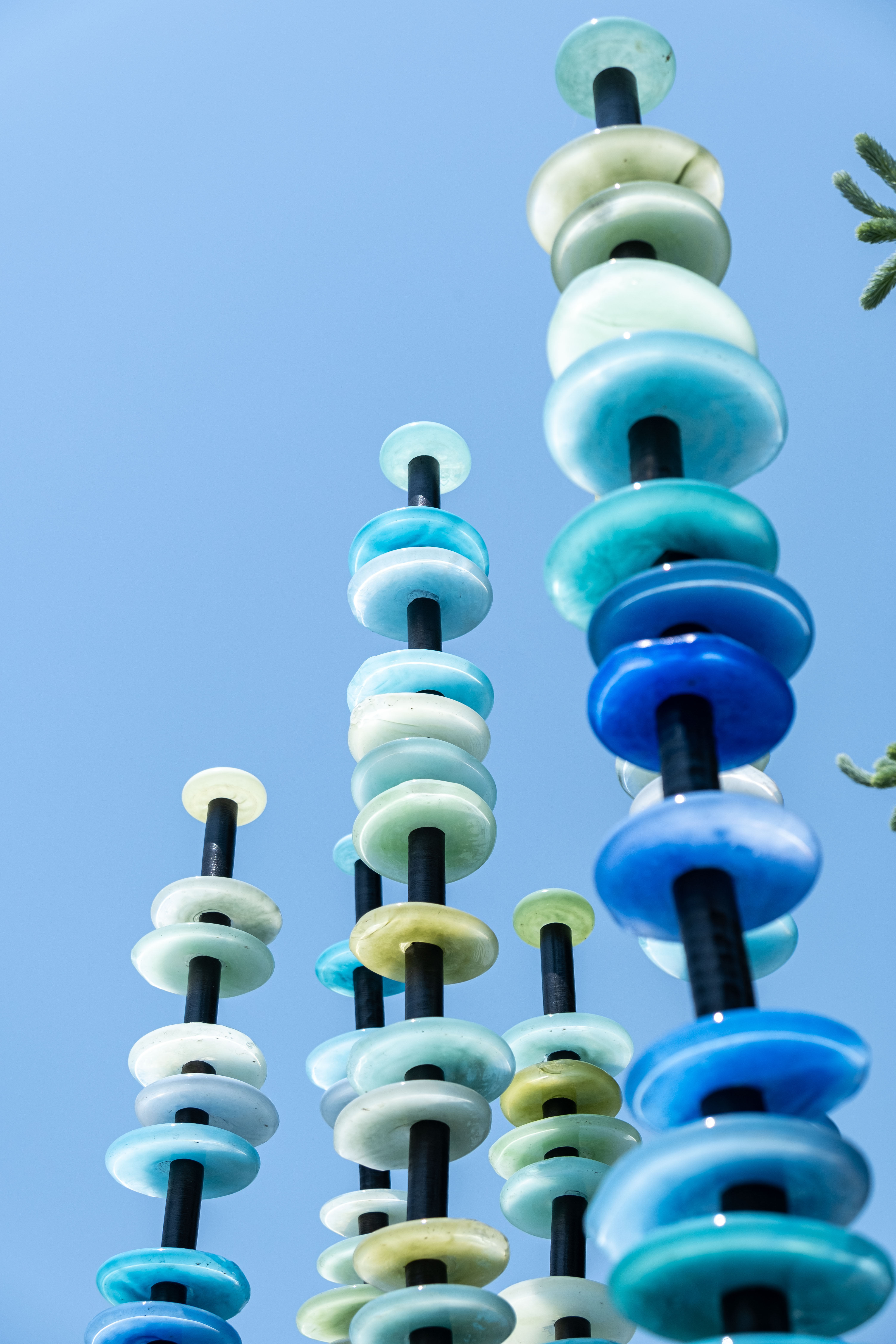 Susan Rankin has captured the luminous colour of water—from pale blue and turquoise to ocean blue in her latest series of garden columns. These hand-blown glass outdoor sculptures are inspired by nature’s palette and form. Each of seven steel columns feature circular glass pieces stacked organically to emulate flowers on a stem. Gorgeous statement grouping.“When I think of gardens, I think of something larger than life. They are a physically manipulated, living space that can not only surround you, but also overpower you.” Susan Rankin