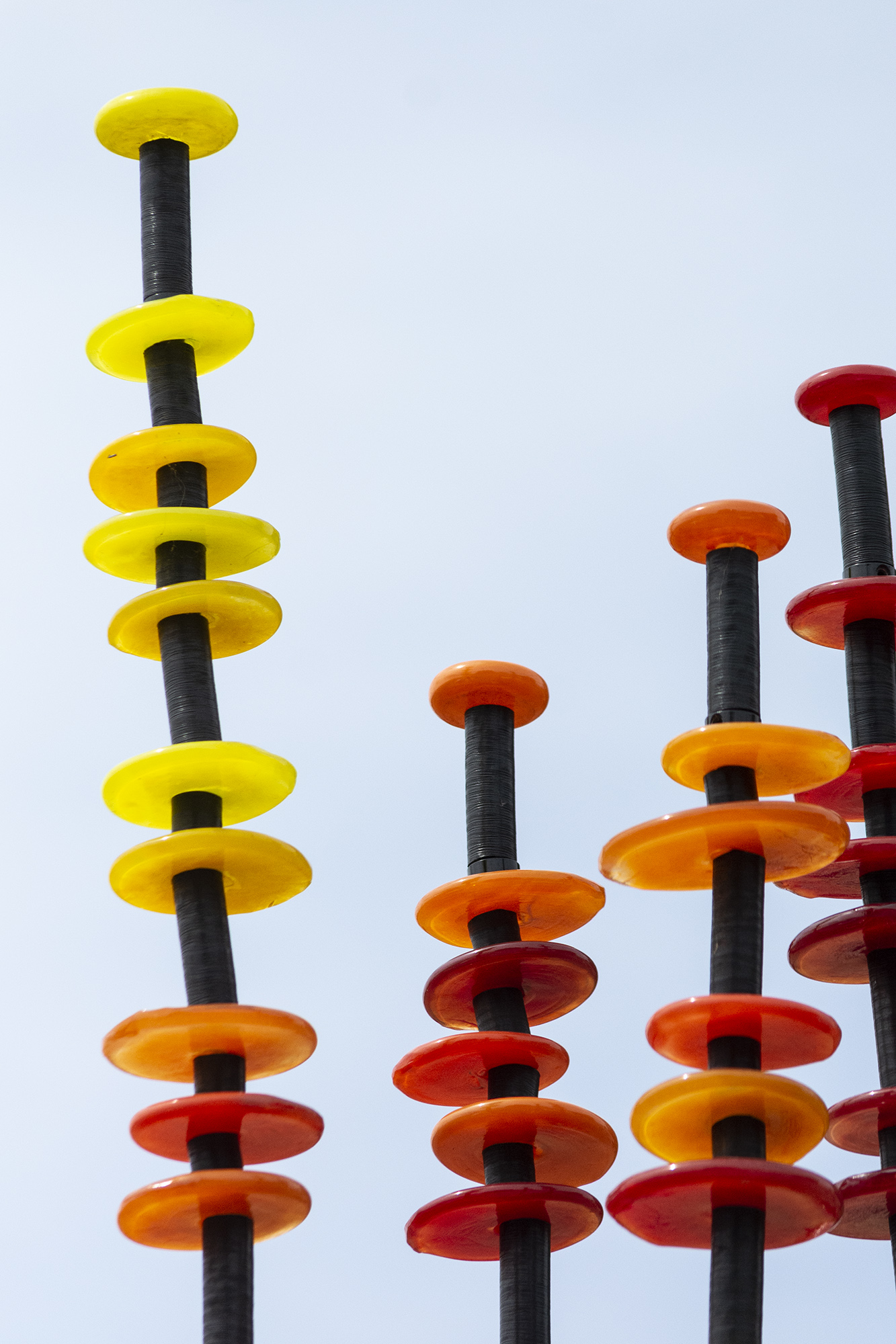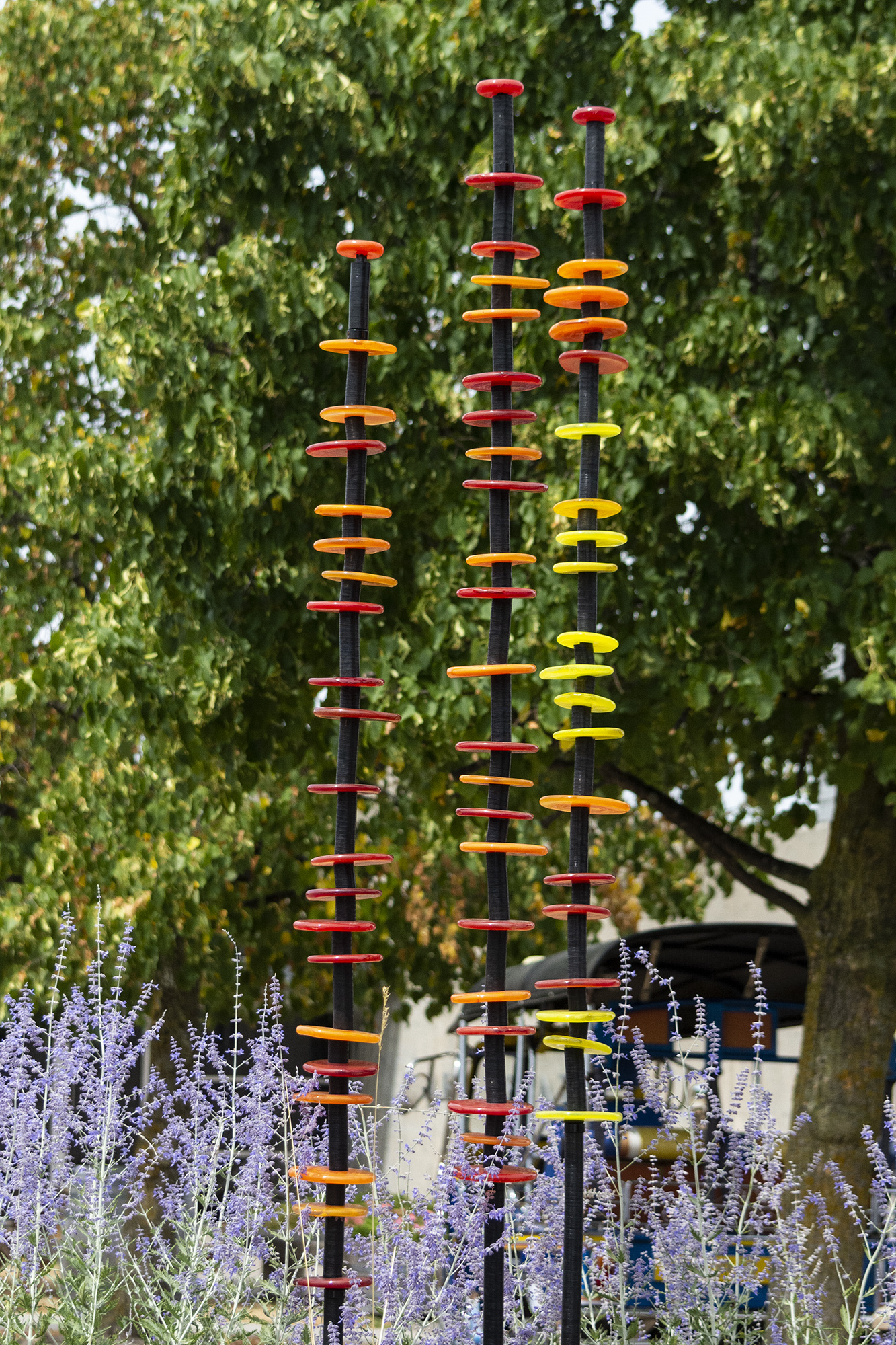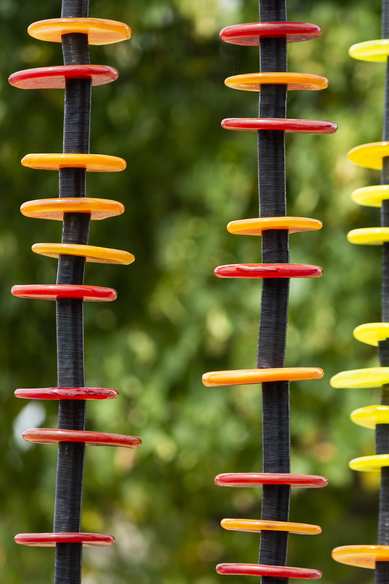 This contemporary glass outdoor sculpture was inspired by nature.The beauty of hand-blown glass rings in red, orange and yellow shines in the sunlight in this delightful outdoor sculpture by Susan Rankin. Like flowers in a garden, the translucent and opaque rings are stacked organically on ten steel ‘stems’—columns that appear to sway gently in the breeze. Rankin’s work in both colour and form is often informed by nature. She has been an avid gardener for more than 25 years.