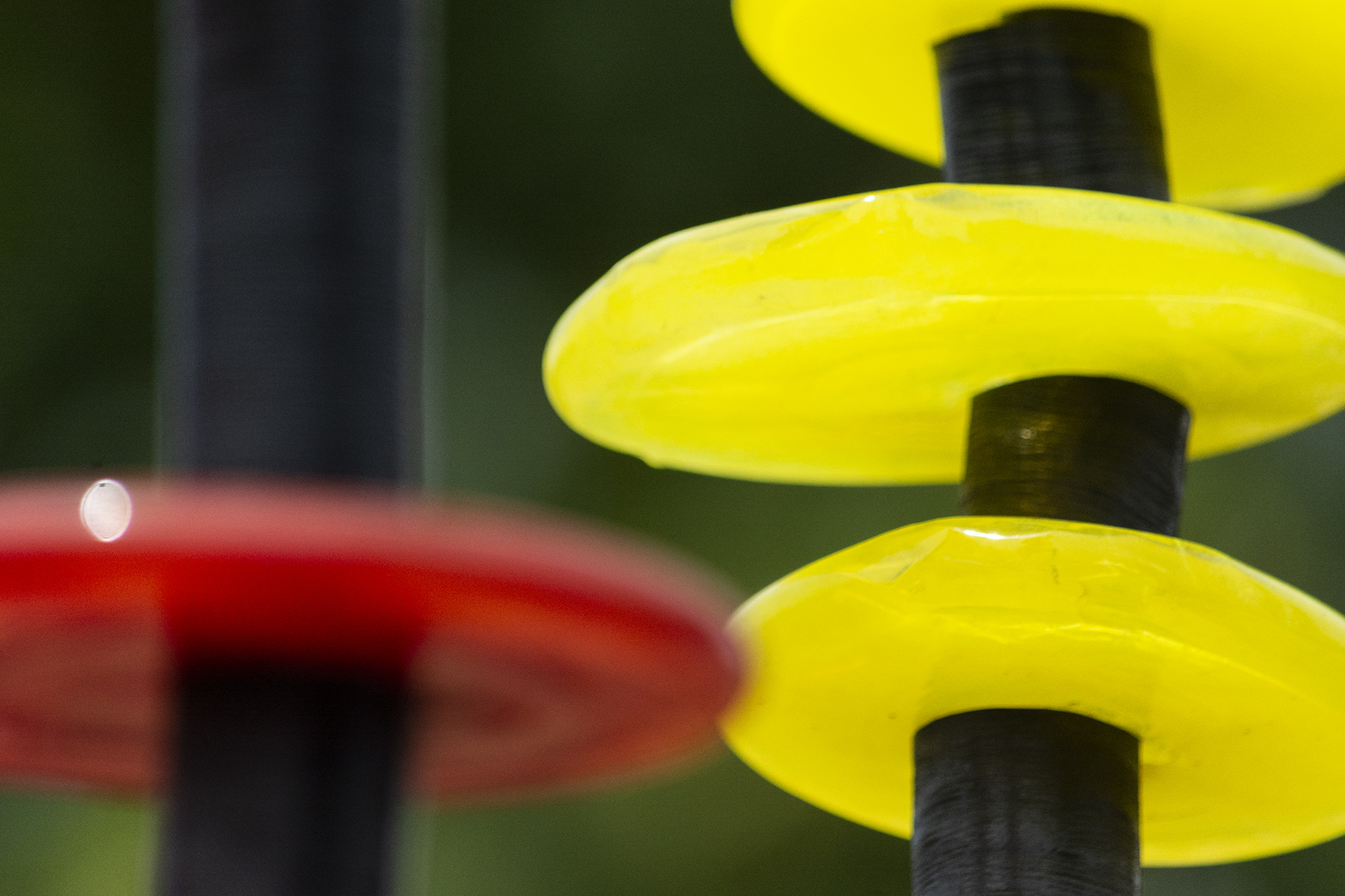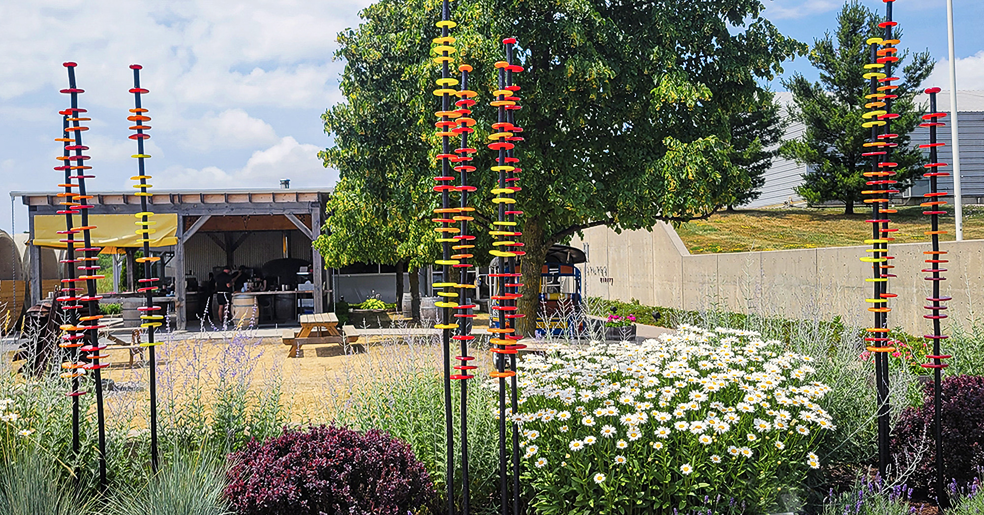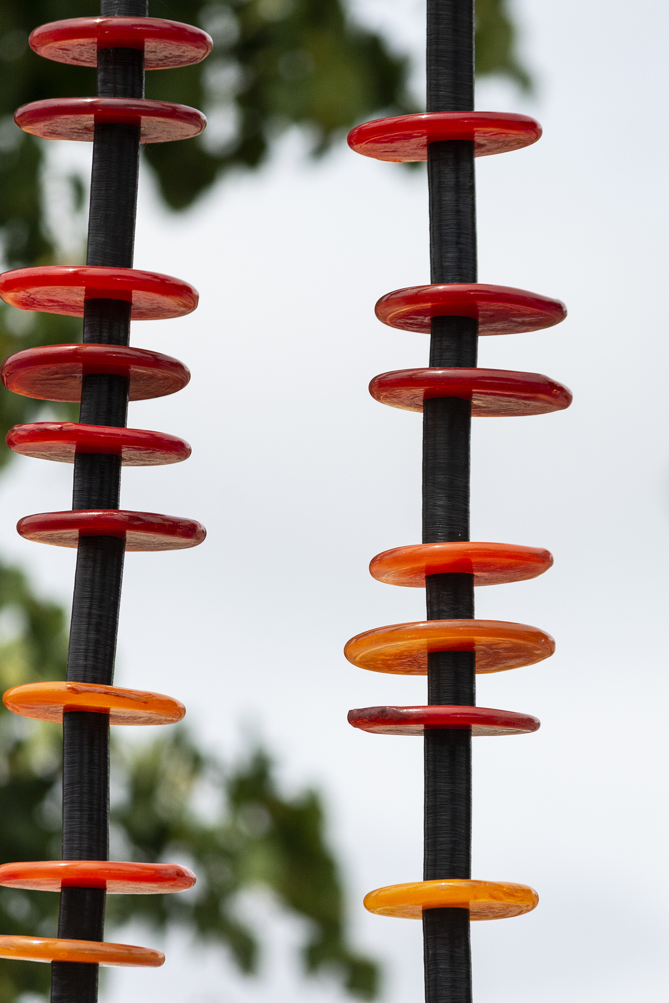 This contemporary glass outdoor sculpture was inspired by nature.The beauty of hand-blown glass rings in red, orange and yellow shines in the sunlight in this delightful outdoor sculpture by Susan Rankin. Like flowers in a garden, the translucent and opaque rings are stacked organically on ten steel ‘stems’—columns that appear to sway gently in the breeze. Rankin’s work in both colour and form is often informed by nature. She has been an avid gardener for more than 25 years.