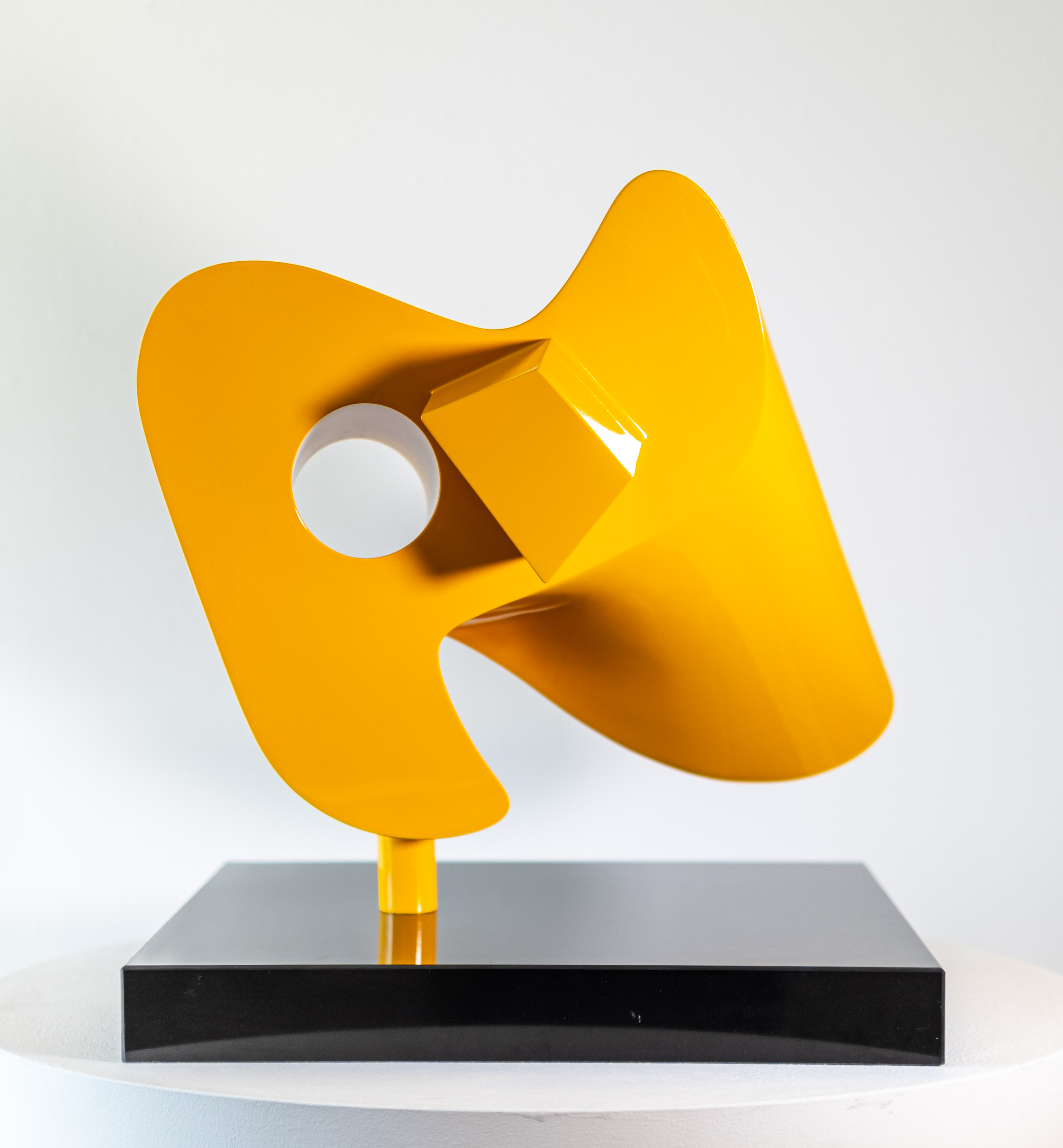 This striking table top sculpture is forged from stainless steel and coated in a glossy bright yellow. Its fluid, dynamic form—geometric and abstraction in play is enhanced by the bright palette. Mitic has garnered an international reputation for his provocative and imaginative contemporary artwork, including sculptures and paintings. Many of his sculptures are named for stars, constellations and galaxies. Astra is Latin for stars. The base is a sleek, highly polished black granite.